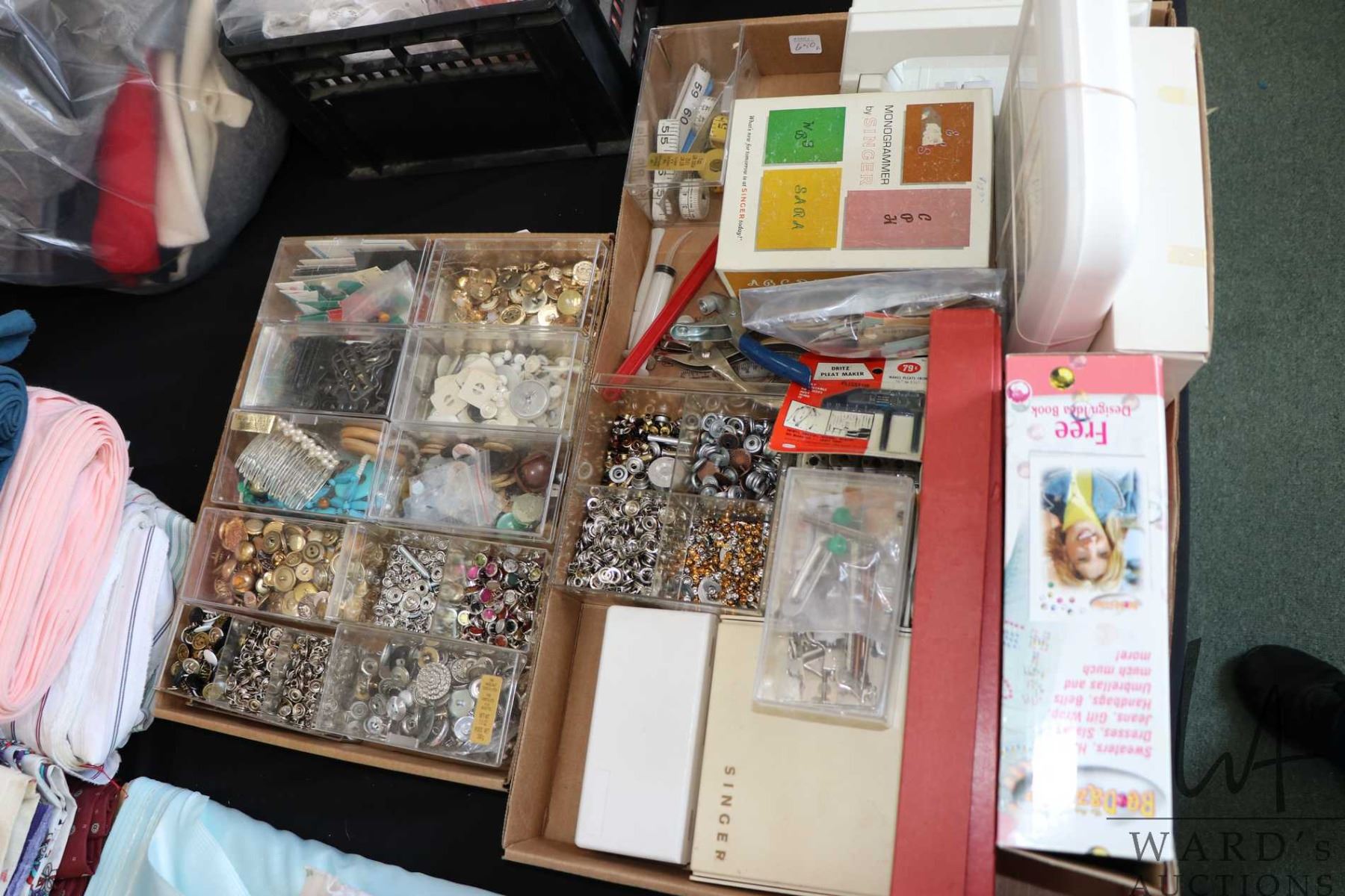 Two large trays of fasteners, gromets, buttons, beads, sewing machine accessories, Singer Monogramer, bedazzlers etc.