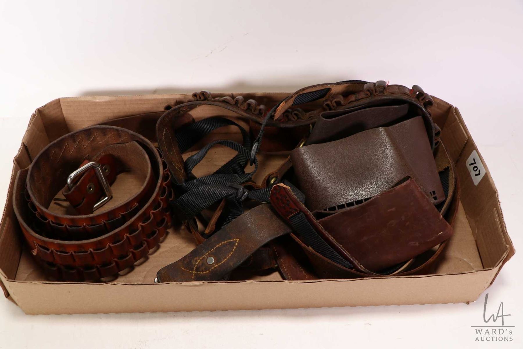 Two leather belts and two gun slings and four rubber butt stock caps.