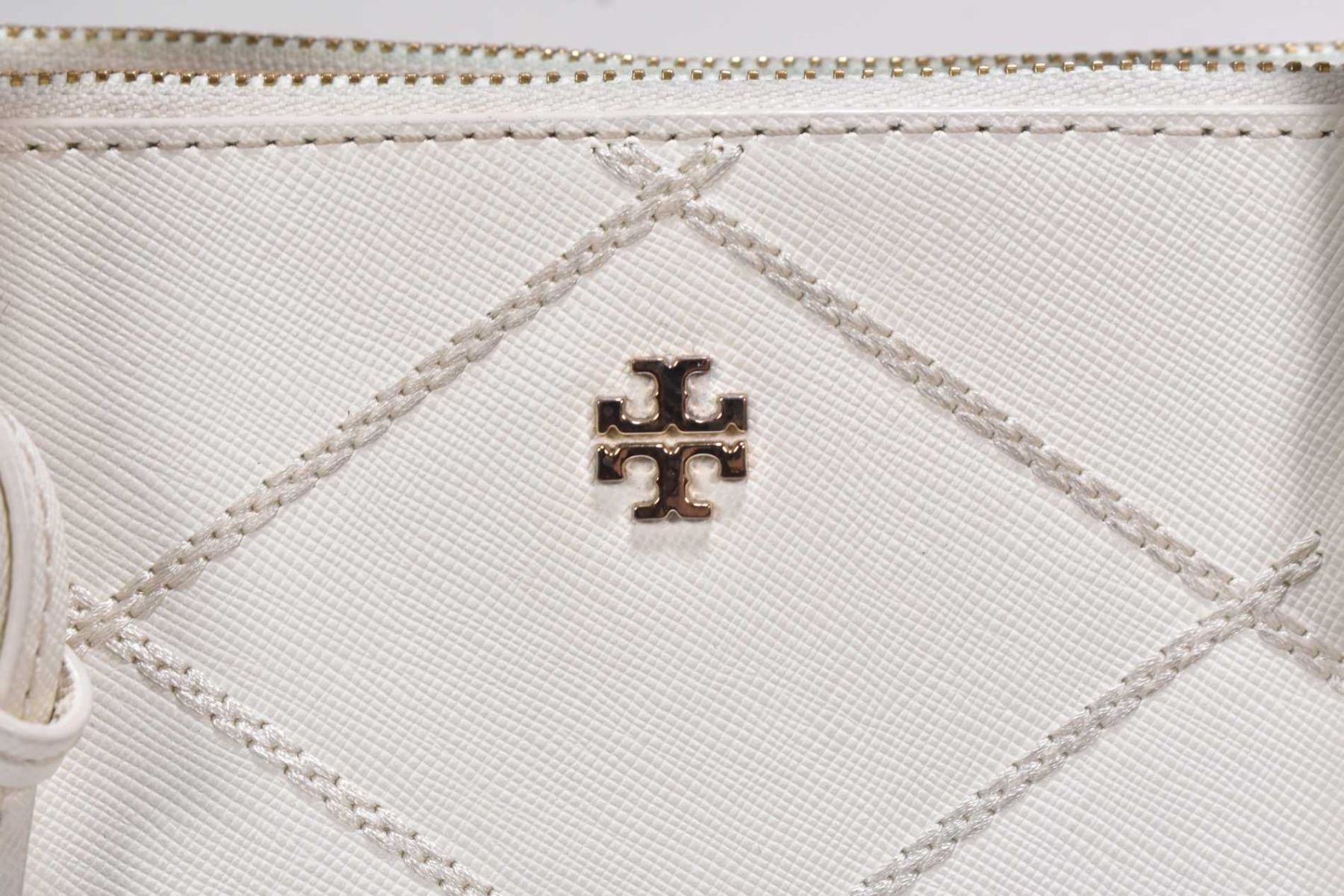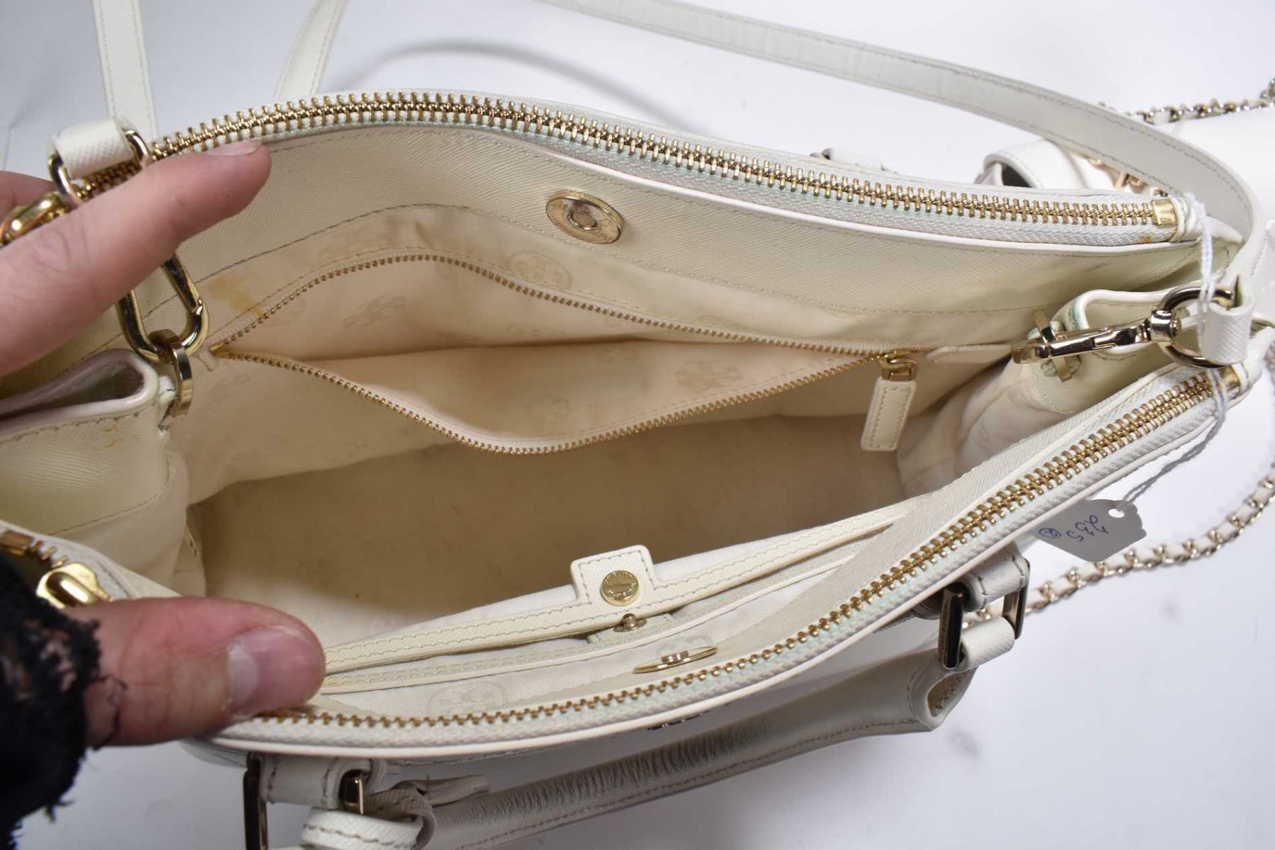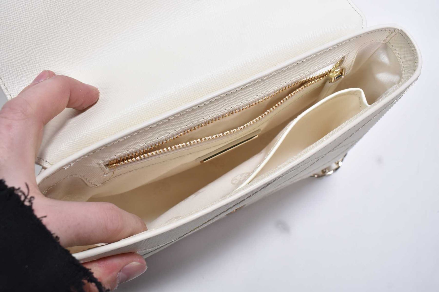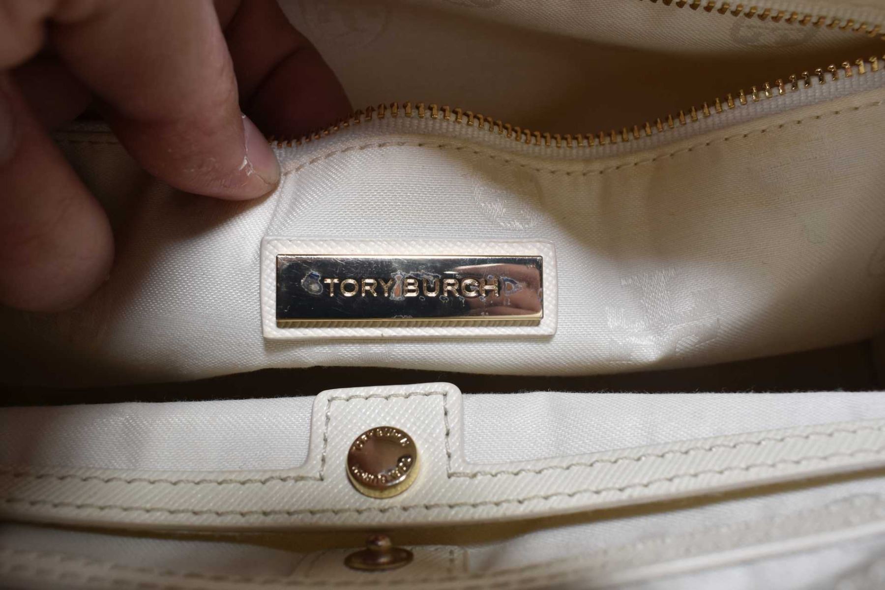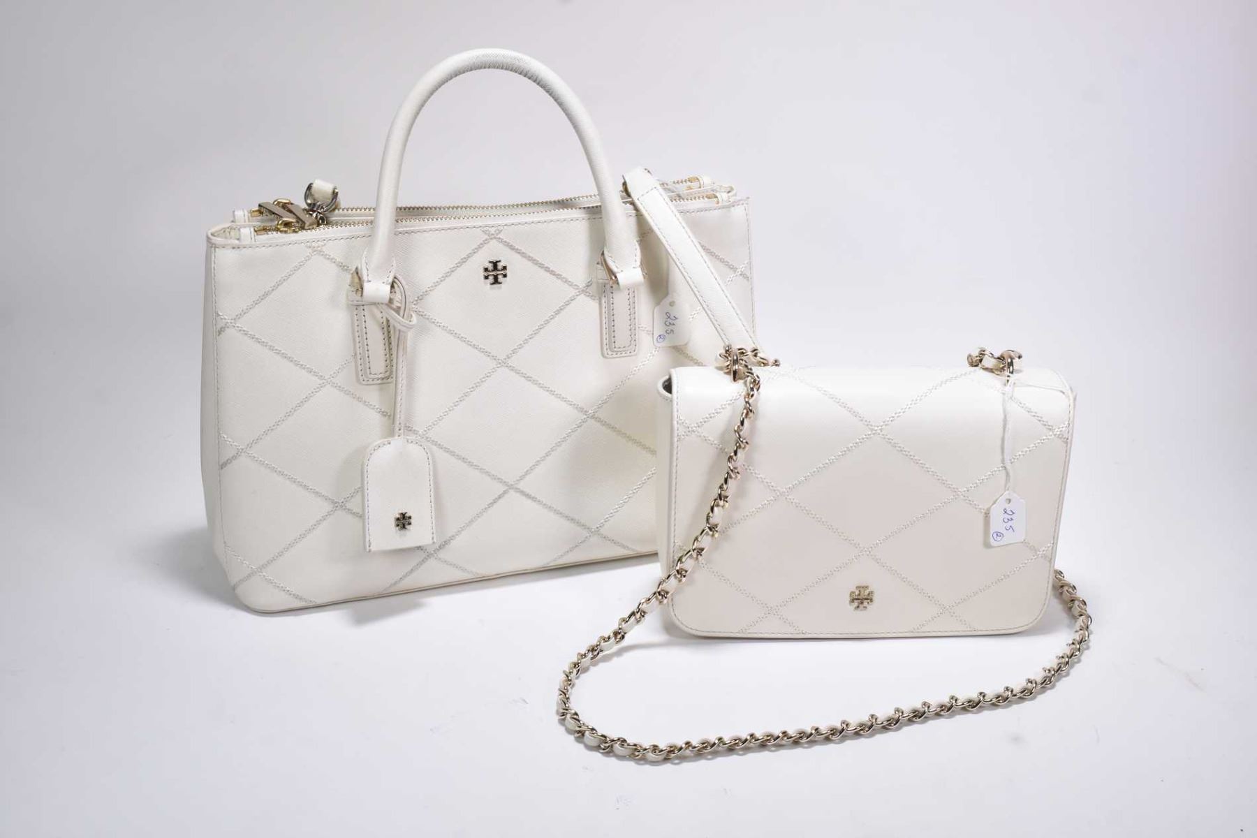 Two matching cream coloured vintage Tori Burch purses including cross body with chain strap and a handbag with removable shoulder strap