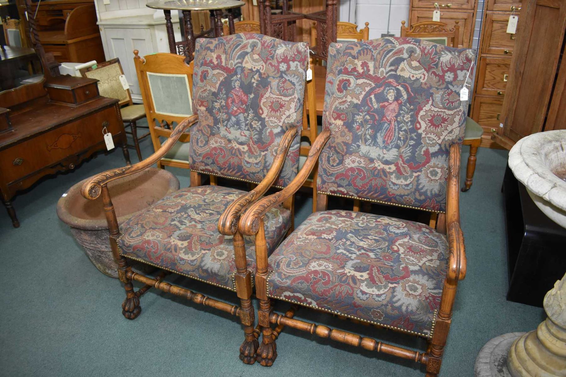 Two matching open arm William & Mary style parlour chairs with tapestry upholstery, one with male cameo and one with female and both with paw feet