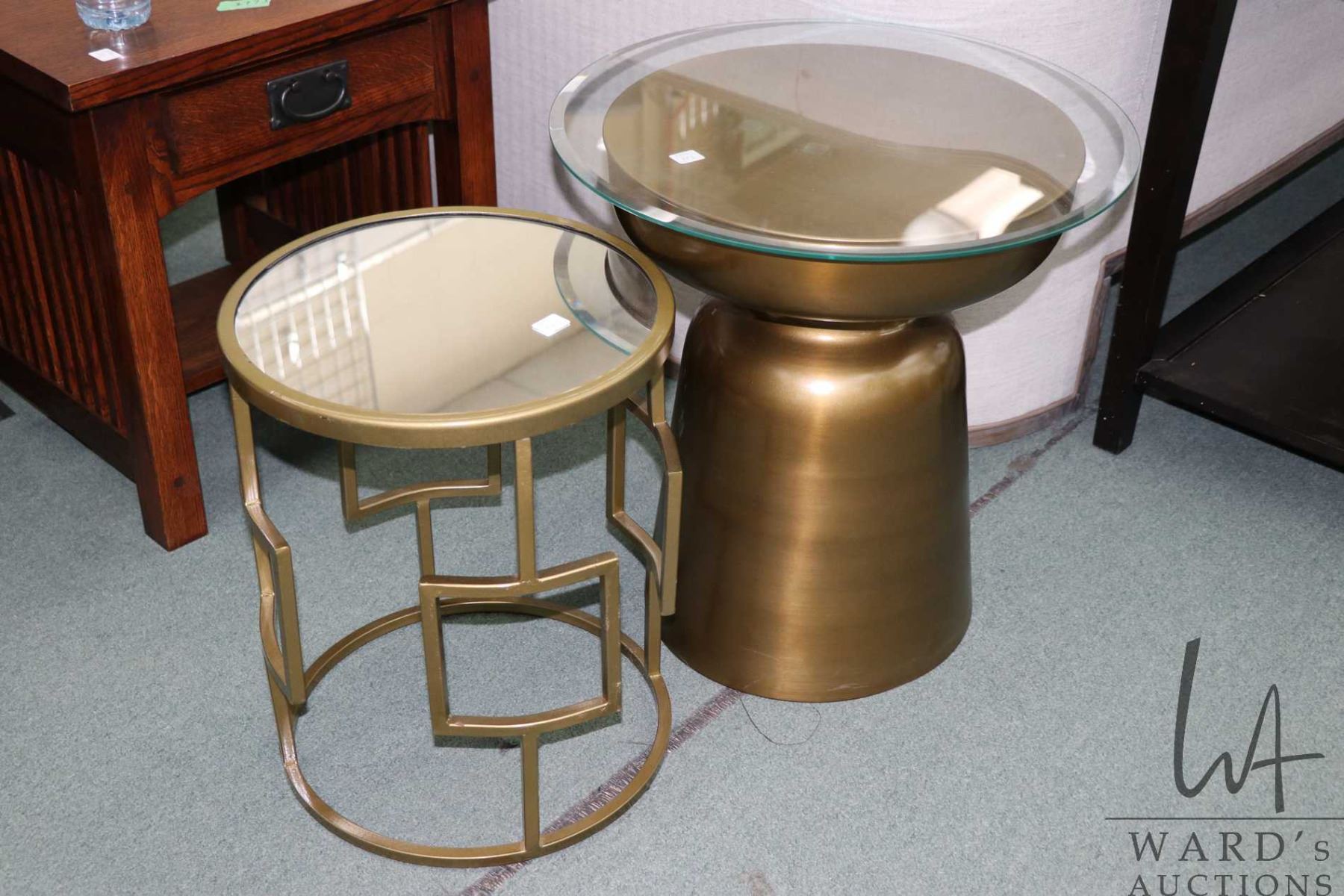 Two modern round side tables, one with burnished gold metal frame 17" H X 14" D and one with beveled glass top 20" H X 20" D