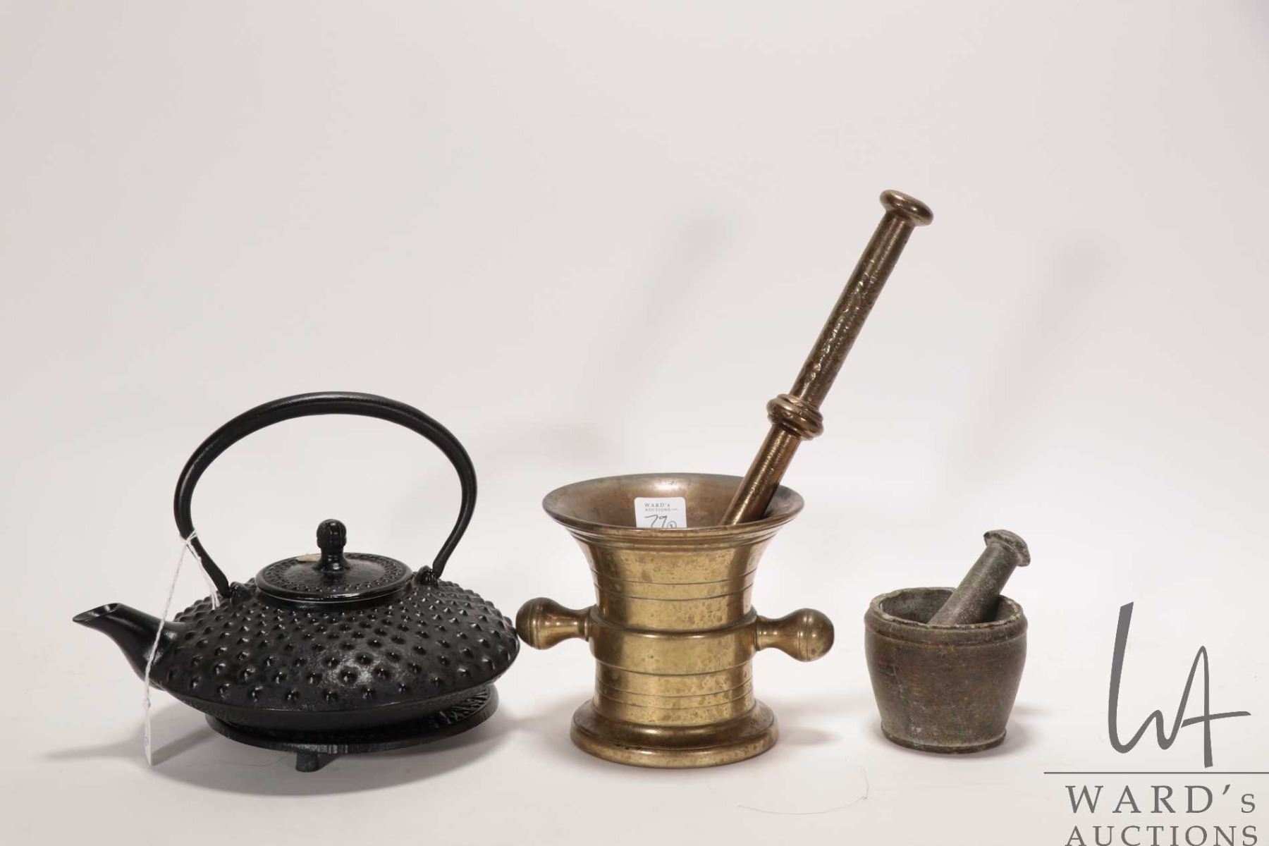 Two mortar and pestle sets including one stone and one brass plus a cast iron Oriental teapot with strainer and trivet