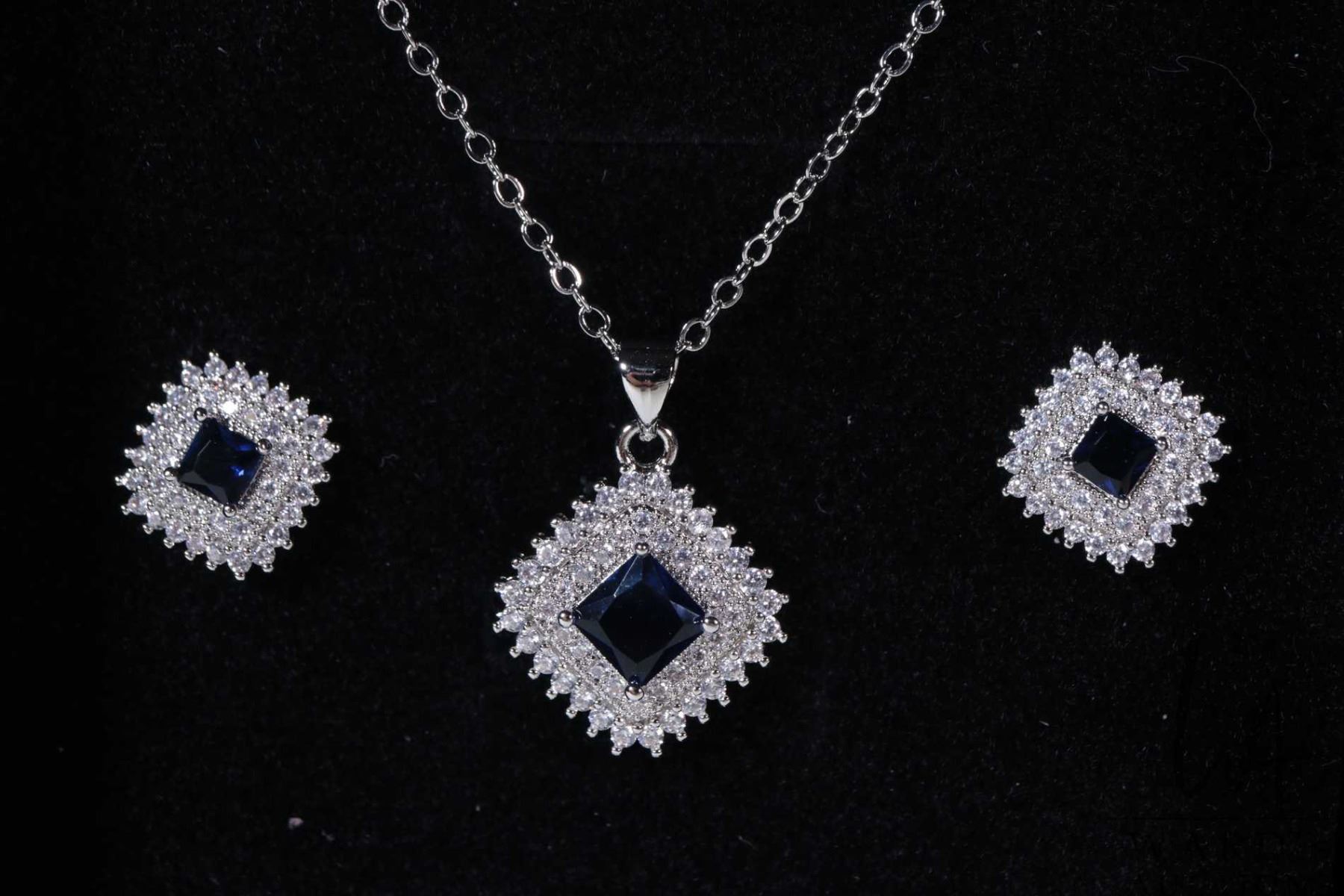 Two new in box jewellery sets including platinum plated blue sapphire halo pendant on 18" neck chain with matching stud earrings and a platinum plated princess cut tennis bracelet, adjustable 7"-8"