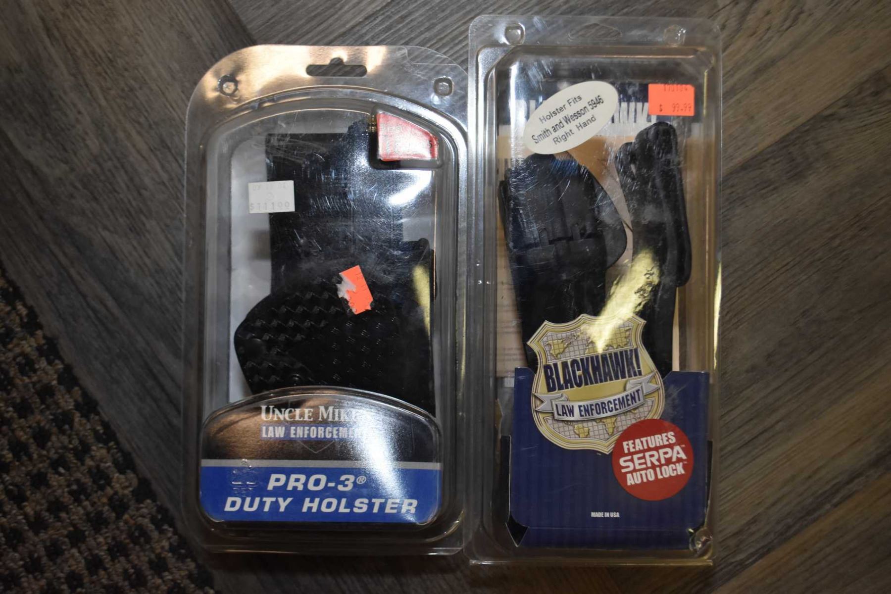 Two new in package right hand holsters including Uncle Mikes size 18, 3518-5 and a BlackHawk Smith & Wesson 5946