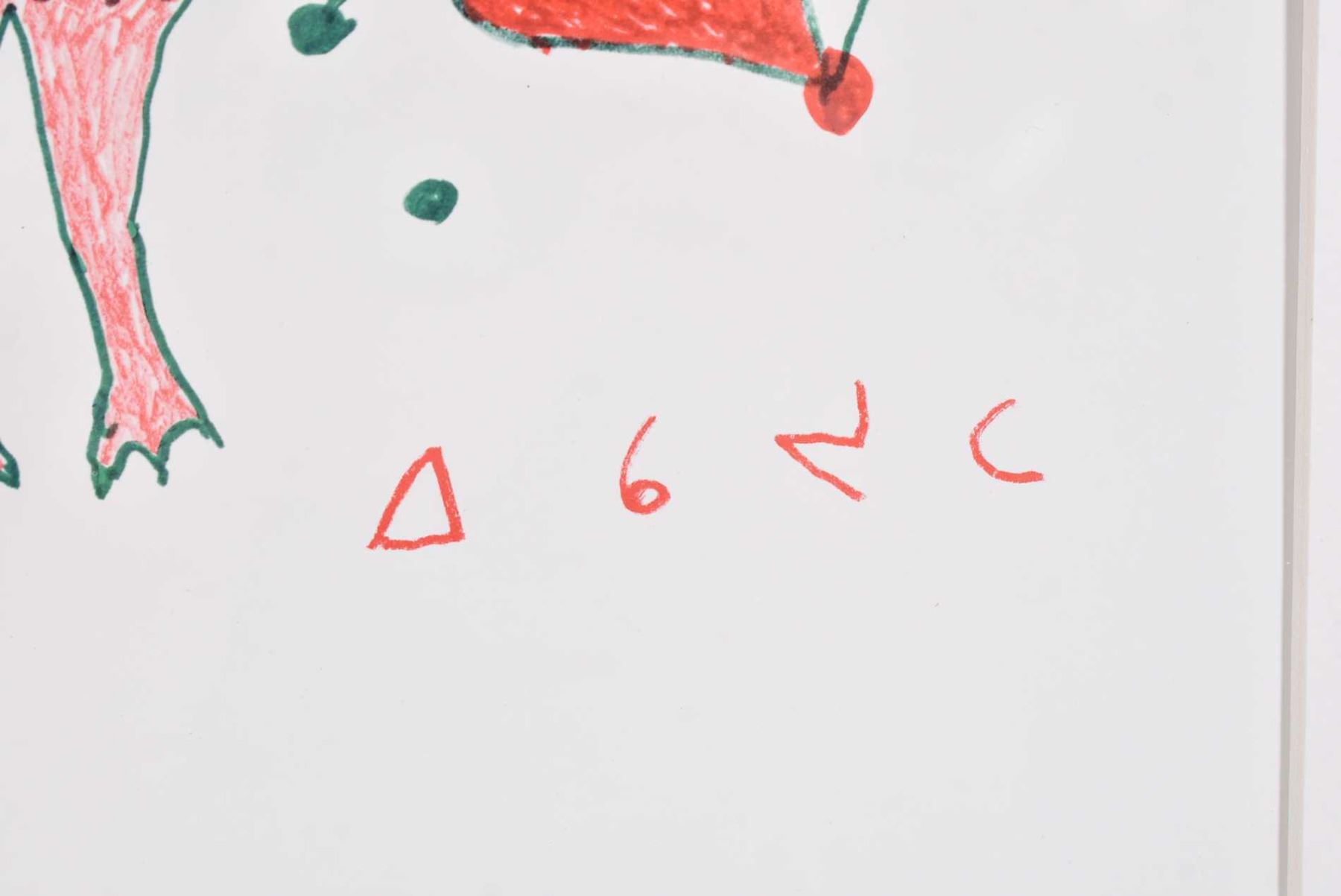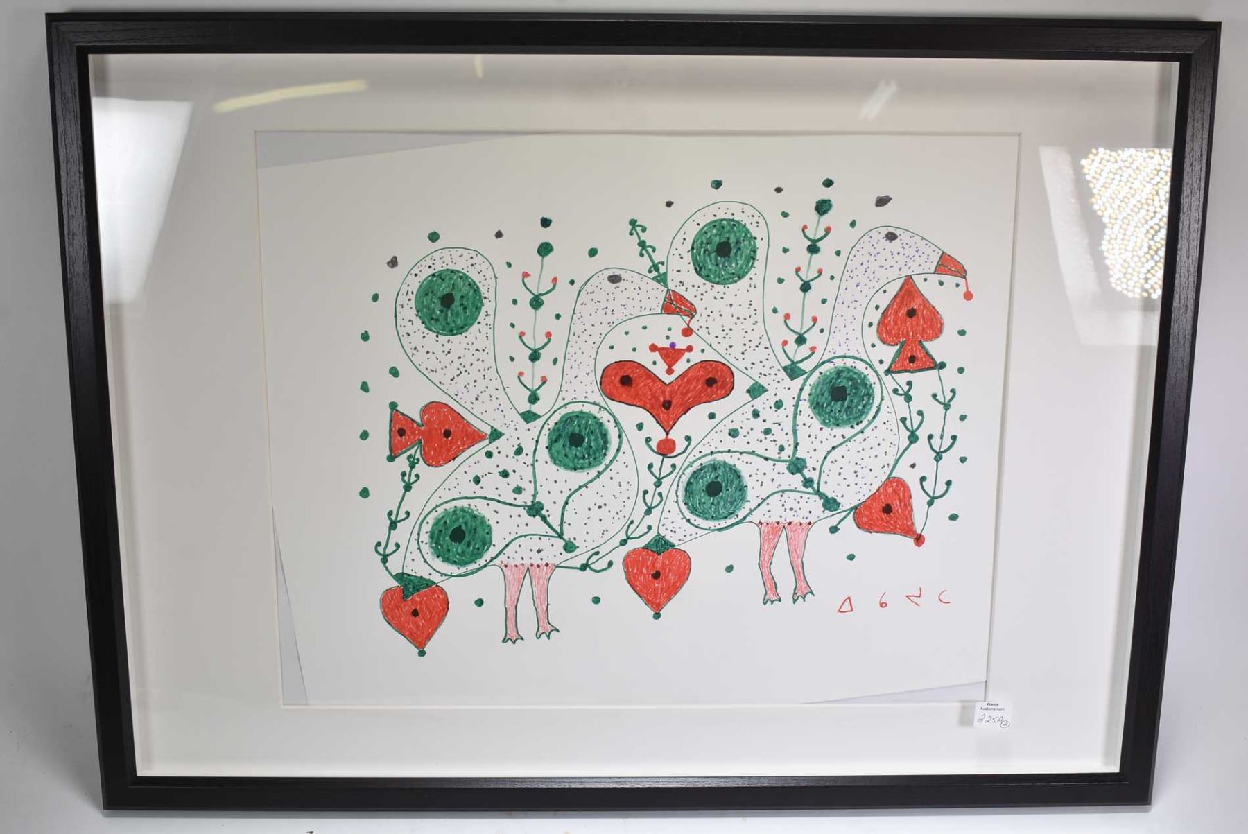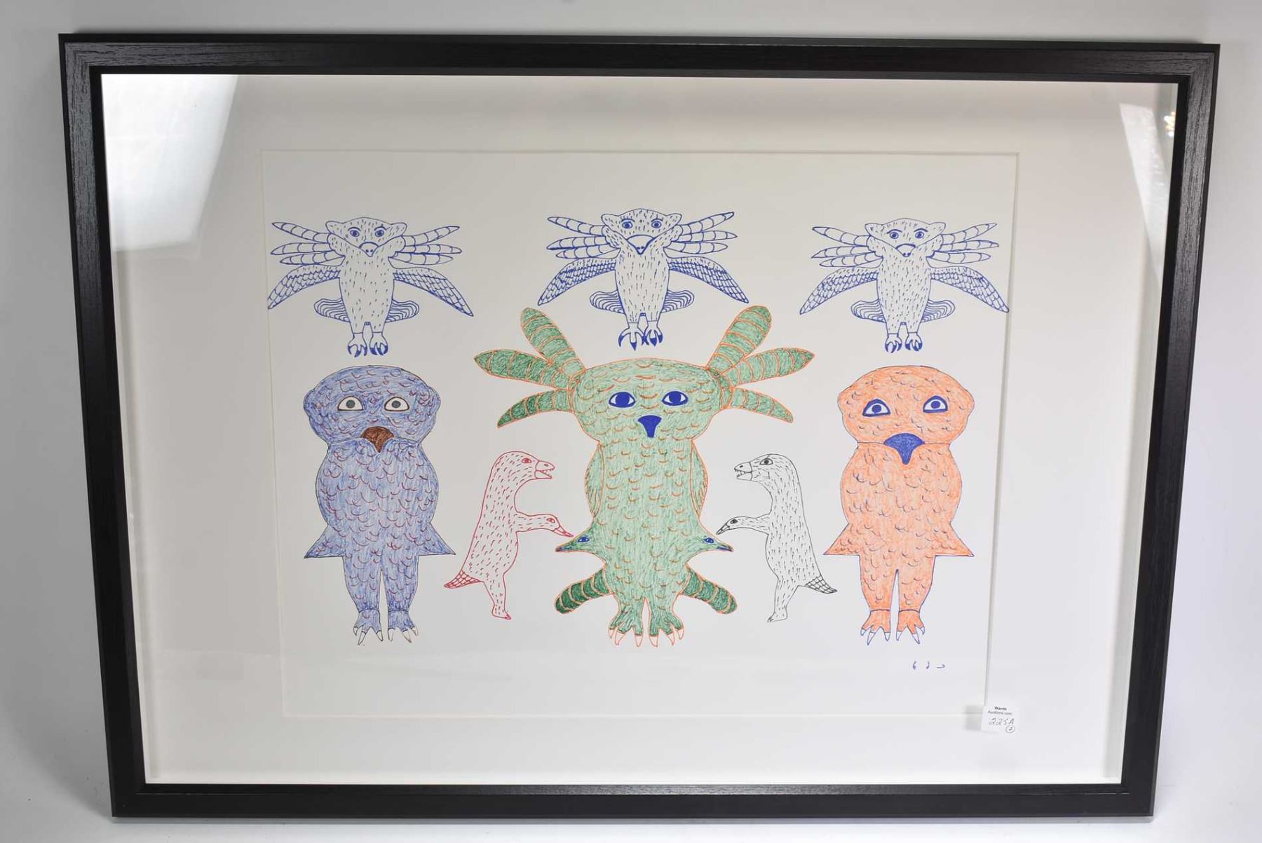Two original coloured pen and pencil drawings including two stylized birds signed in syllabic ( Ikajuta) and a collection of animal figures also signed in syllabic (Kakulu) each measuring 16" X 20"