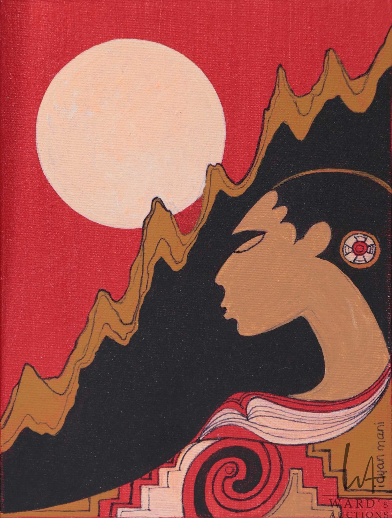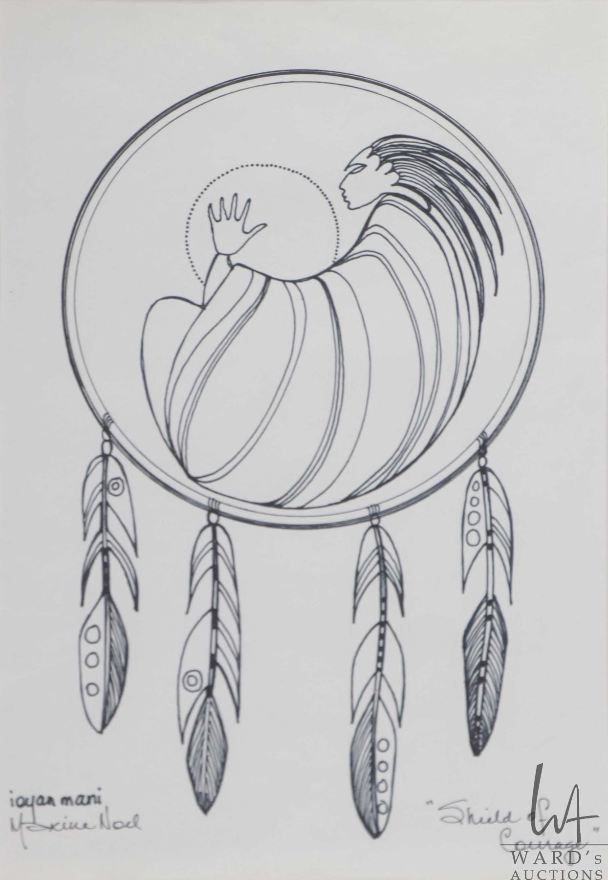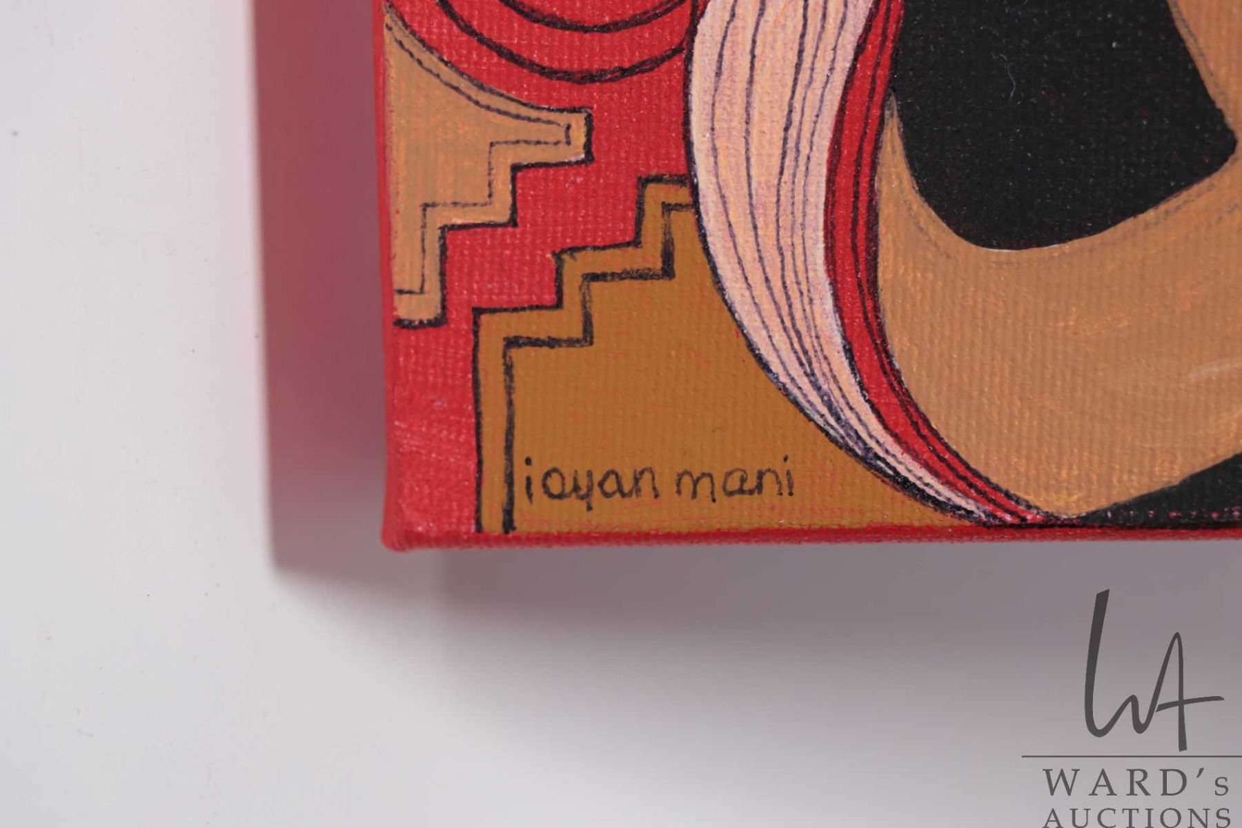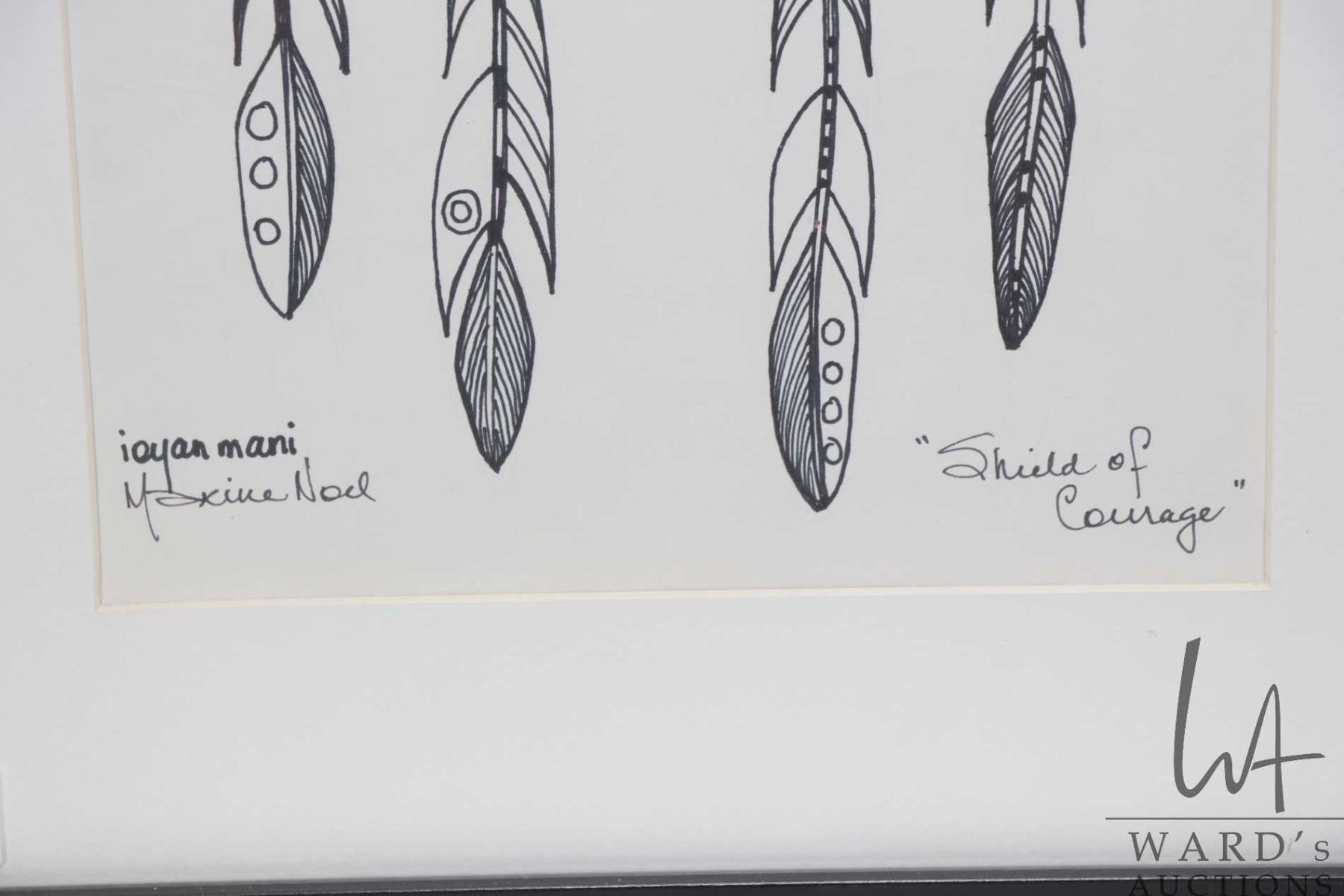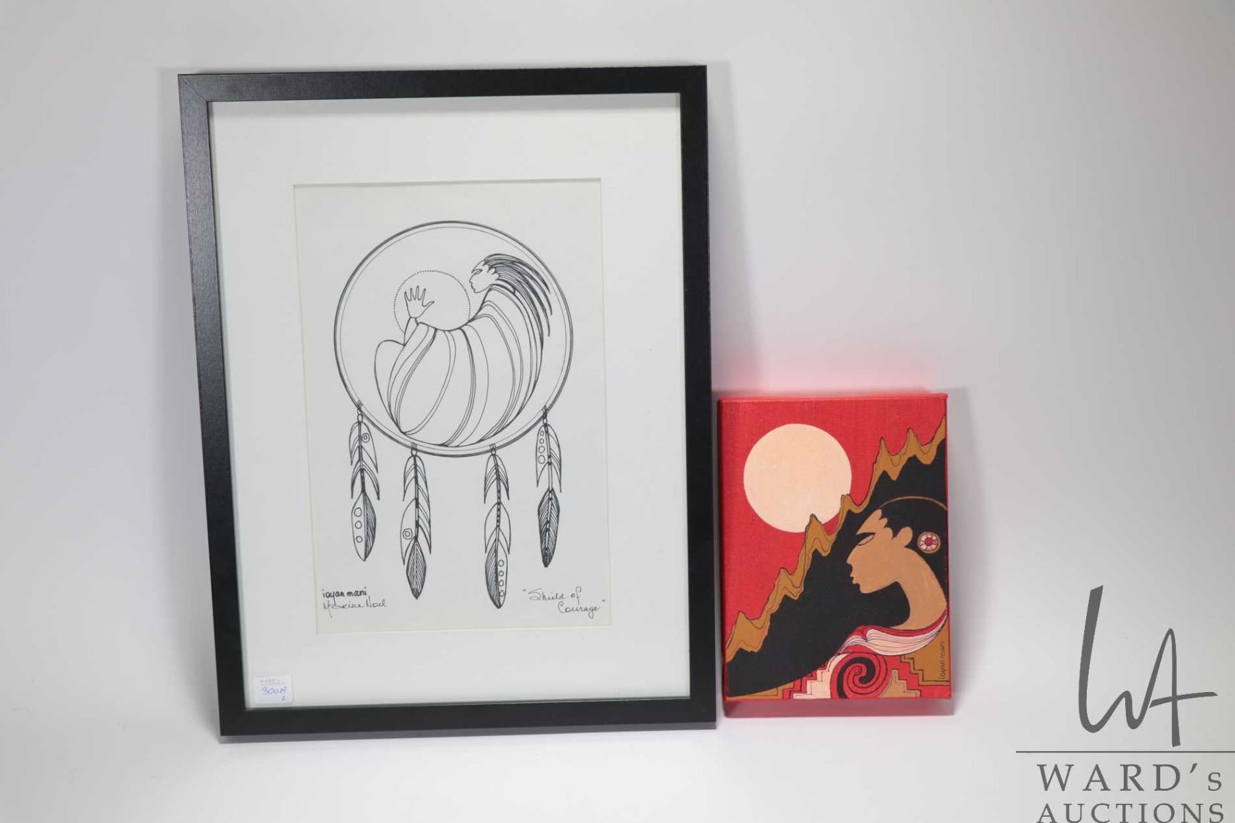 Two original pieces of art including ink pen drawing titled "Shield of Courage" 12" X 8" and a stretcher framed acrylic on canvas, 8" X 6" both signed by artist Ioyan Mani,