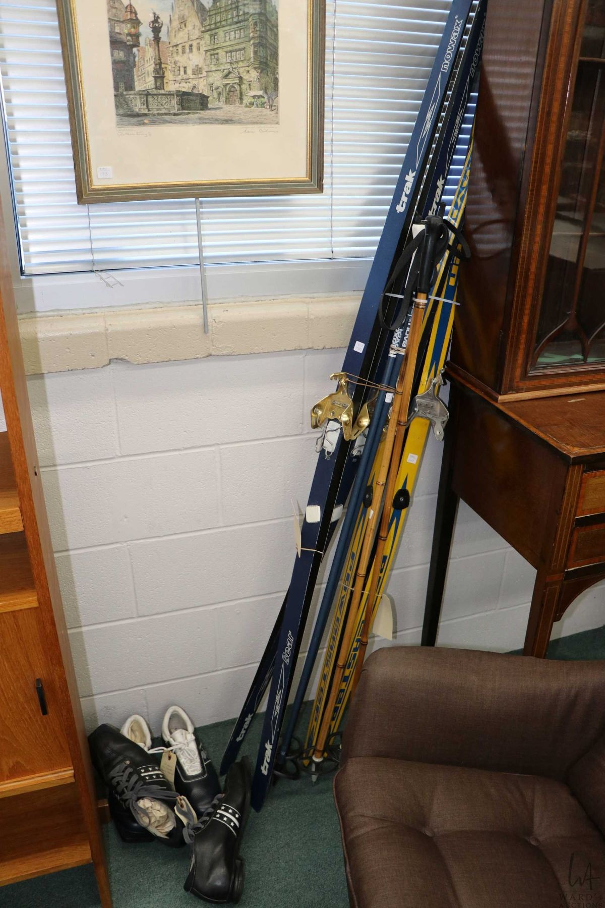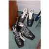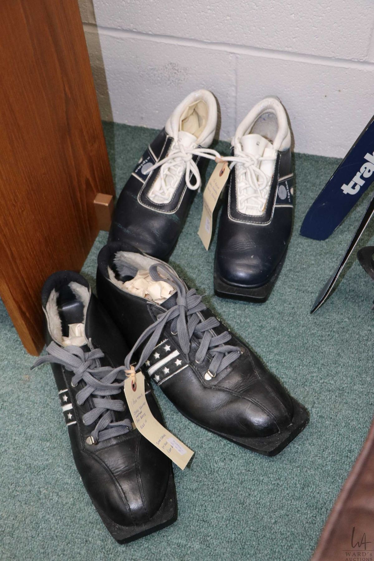 Two pairs of cross country skis including Nowax Trak no. 205 with poles and Powerstep Jarvinen no. 185-58878 with bamboo poles and two pairs of ski boots including men's size 14 with cracked soles and ladies size European 42