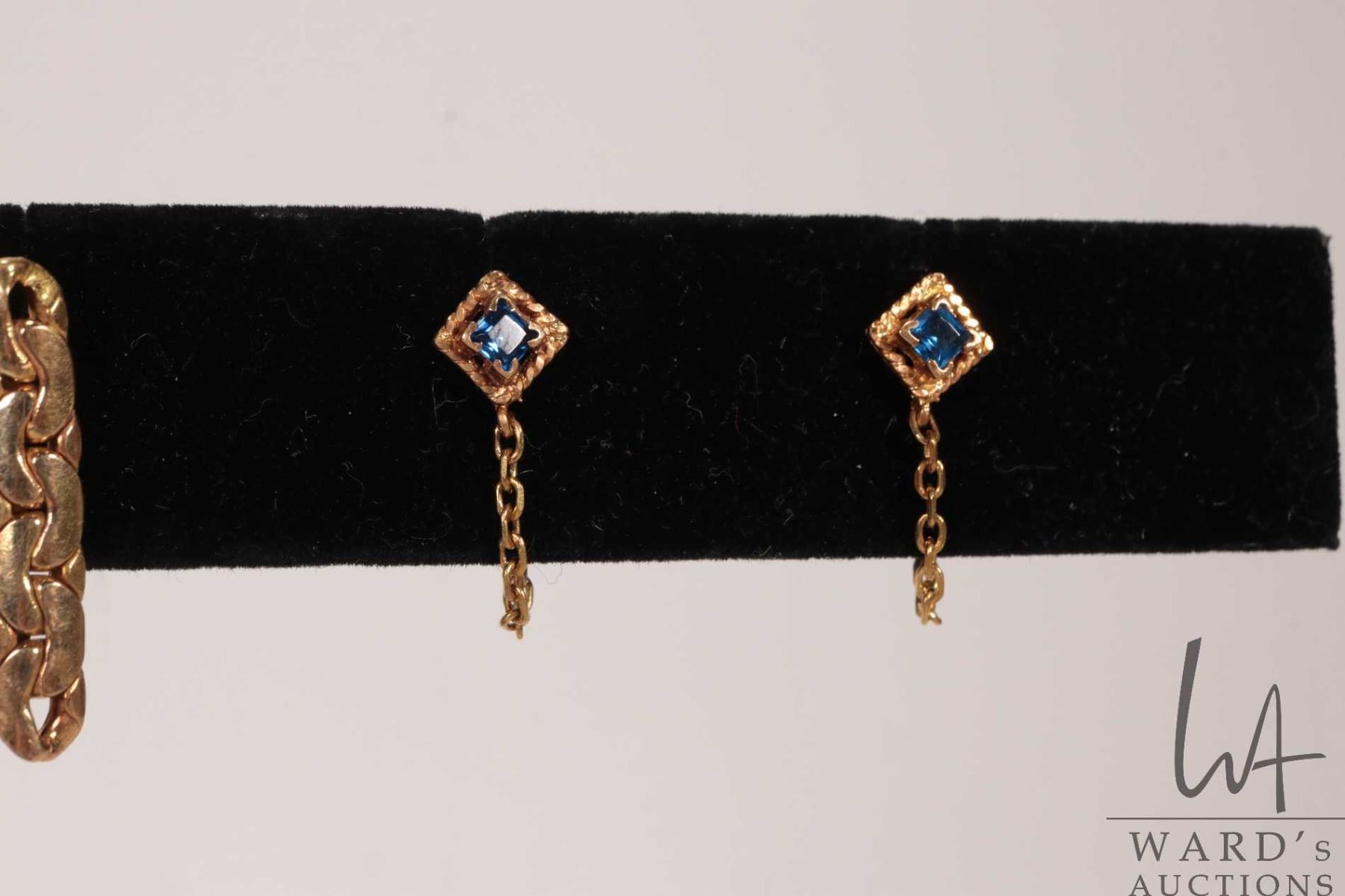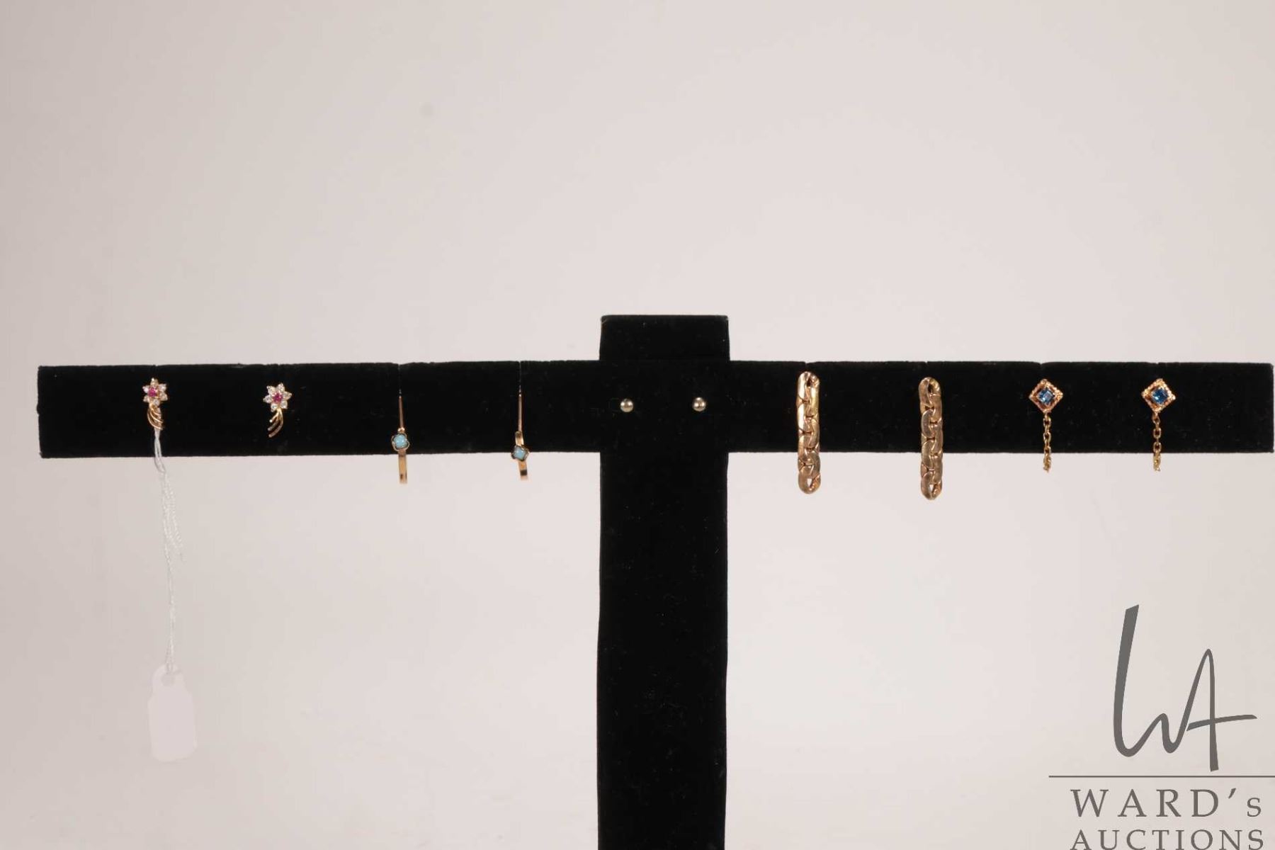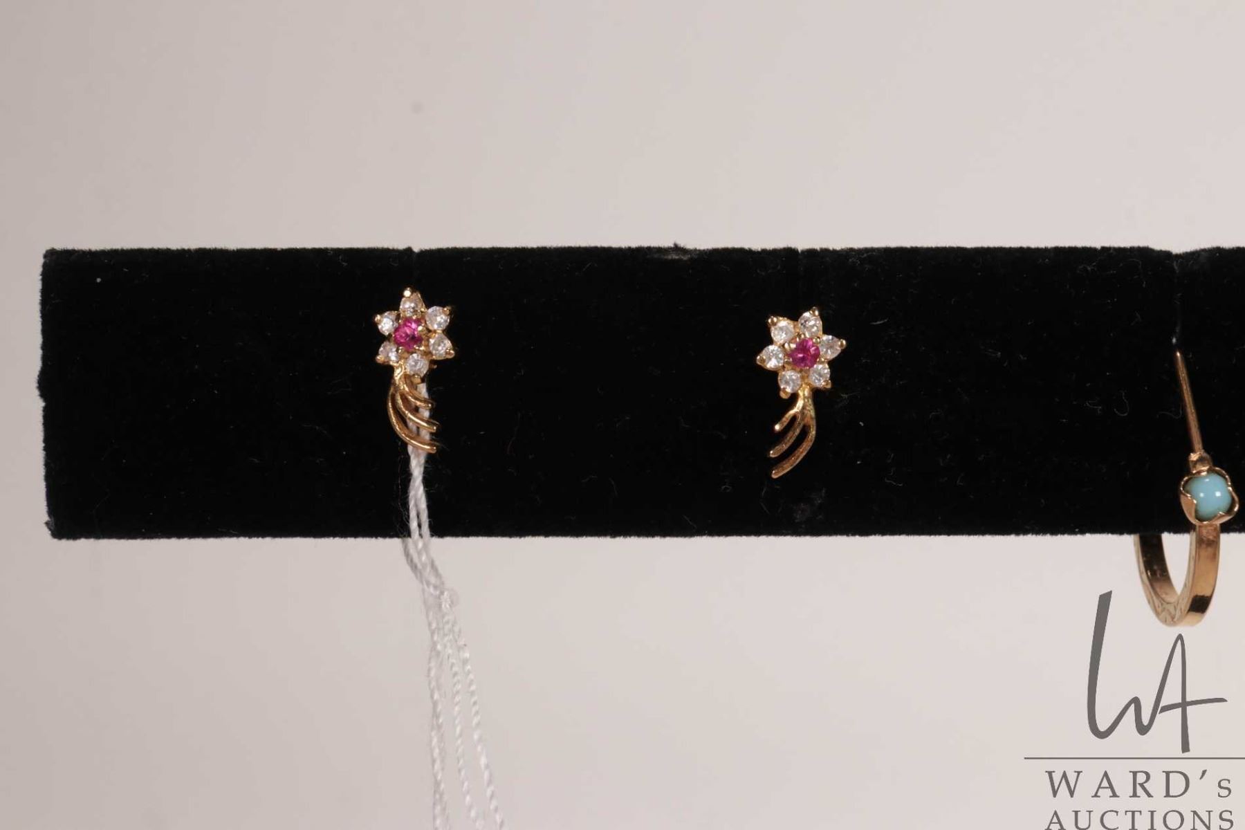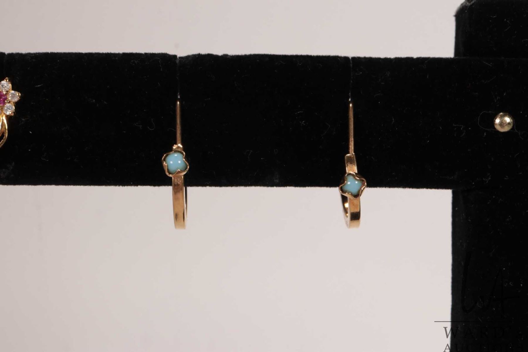 Two pairs of gold earrings including 18kt flattened curb chain marked 750 and tested 14kt hoops with turquoise stones, plus tested ruby earrings marked 750 and a pair of untested blue stone earrings