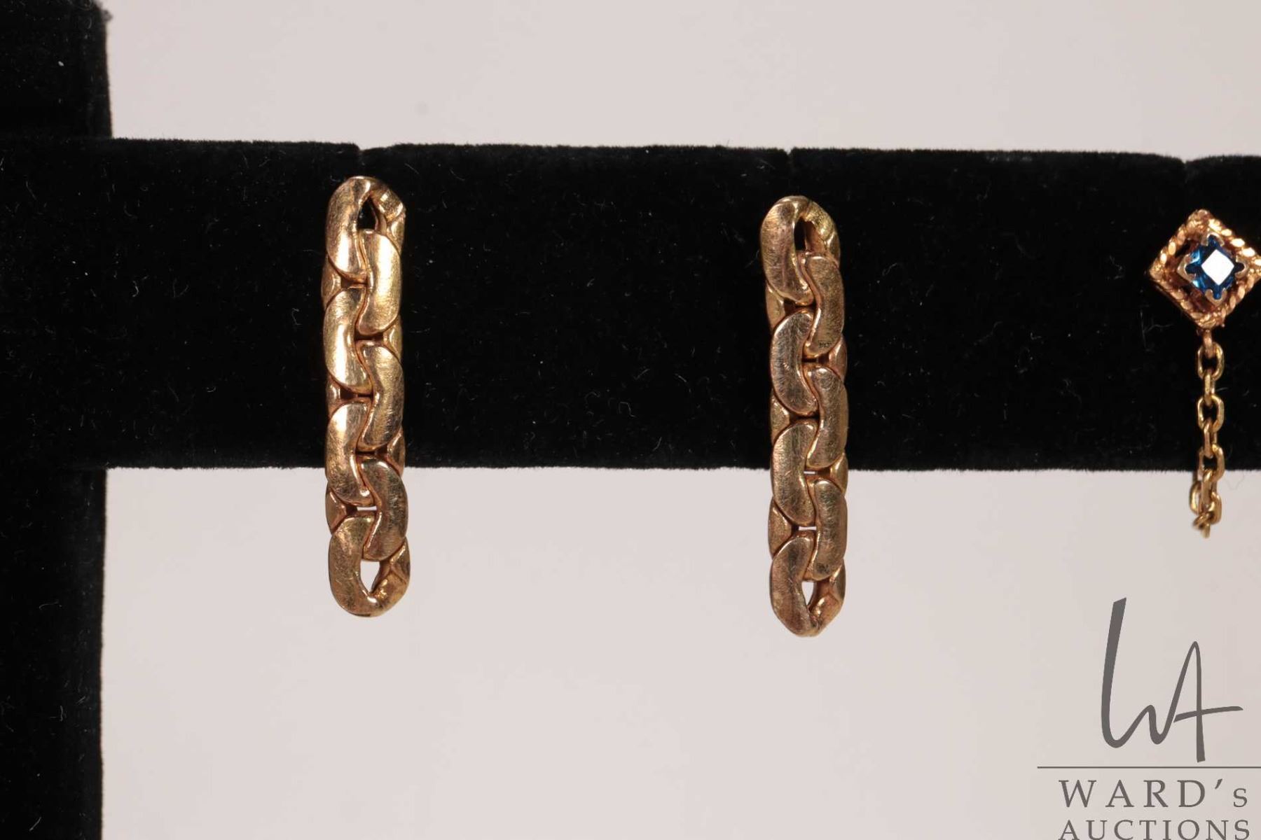 Two pairs of gold earrings including 18kt flattened curb chain marked 750 and tested 14kt hoops with