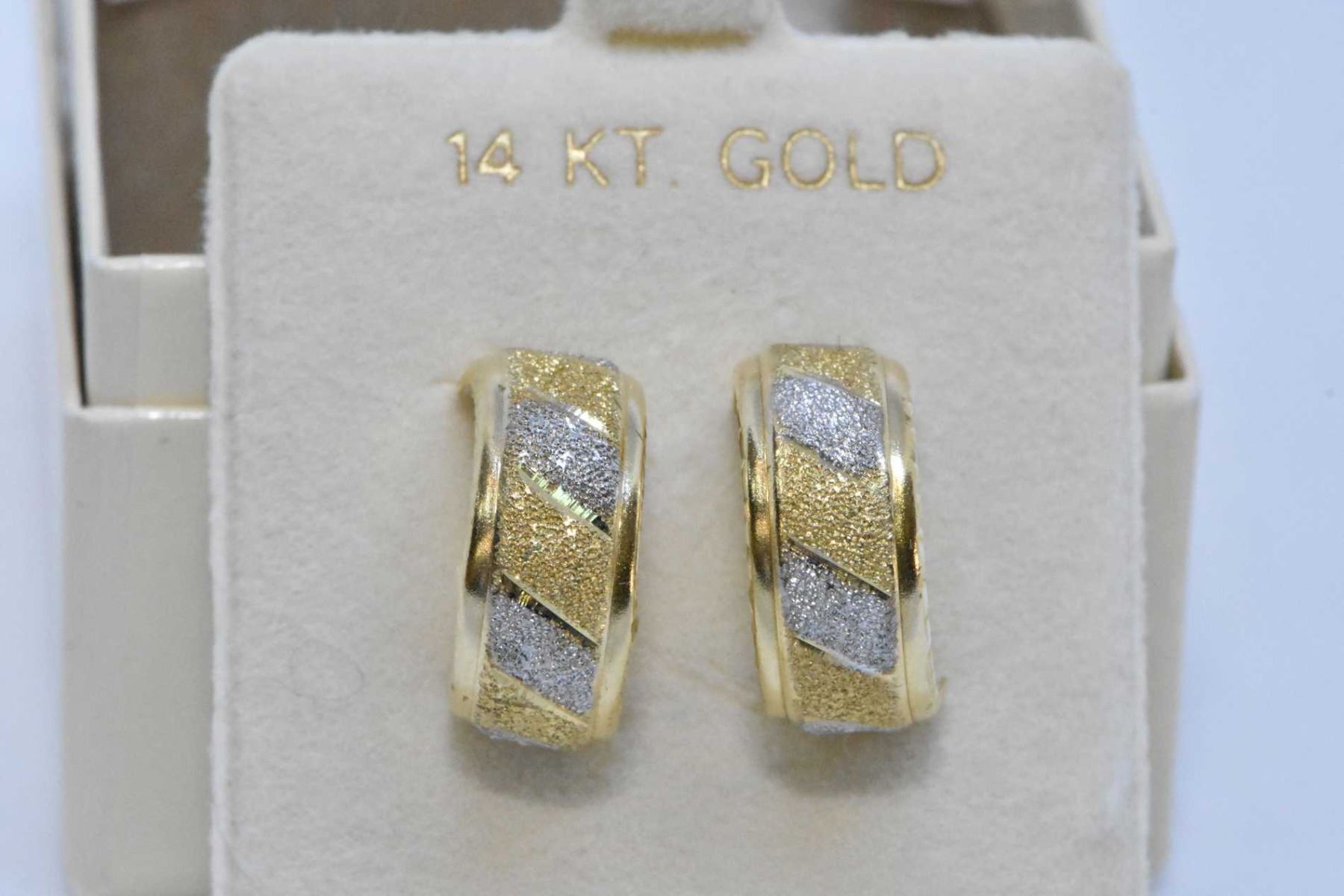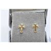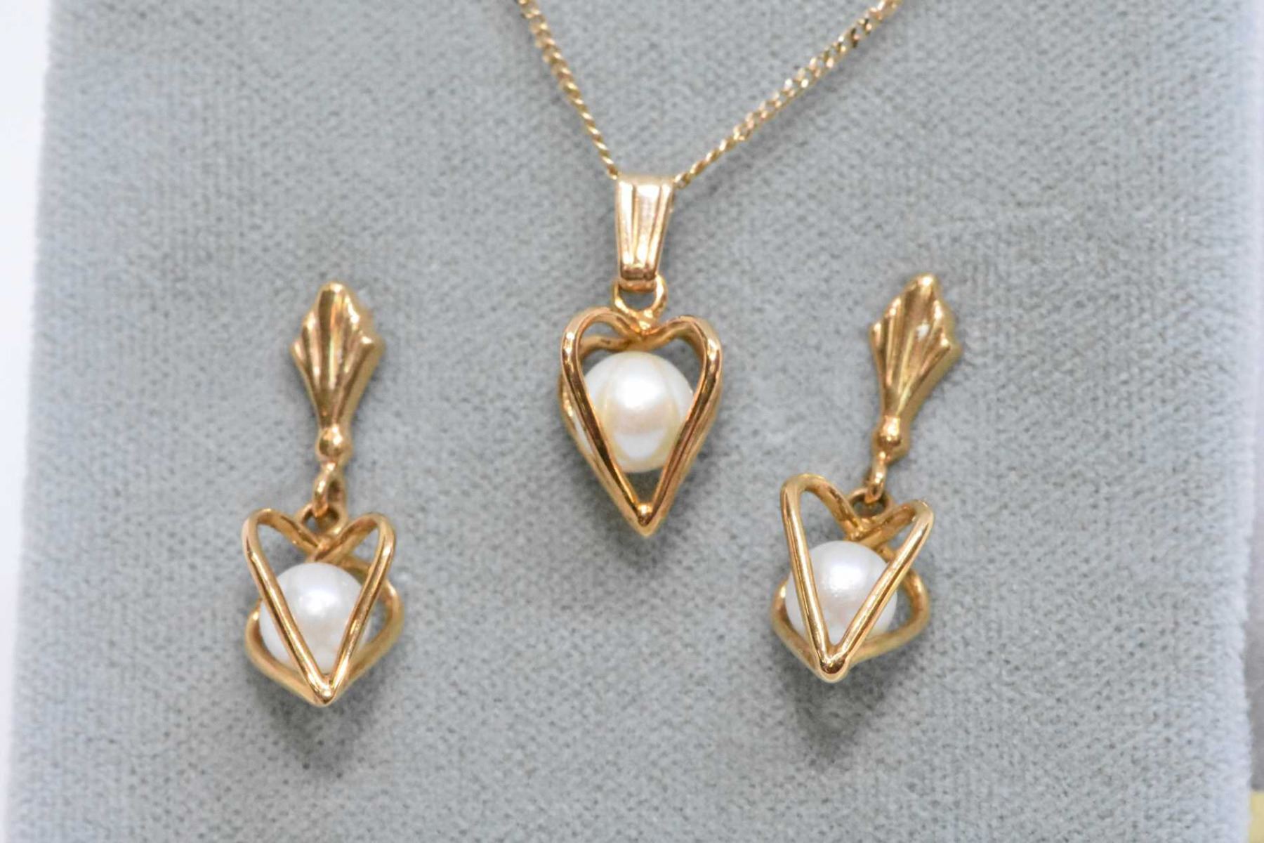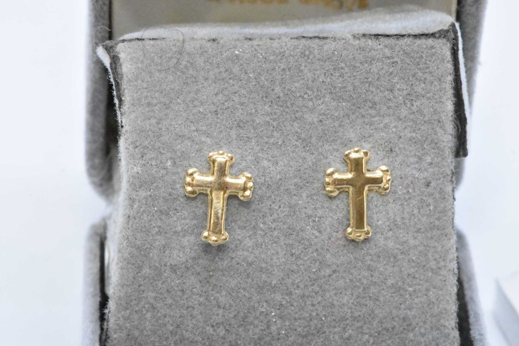 Two pairs of ladies gold earrings including 14kt white and yellow gold earrings, 10kt gold crosses plus a set of 14kt gold and pearl earrings and a matching pendant and chain
