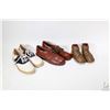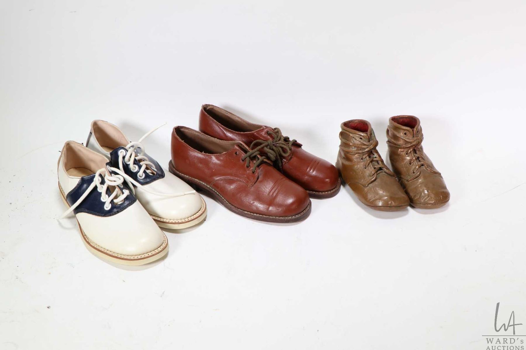 Two pairs of vintage children's shoes including saddle shoes with Goodyear rubber soles and a pair of leather dress shoes plus a pair of bronzed baby shoes