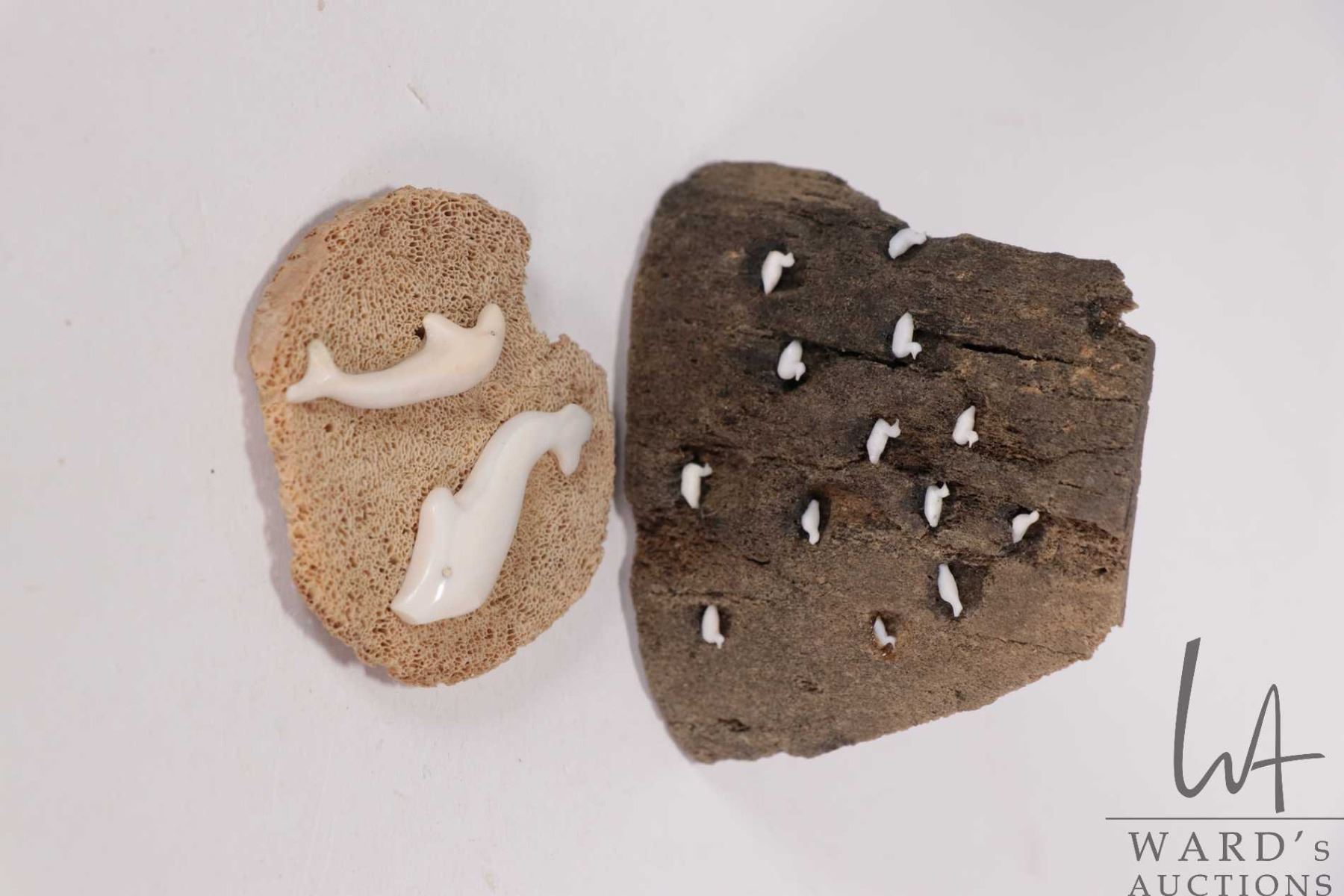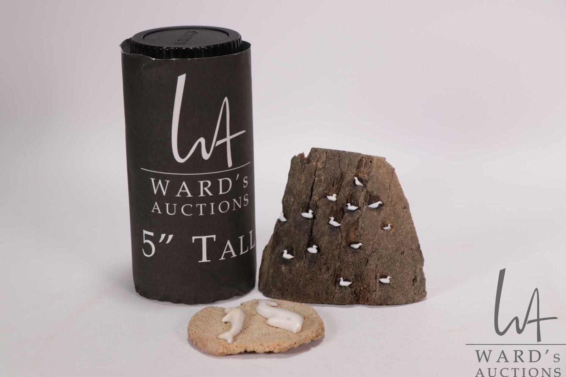 Two pieces of Inuit art including bone carved whales on vertebra, labeled artist Inuksak 2 1/2" in diameter and miniature sea birds on petrified wood 3" H