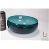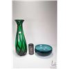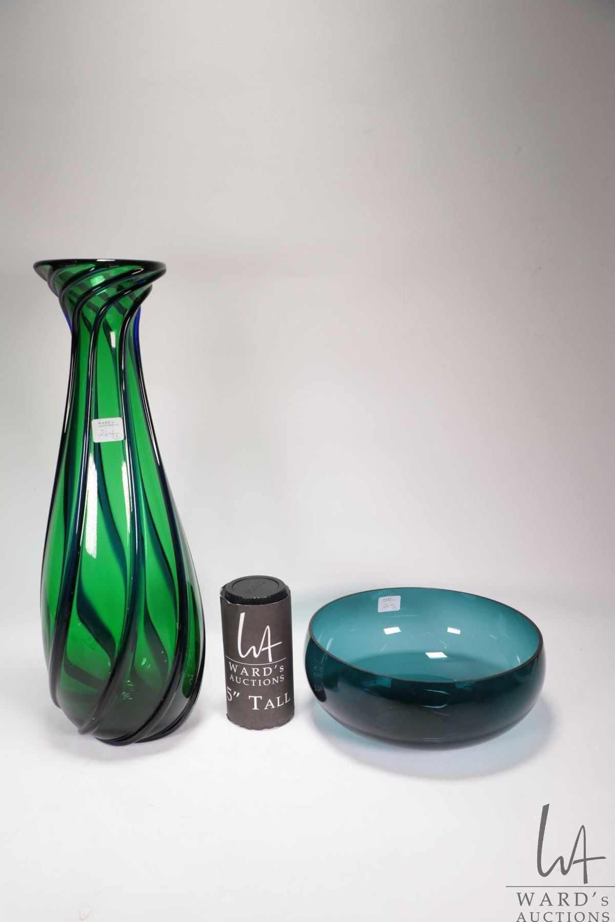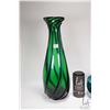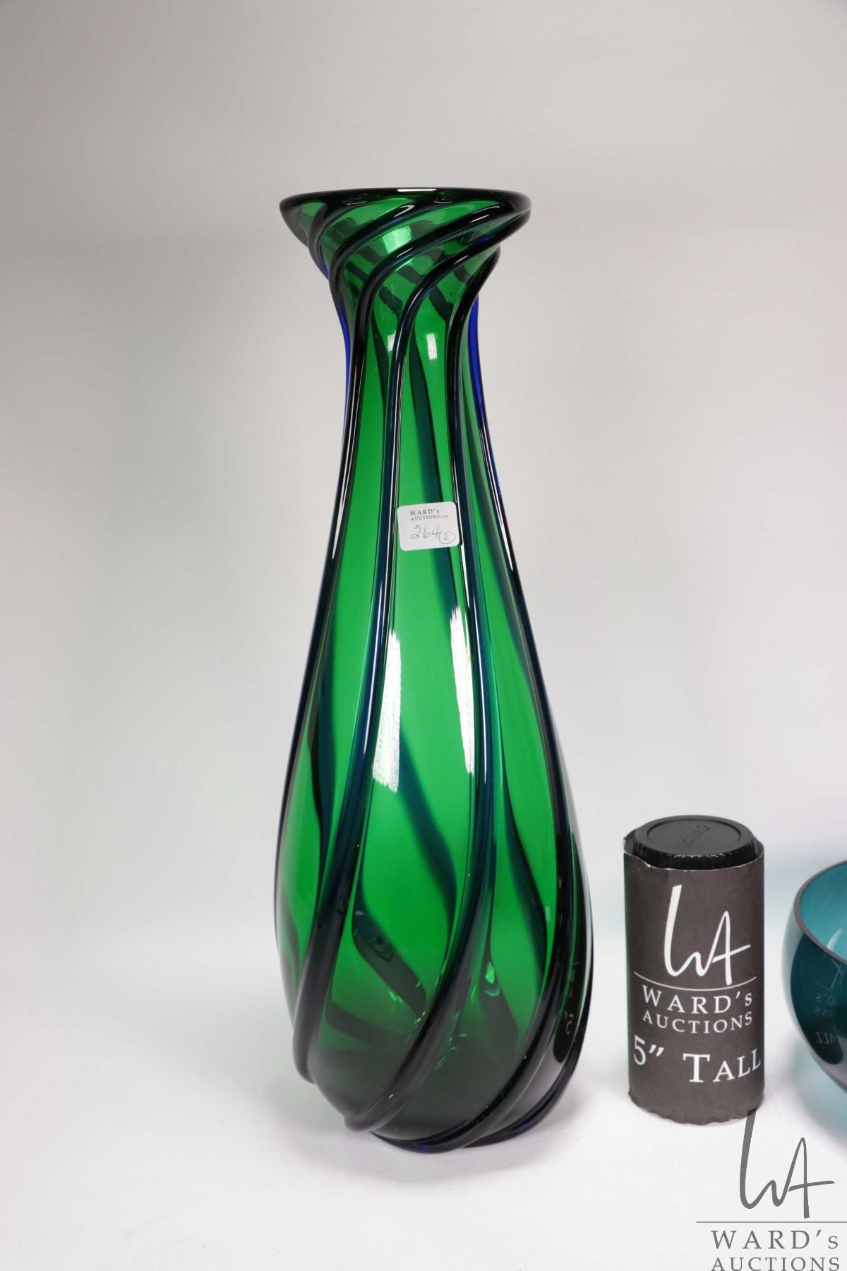 Two pieces of art glass including 17" emerald glass vase with cobalt swirls and teal glass vase 8 3/4" in diameter
