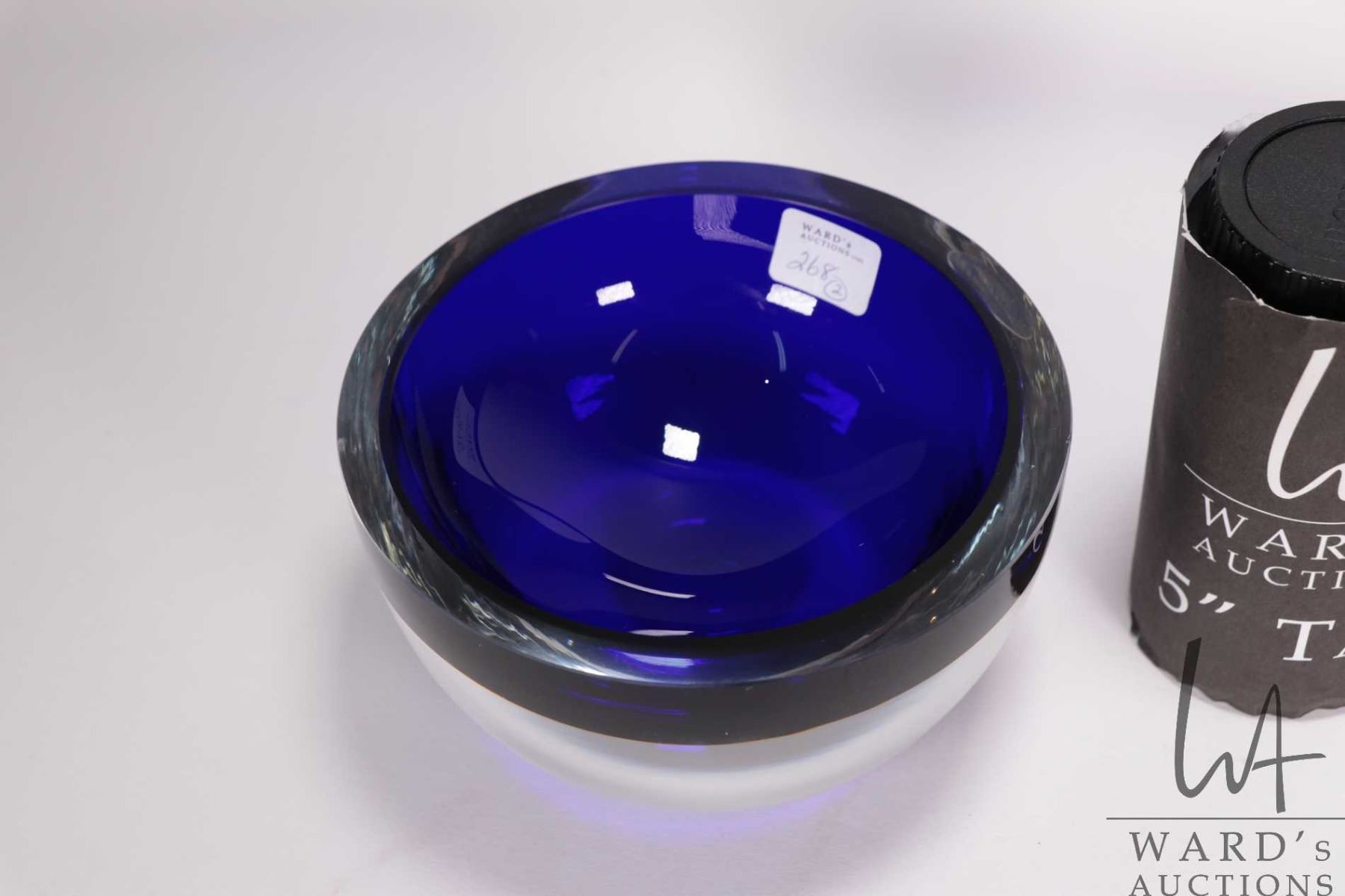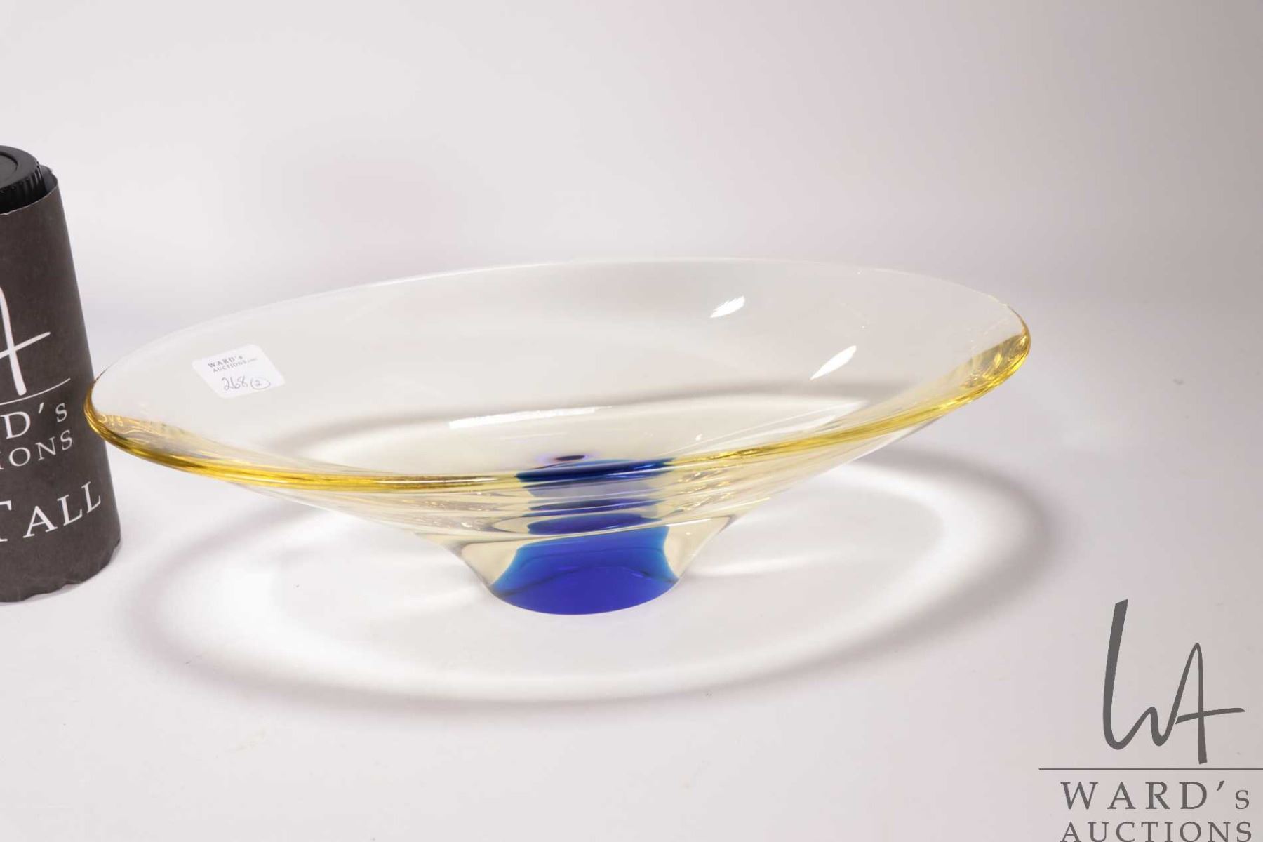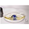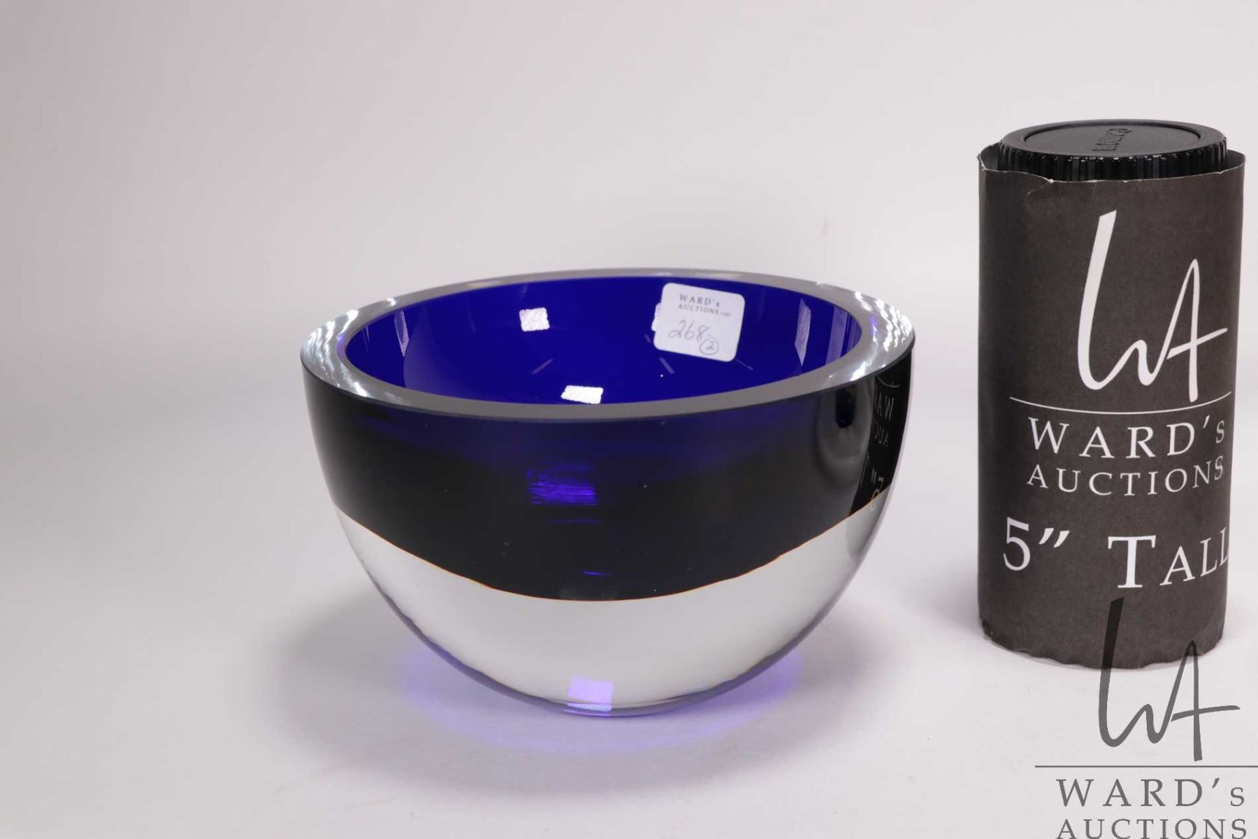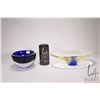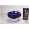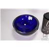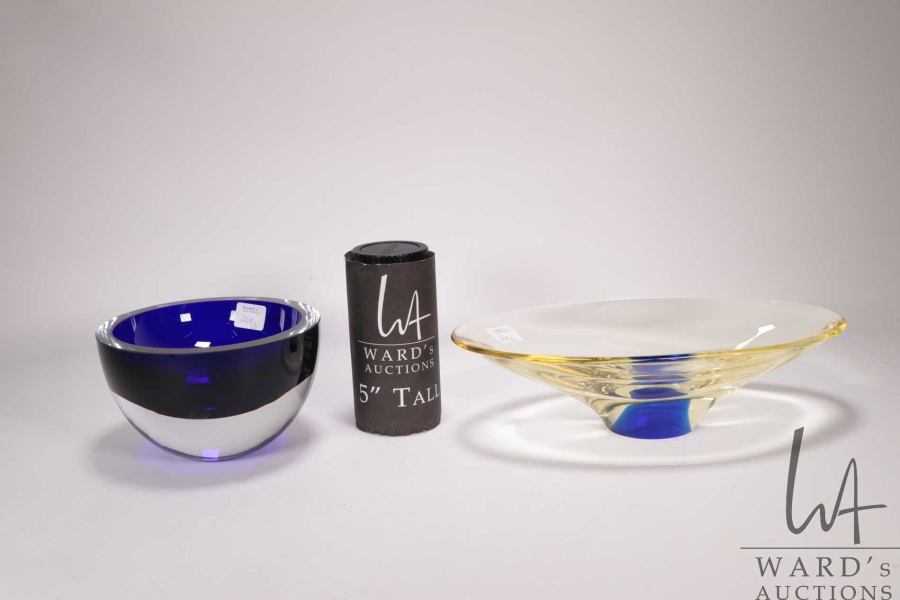 Two pieces of art glass including Badash cobalt and clear crystal bowl 6" in diameter and 12" lemon to cobalt oval bowl