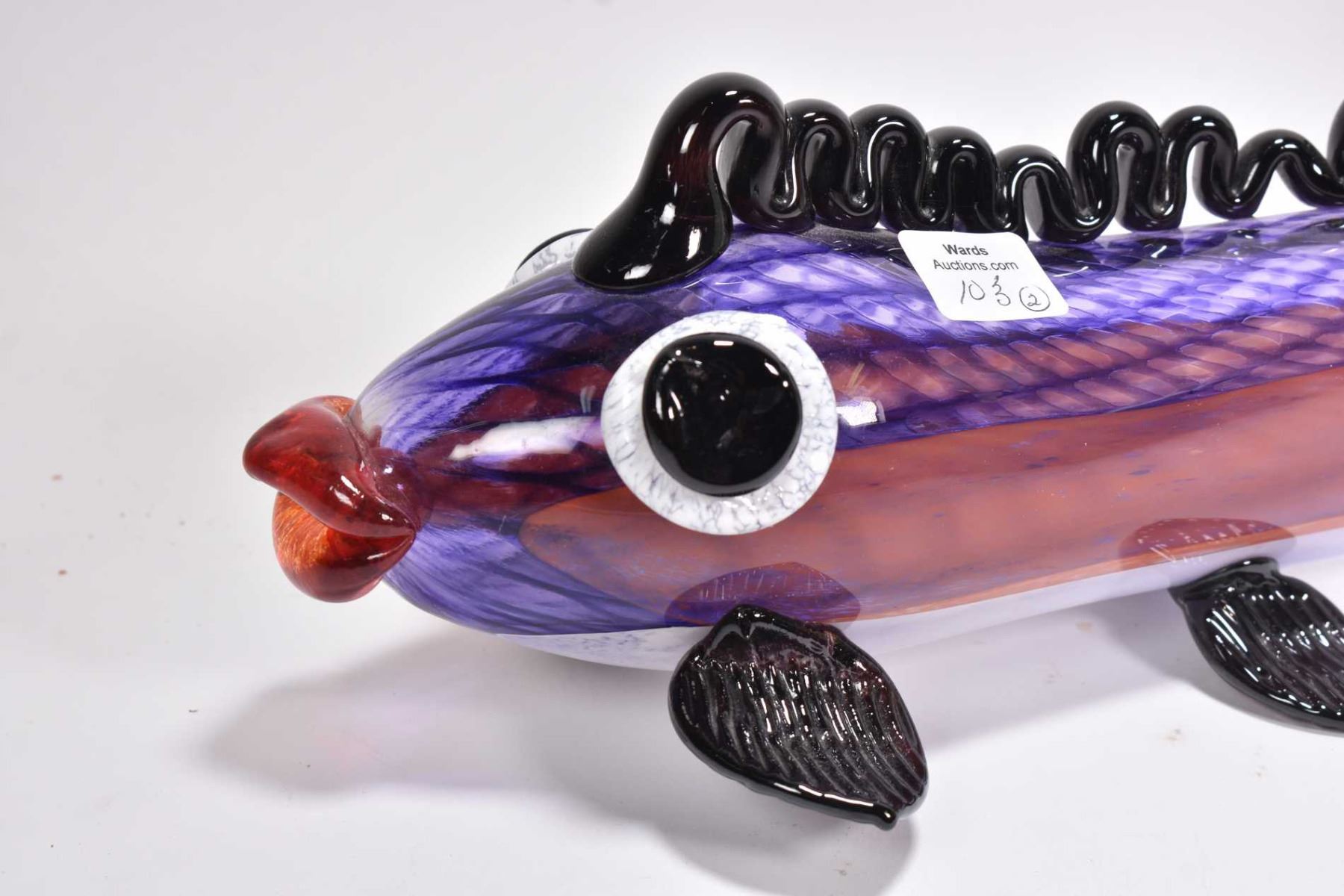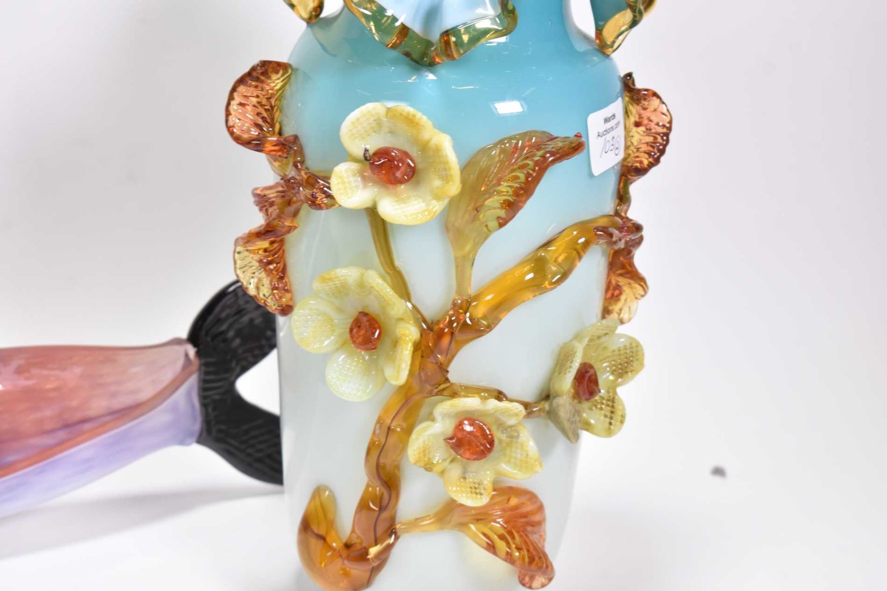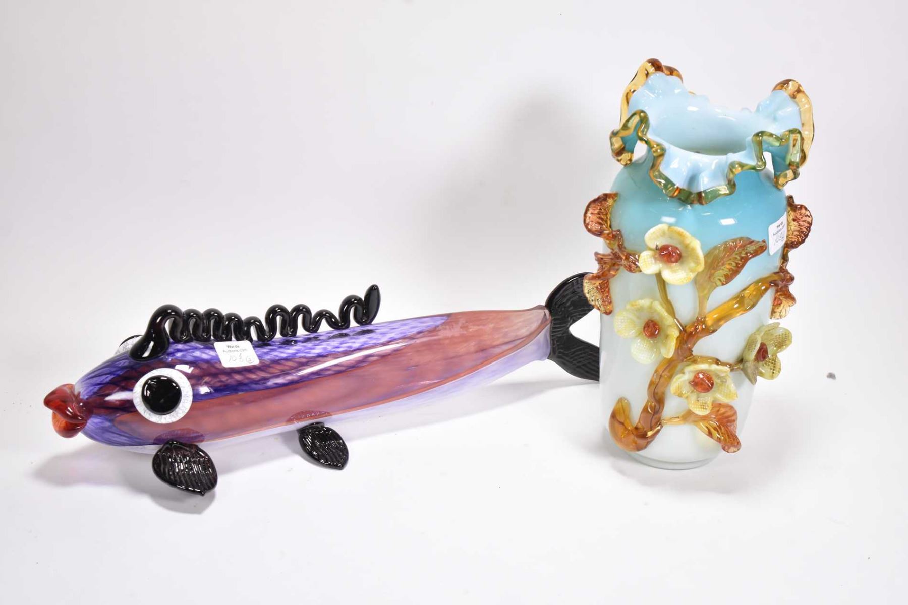 Two pieces of art glass including a Murano kissing fish and a 10" high ruffled vase with attached floral