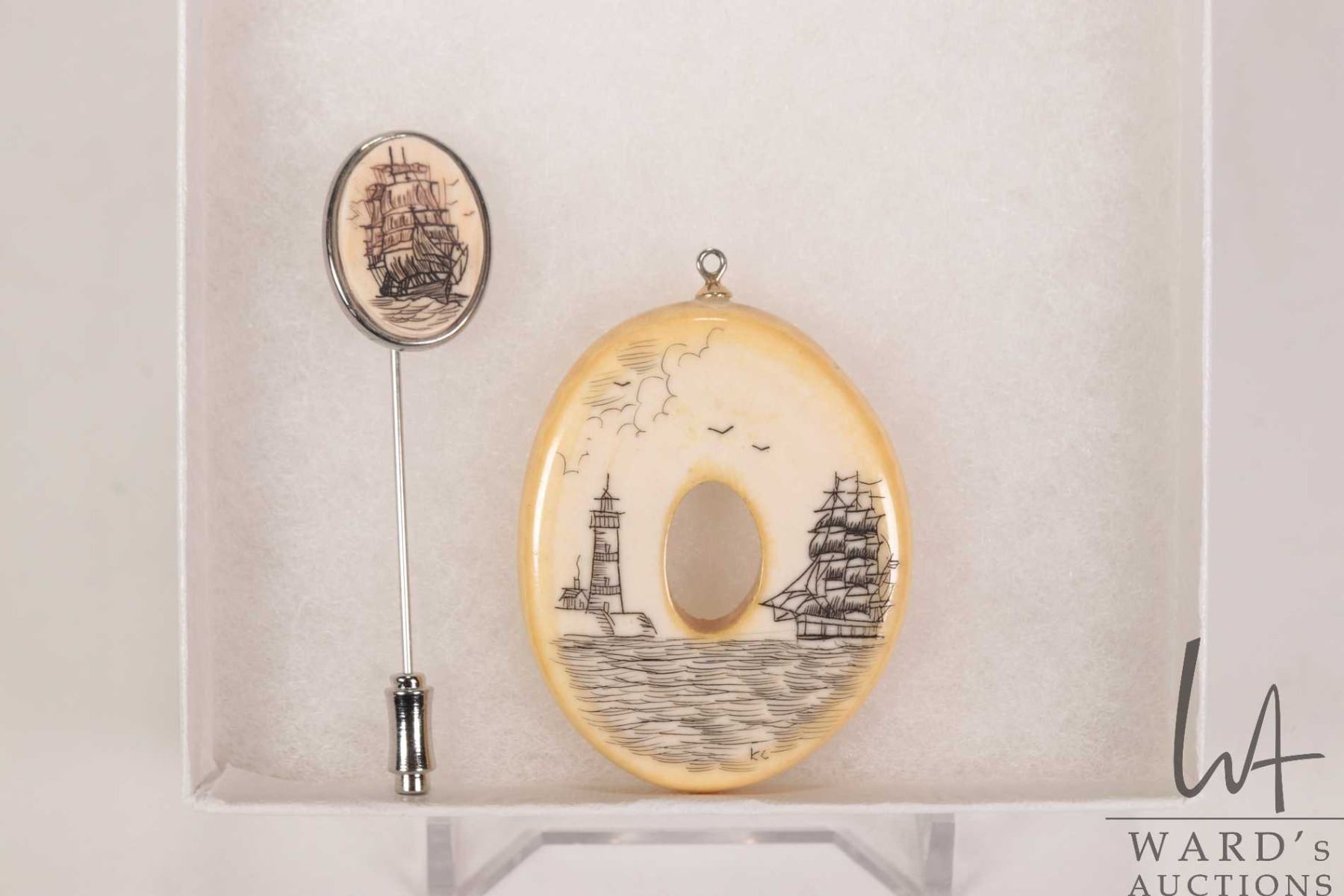 Two pieces of carved scrimshaw including pendant and a stick pin. Can not be shipped outside of Cana
