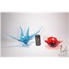 Two pieces of coloured art glass including signed Chalet blue glass dish 19 1/2" in length X 9 3/4" high and a red glass dish