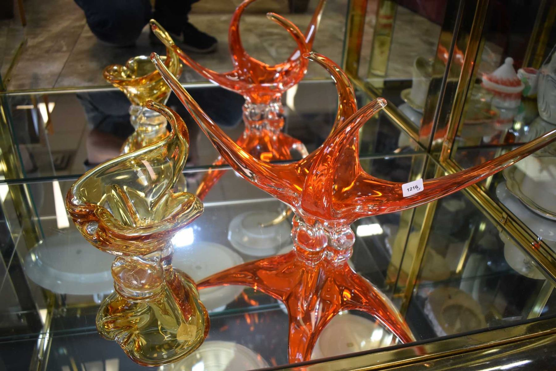Two pieces of marked Chalet art glass including amberina glass 8" tall dish and a four branch 19" orange glass dish