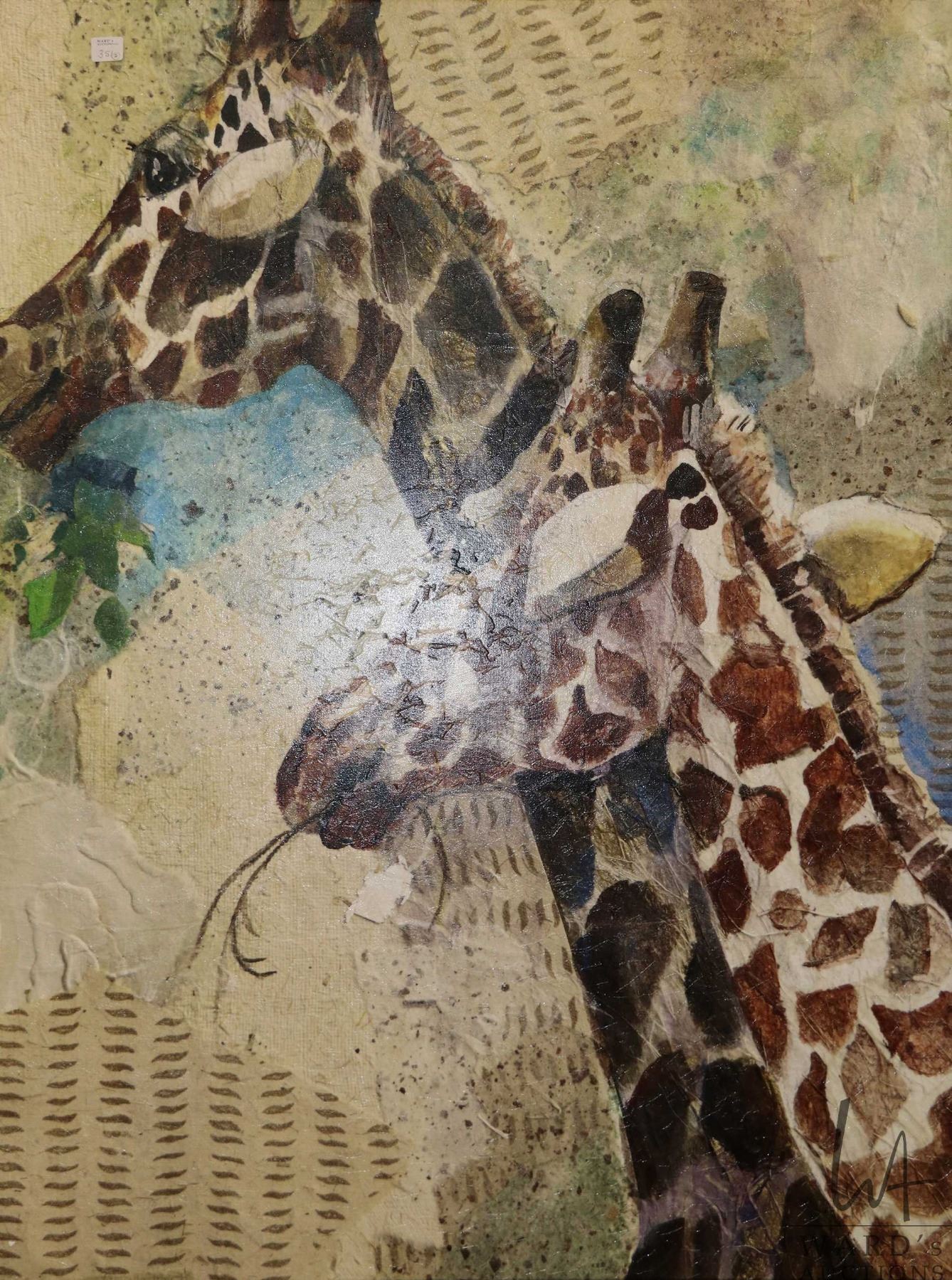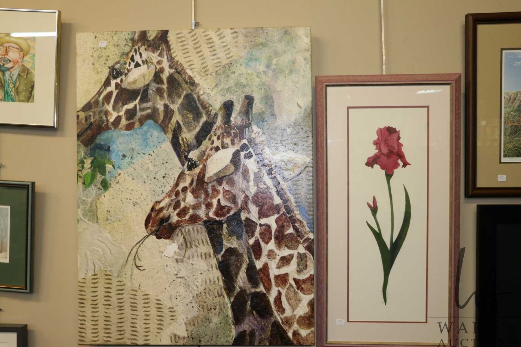 Two pieces of wall art including limited edition print titled "Iris IV", pencil signed by artist Harry Heuire 112/150 and a framed giclee print of giraffes, 40 1/2" X 30". Note: Artwork cannot be insured and is often too large to ship. Local pickup.