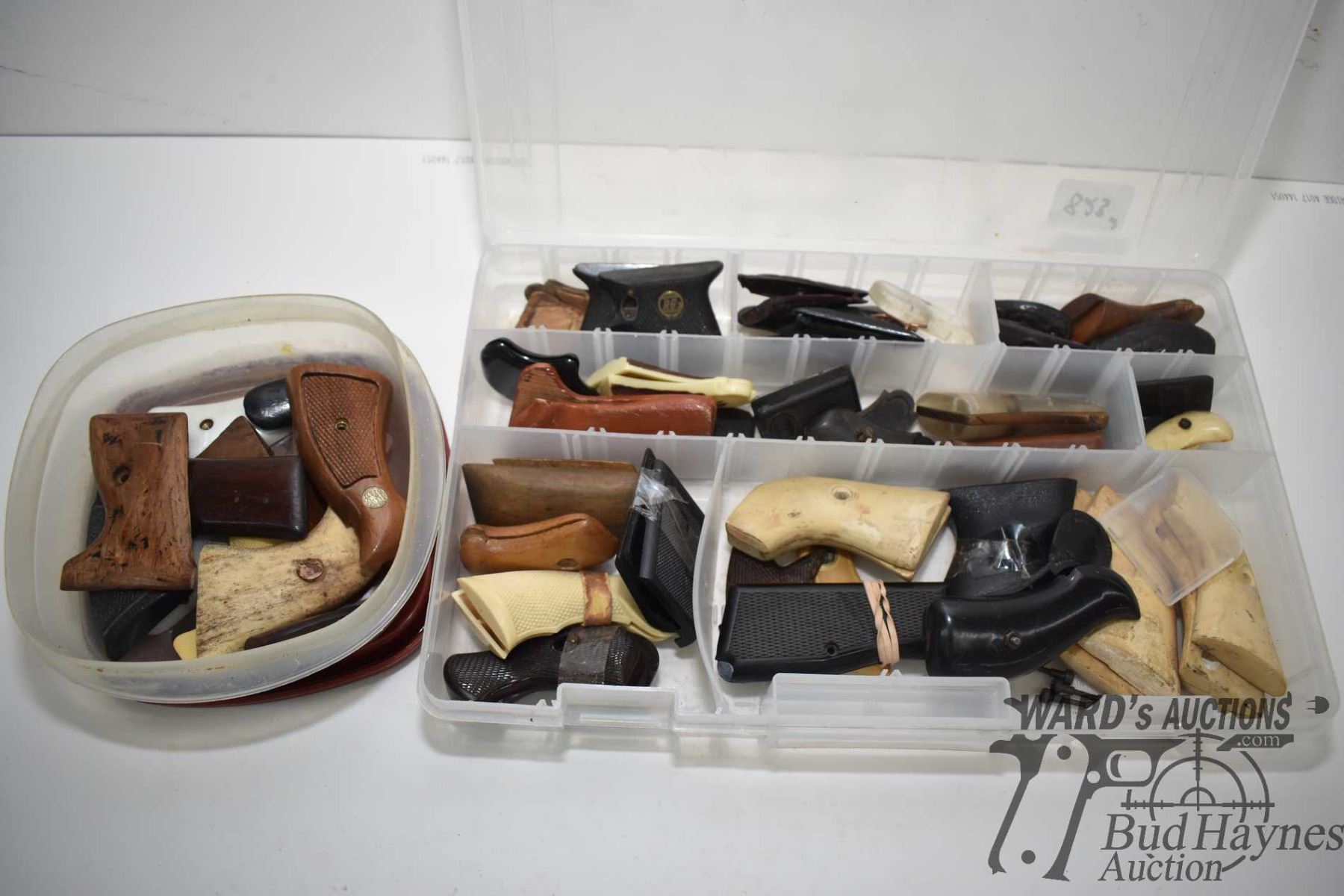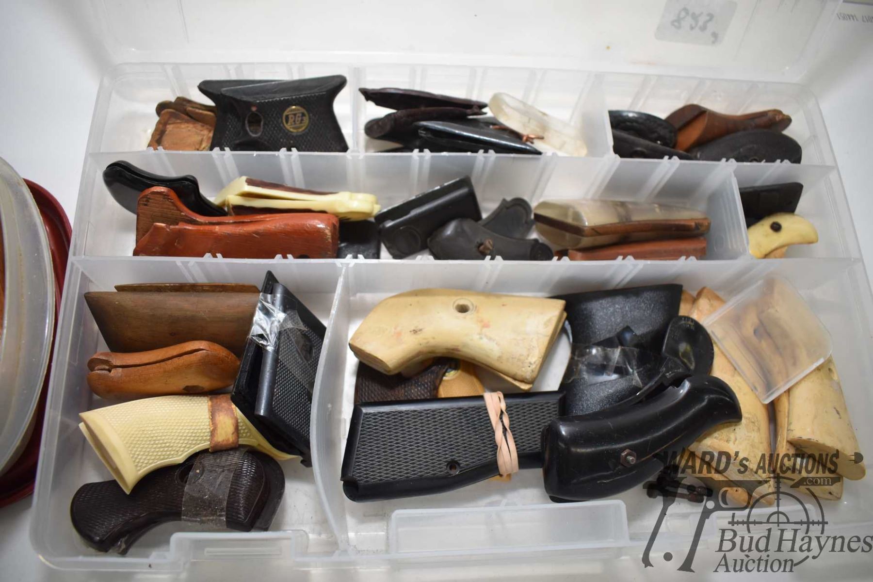 Two plastic trays containing assortment of vintage wood, bone and plastic hand grips