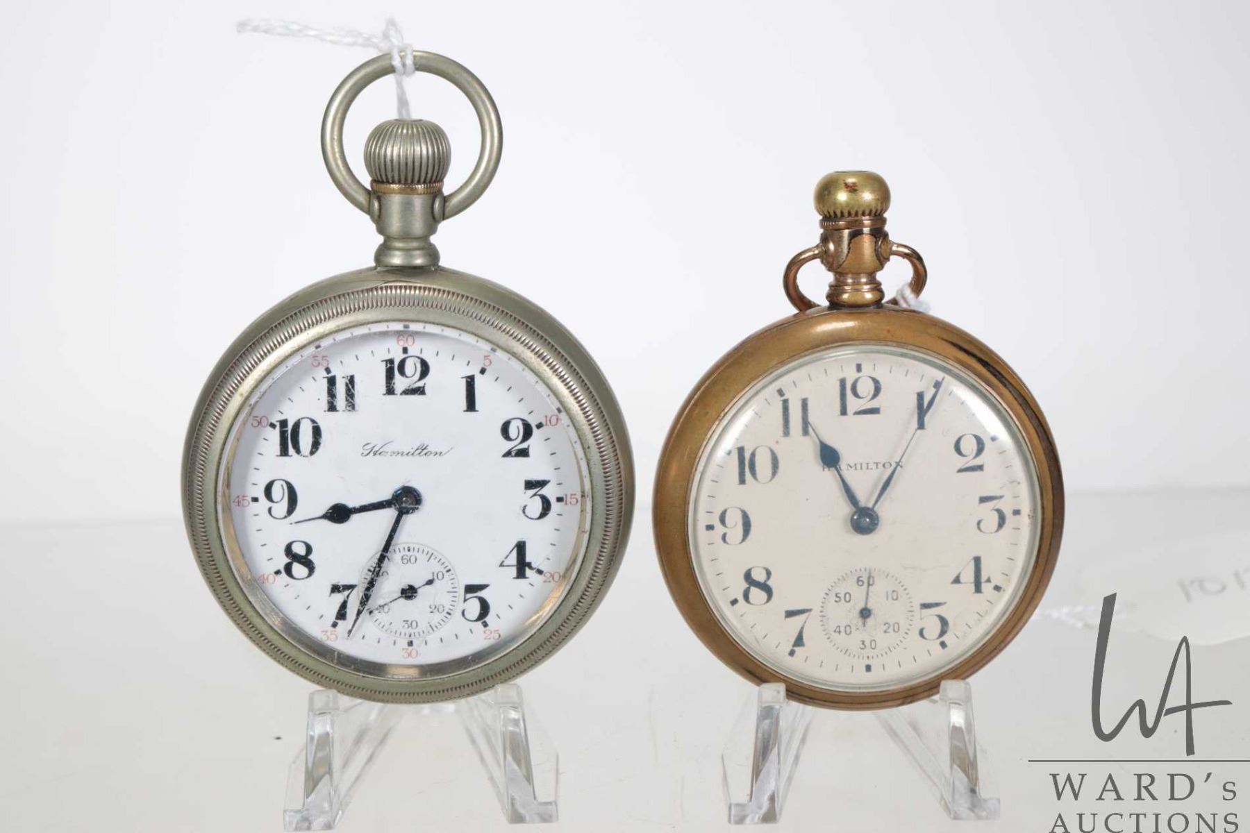 Two pocket watches including 15 jewel, Swiss made watch, unknown maker with white enamel dial, Roman and Arabic numerals and second sweep. In . Inscribed on back middle plate : "European War 1914-1918 Carstairs Junction, Welcome Home Walter Jardine". In 925 sterling silver open face case. Note: damage to face. Working at time of cataloguing. Plus an E. Howard and Co. grade Series 9, model 1905, 17 jewel, size 16 pocket watch with white single sunk dial, Arabic numerals and second sweep. In Fortune A.W.C. Co. gold filled case. Note: missing hand on second sweep. Working at time of cataloguing
