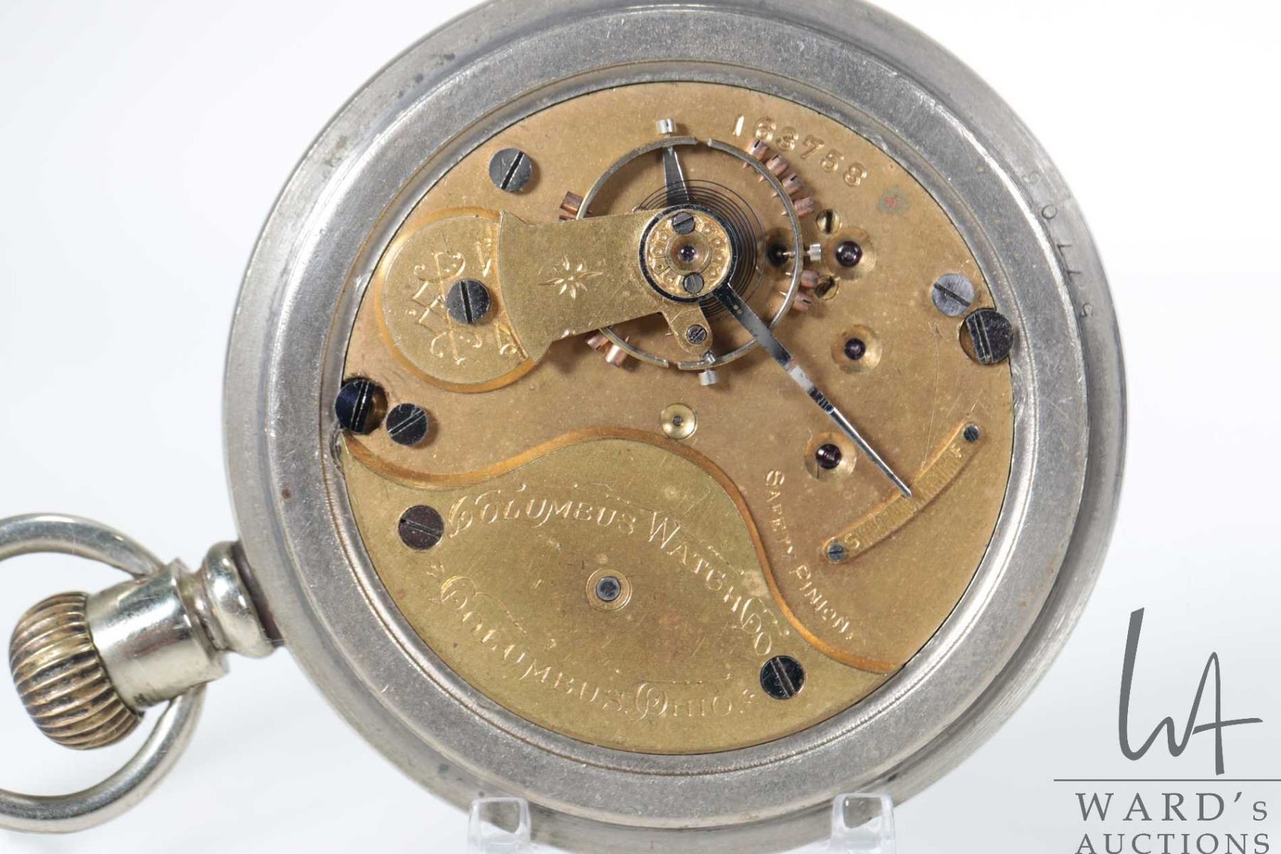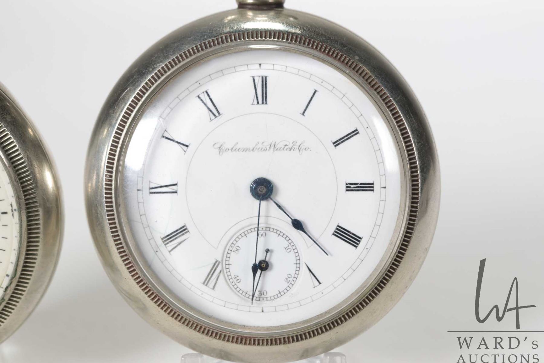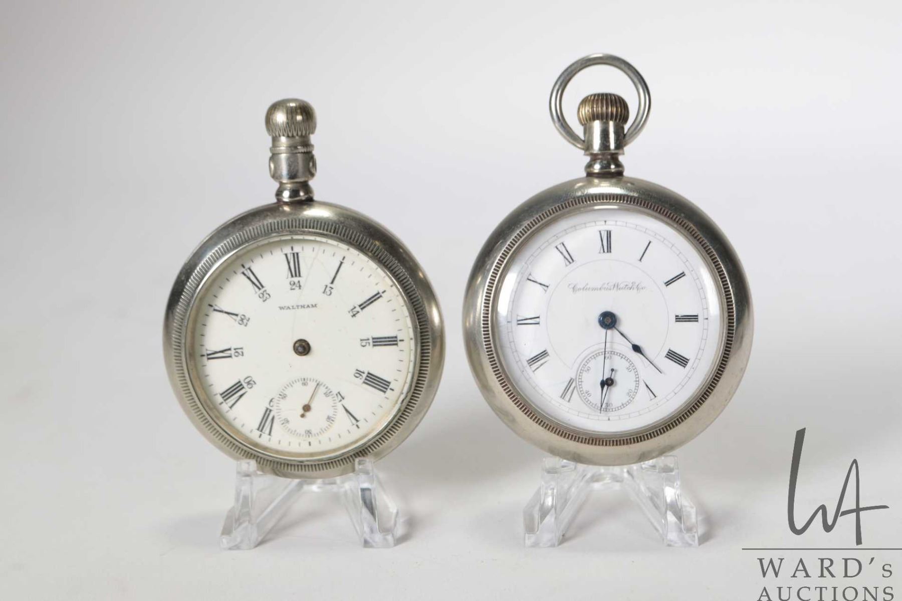 Two pocket watches including a Waltham size 18s, 7 Jewel, grade No. 1, Model 1883. Serial No. 7412219. Estimated production year of November 1896 - February 1899. Full qilt plate, stem wind and set. Movement signed American Waltham Watch Co. Single Sunk porcelain, black roman numerals, missing main hands, gold looking second hand. Housed in a A.W.C. Co. Nickle silver case. And a Colombus size 18s, 11 Jewel, Grade 21, model 2. Serial No. 163758. Estimated production year of 1890. Full gilt plate. Stem wind and set. Movement signed Columbus Watch Co. Single sunk porcelain, black roman numerals, blued spade hands. Housed in a A.W.C.Co. Nickel silver case. Both working at time of cataloguing.