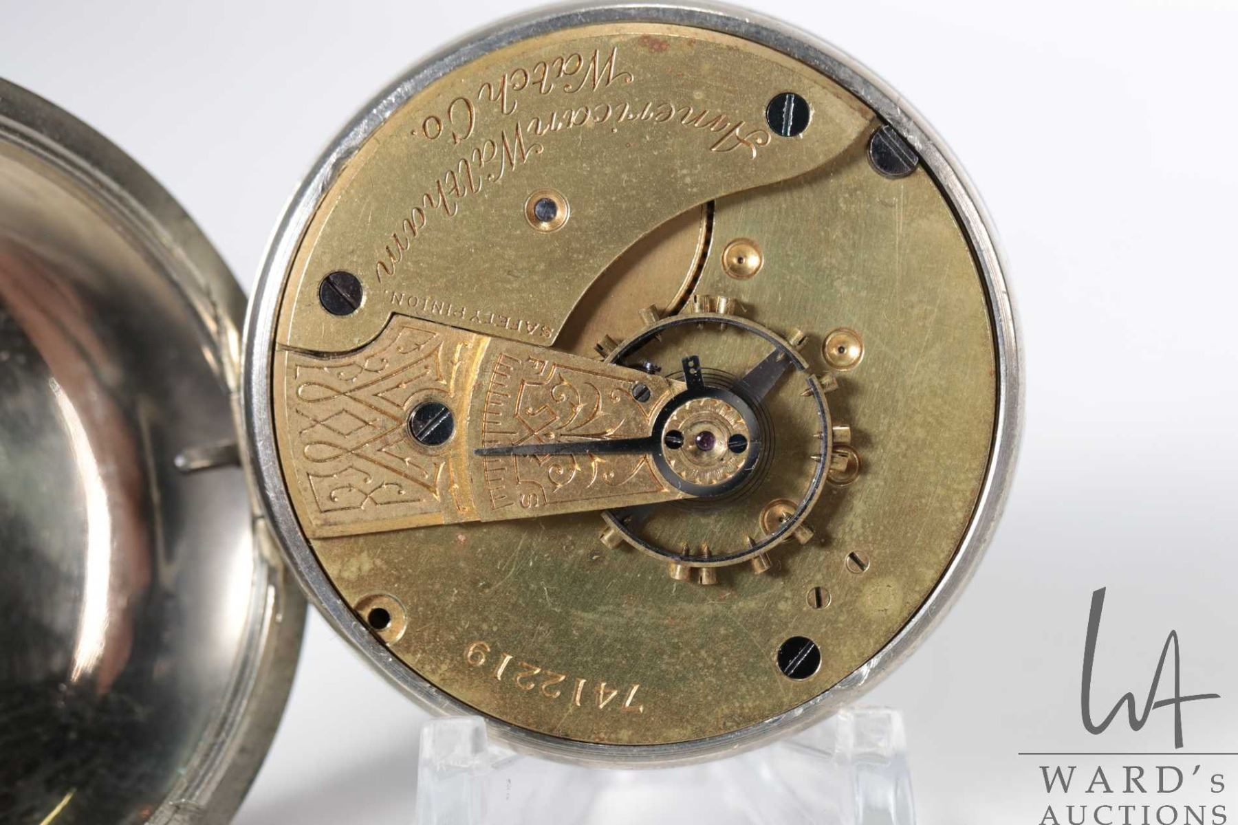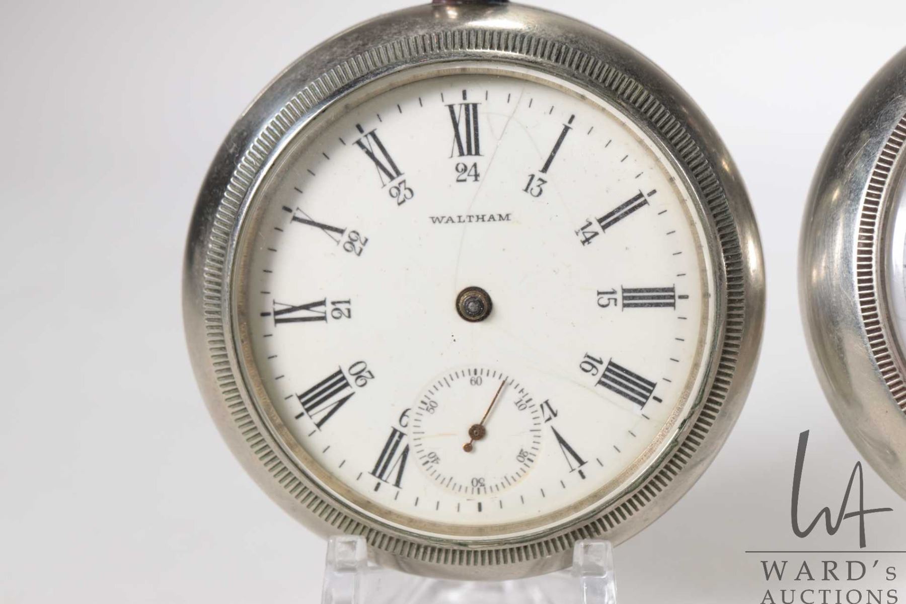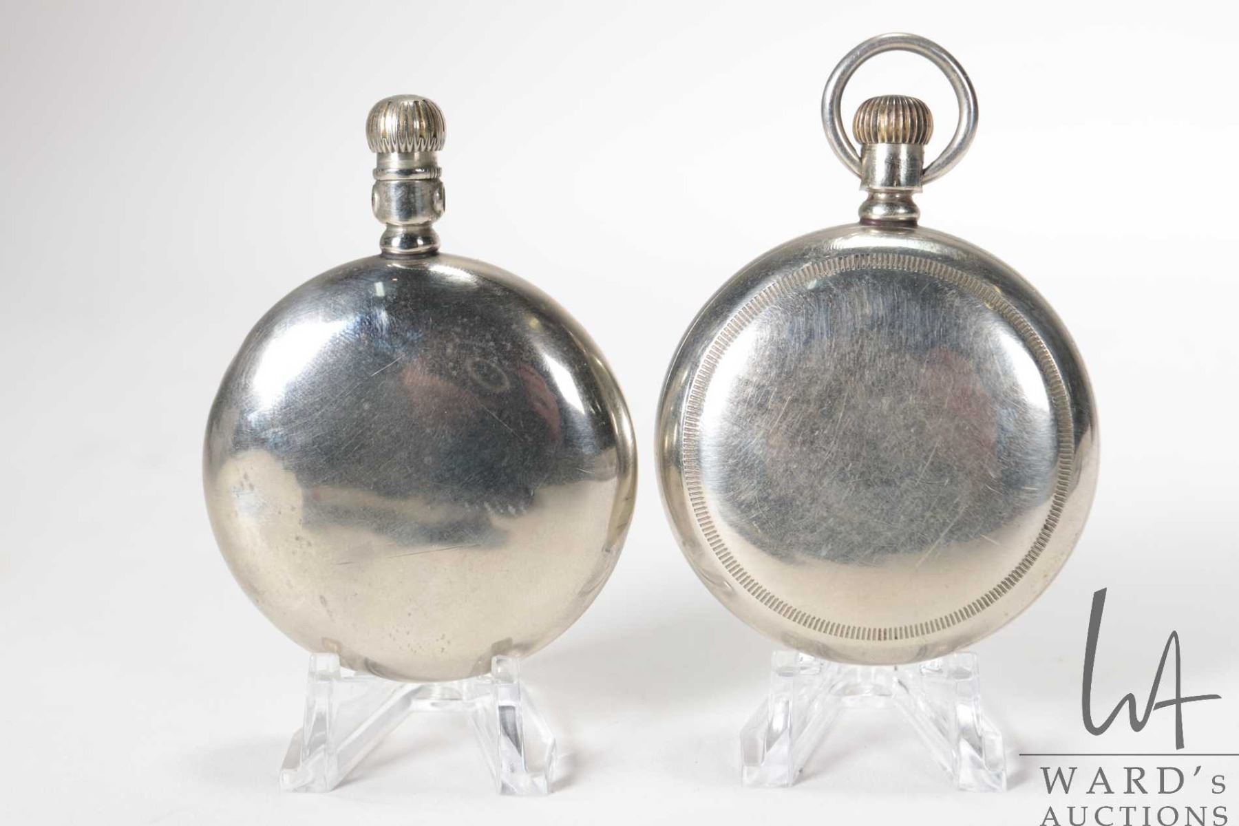 Two pocket watches including a Waltham size 18s, 7 Jewel, grade No. 1, Model 1883. Serial No. 7412219. Estimated production year of November 1896 - February 1899. Full qilt plate, stem wind and set. Movement signed American Waltham Watch Co. Single Sunk porcelain, black roman numerals, missing main hands, gold looking second hand. Housed in a A.W.C. Co. Nickle silver case. And a Colombus size 18s, 11 Jewel, Grade 21, model 2. Serial No. 163758. Estimated production year of 1890. Full gilt plate. Stem wind and set. Movement signed Columbus Watch Co. Single sunk porcelain, black roman numerals, blued spade hands. Housed in a A.W.C.Co. Nickel silver case. Both working at time of cataloguing.