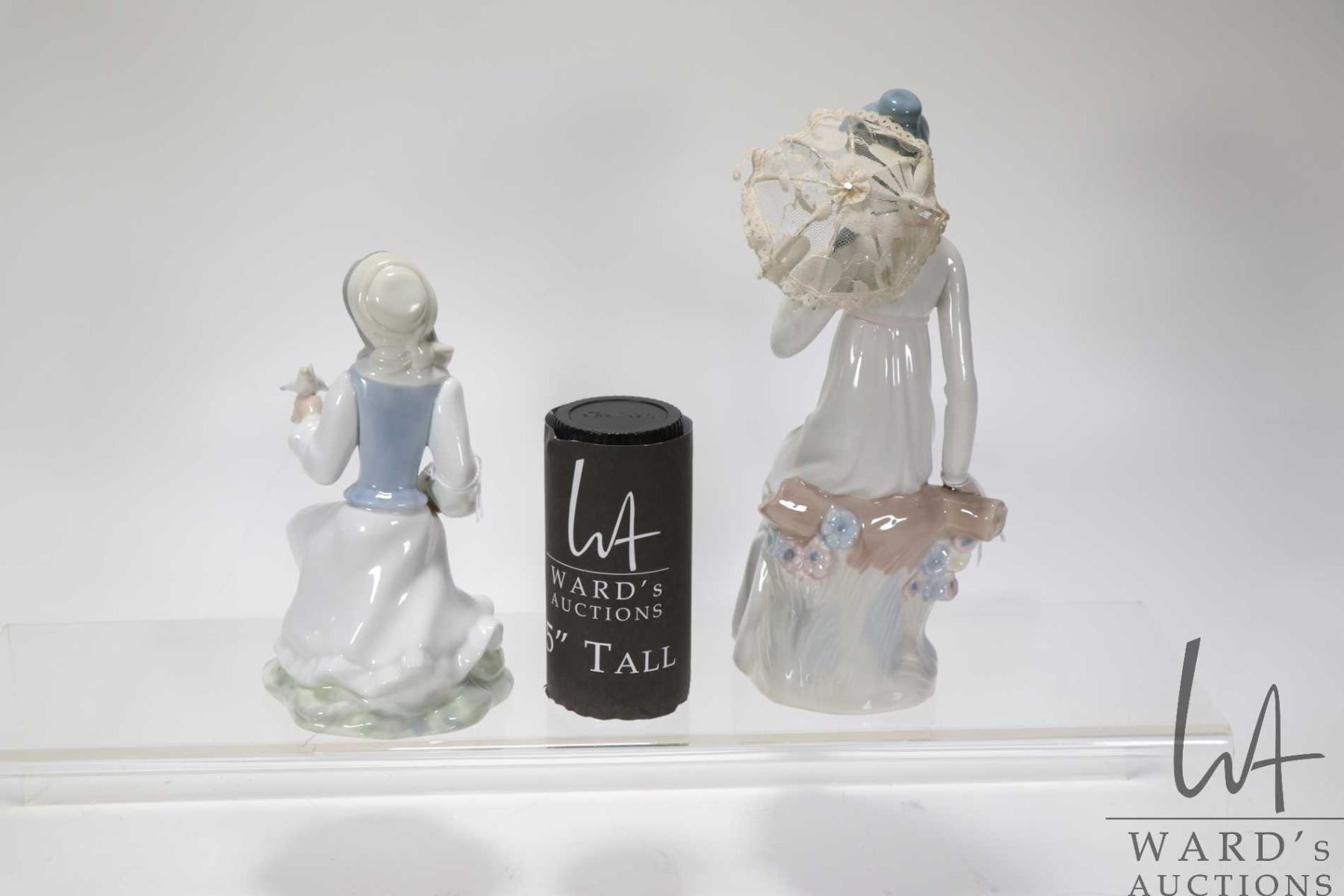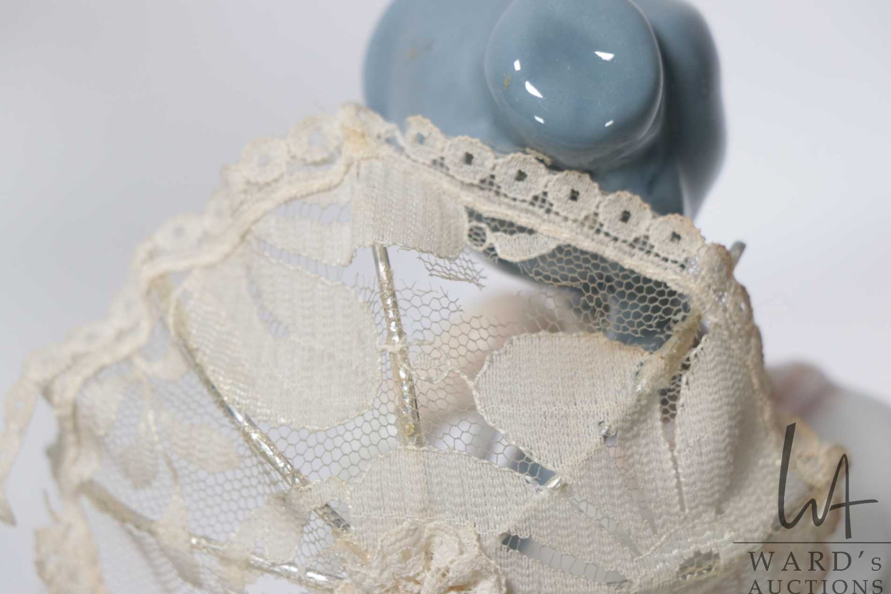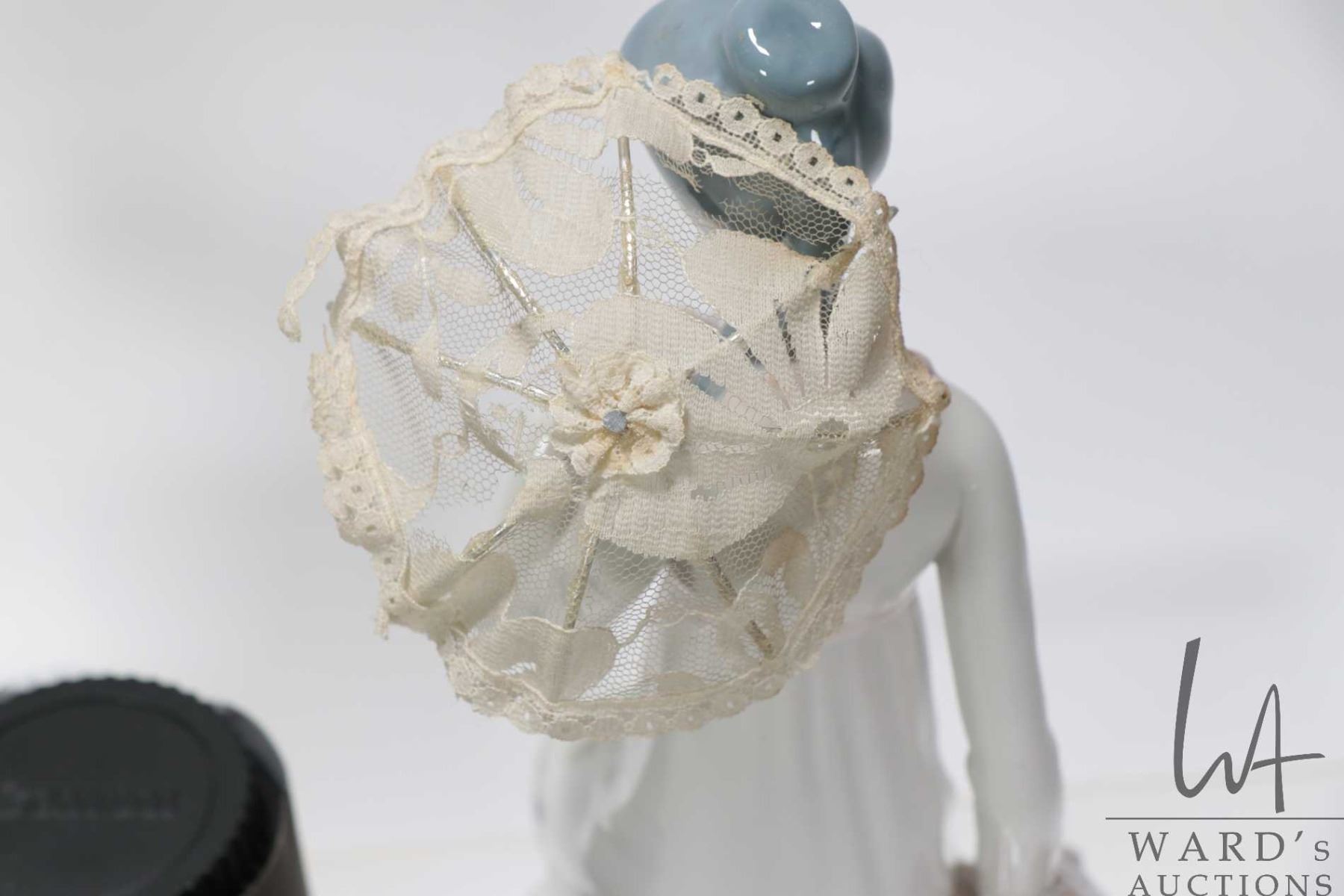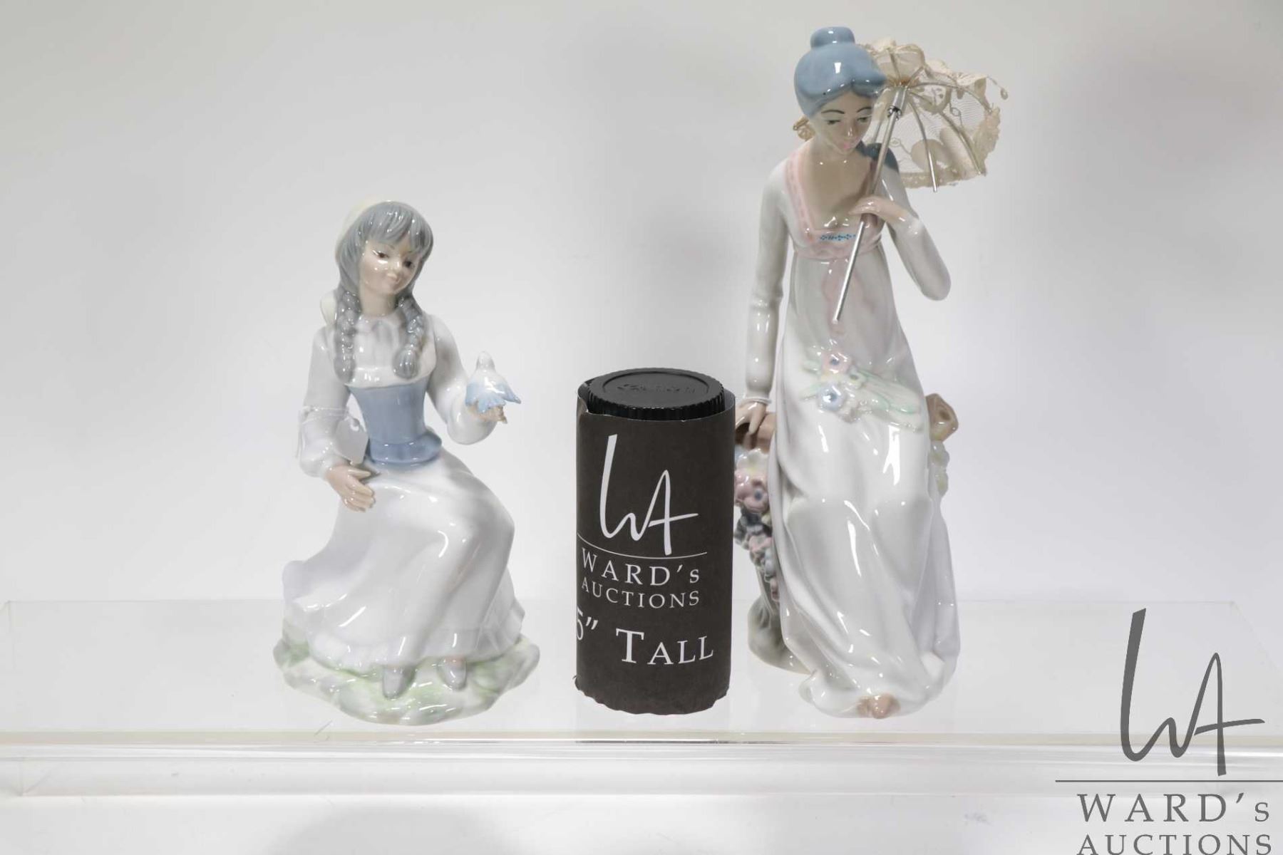 Two porcelain figurines including Tengra girl with bird and a 11" high Cascades lady with parasol