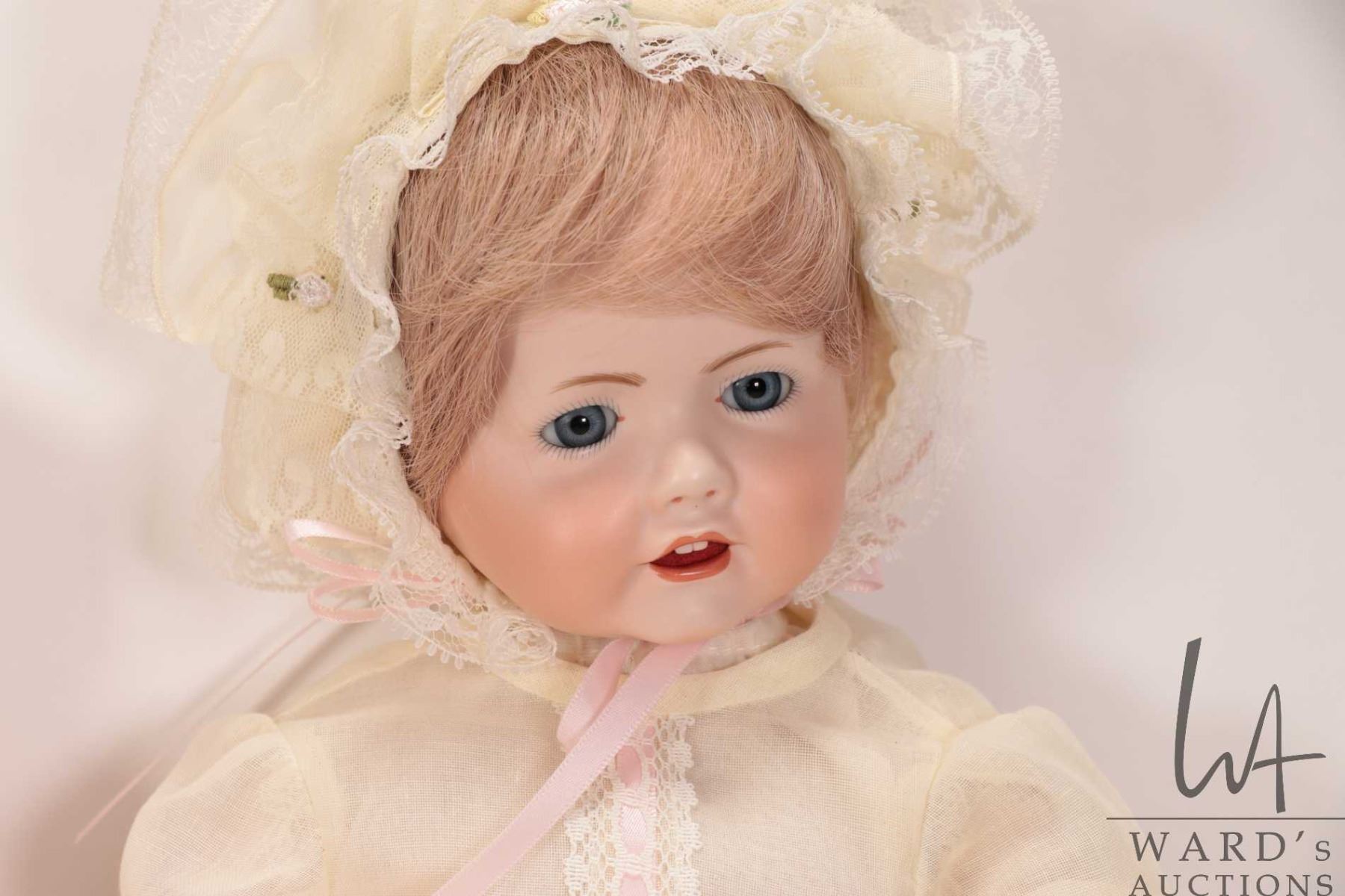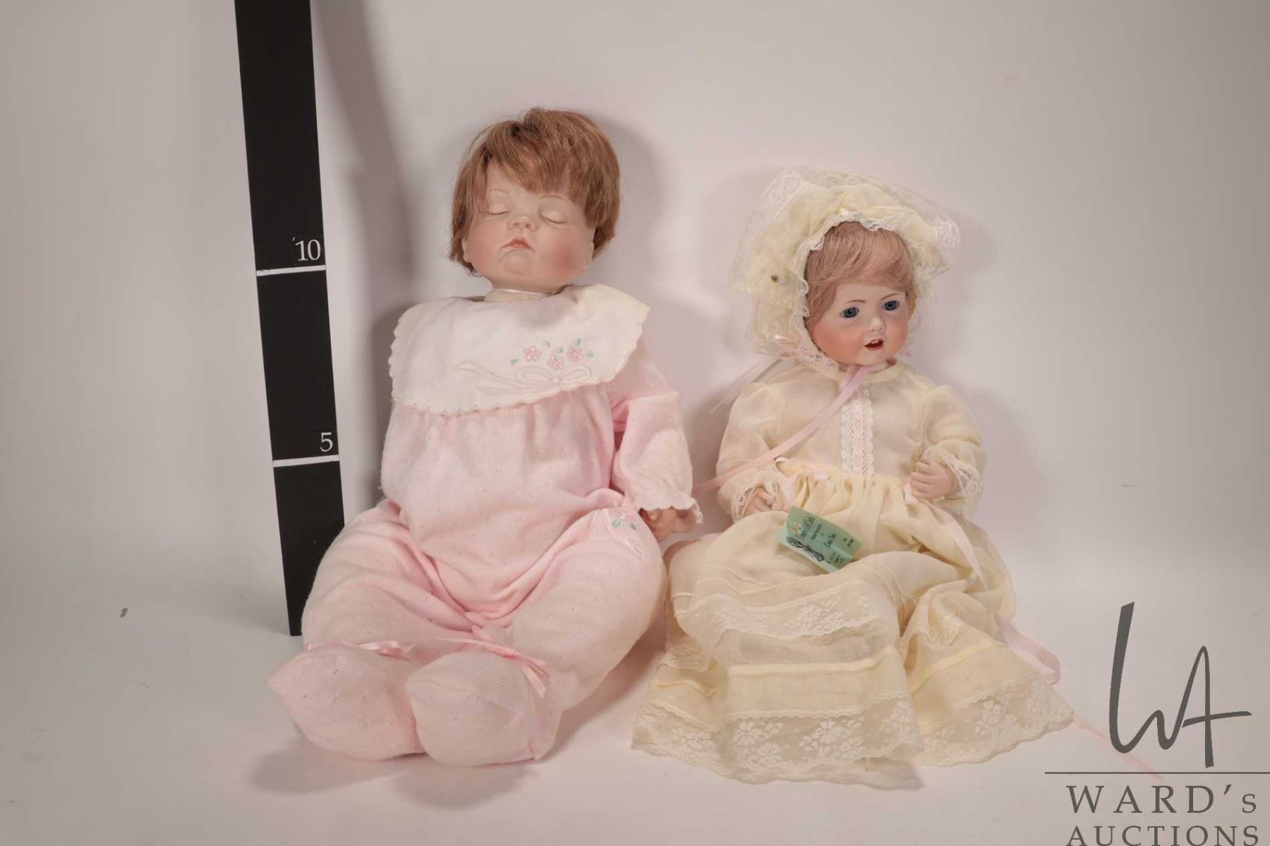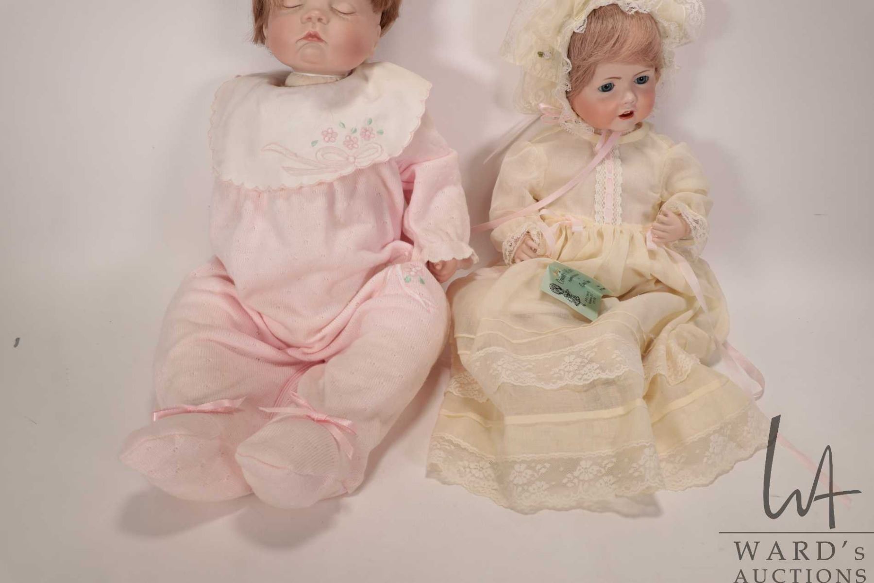 Two reproduction dolls including all-bisque artisan made Hilda doll with glass eyes and handmade cos