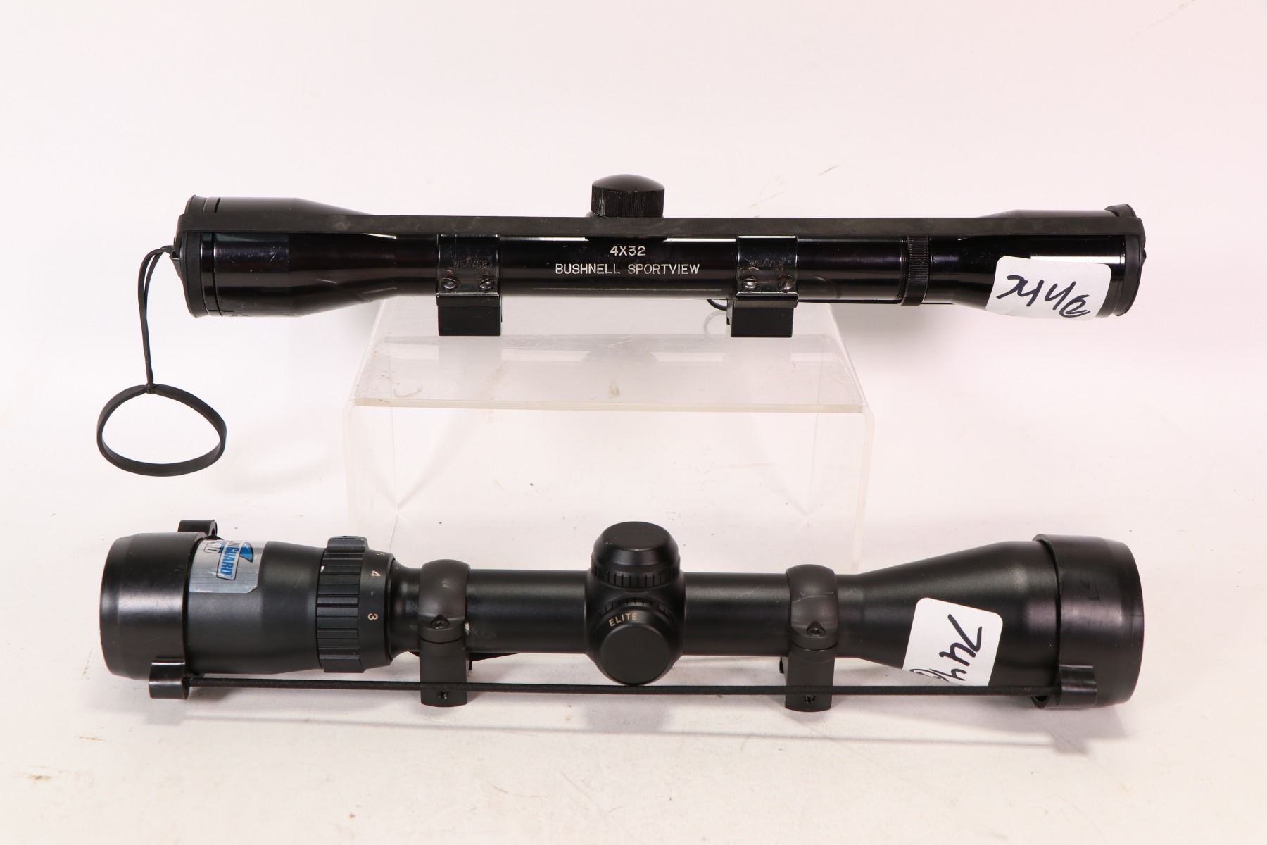 Two rifle scopes including Bushnell Elite 3-10X40 and a Bushnell Sportview 3X32, both with dust covers.
