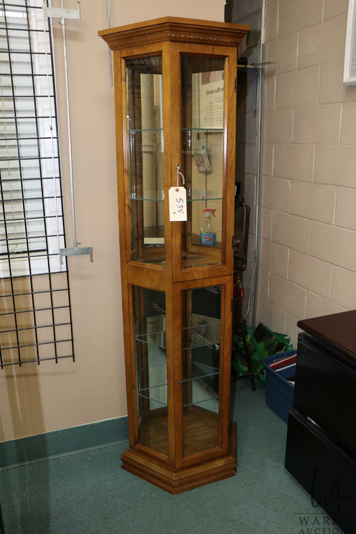 Two semi contemporary flat-to-wall illuminated three sided display cabinets, each 72" in height