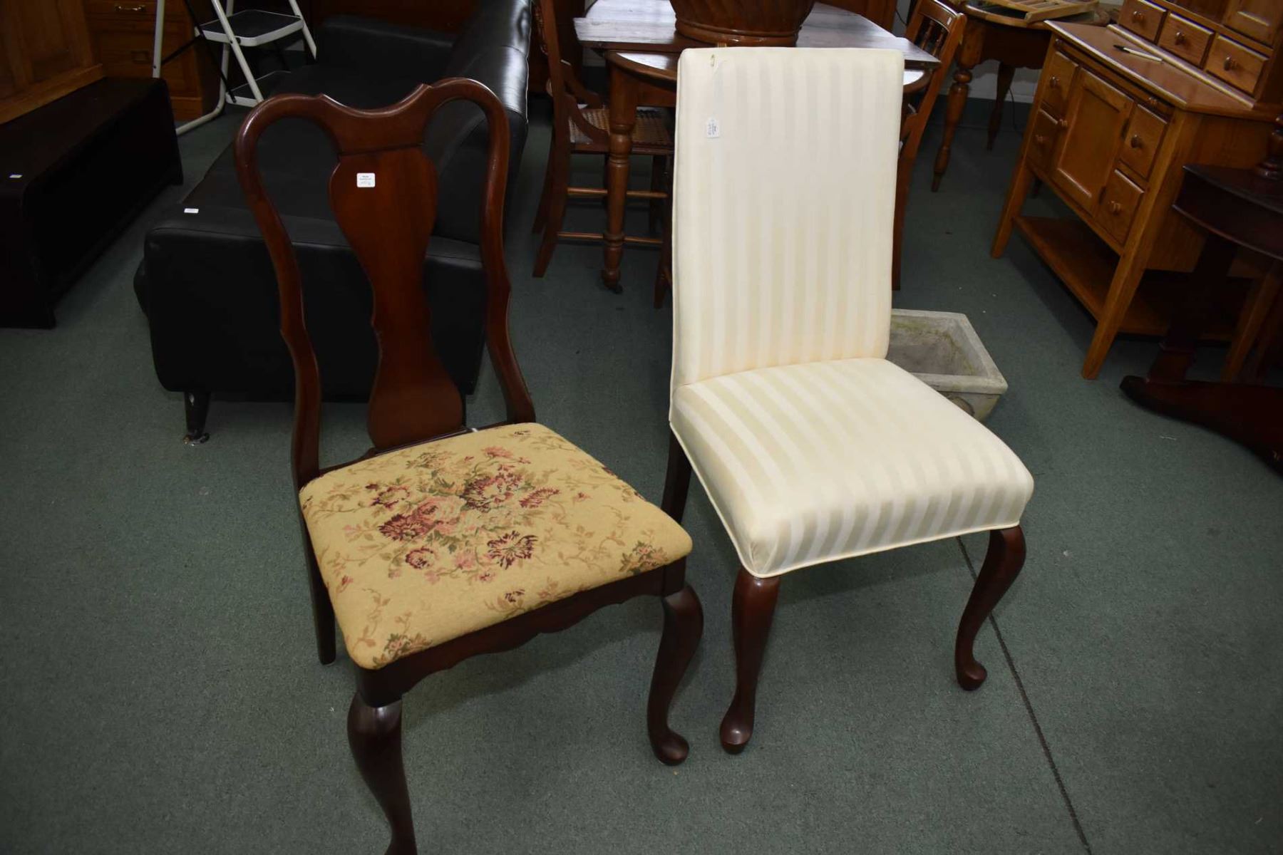 Two semi contemporary side chairs, one with fully upholstered back and seat made by Gibbard, the other with tapestry upholstered seat made by FDY, both on tall cabriole supports