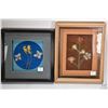 Two shadowbox framed moose tuftings including flowers on round velvet 11" X 9" overall dimensions and a 10" X 10" on blue velvet