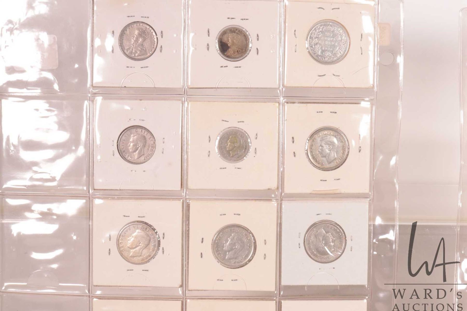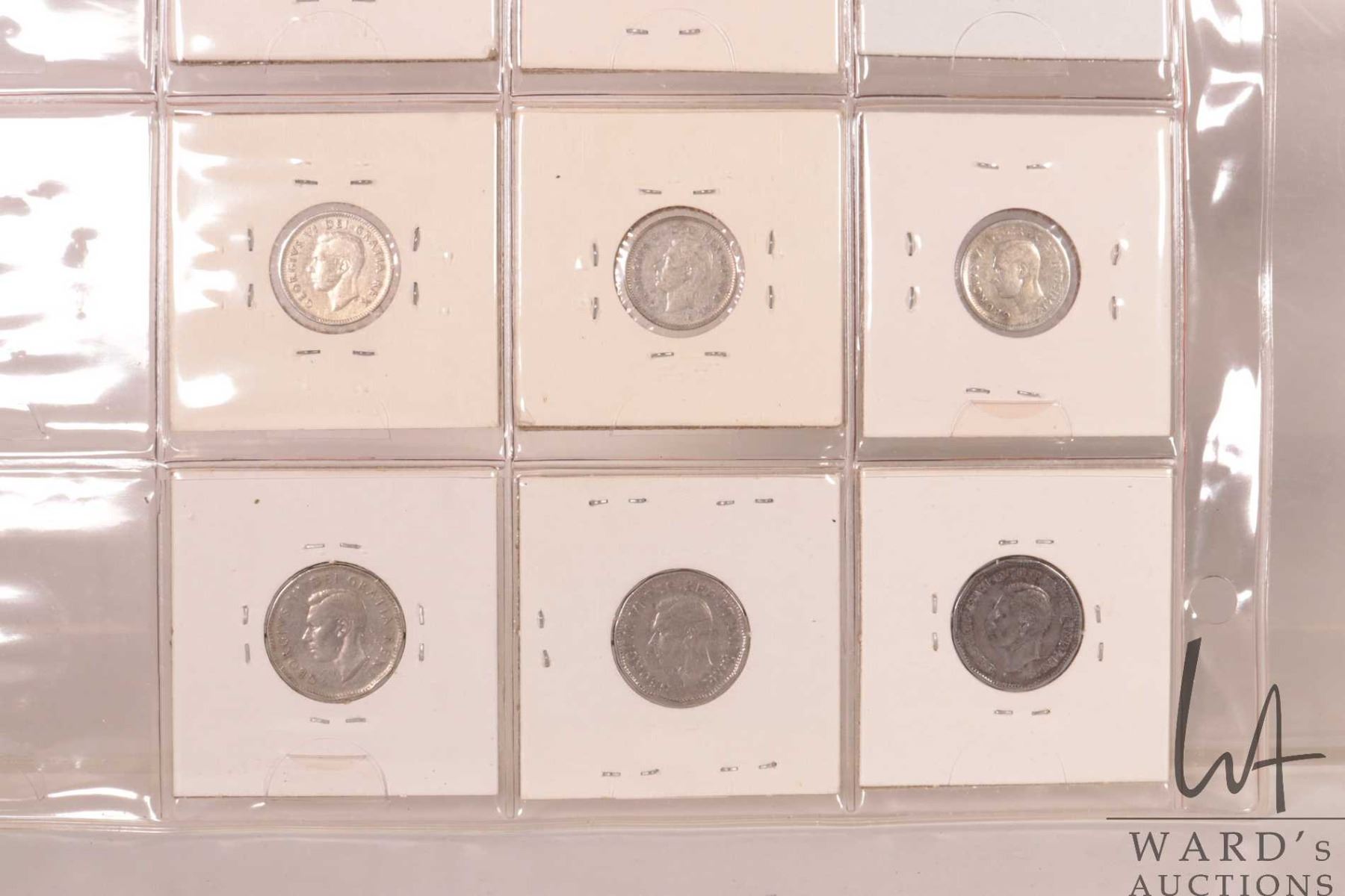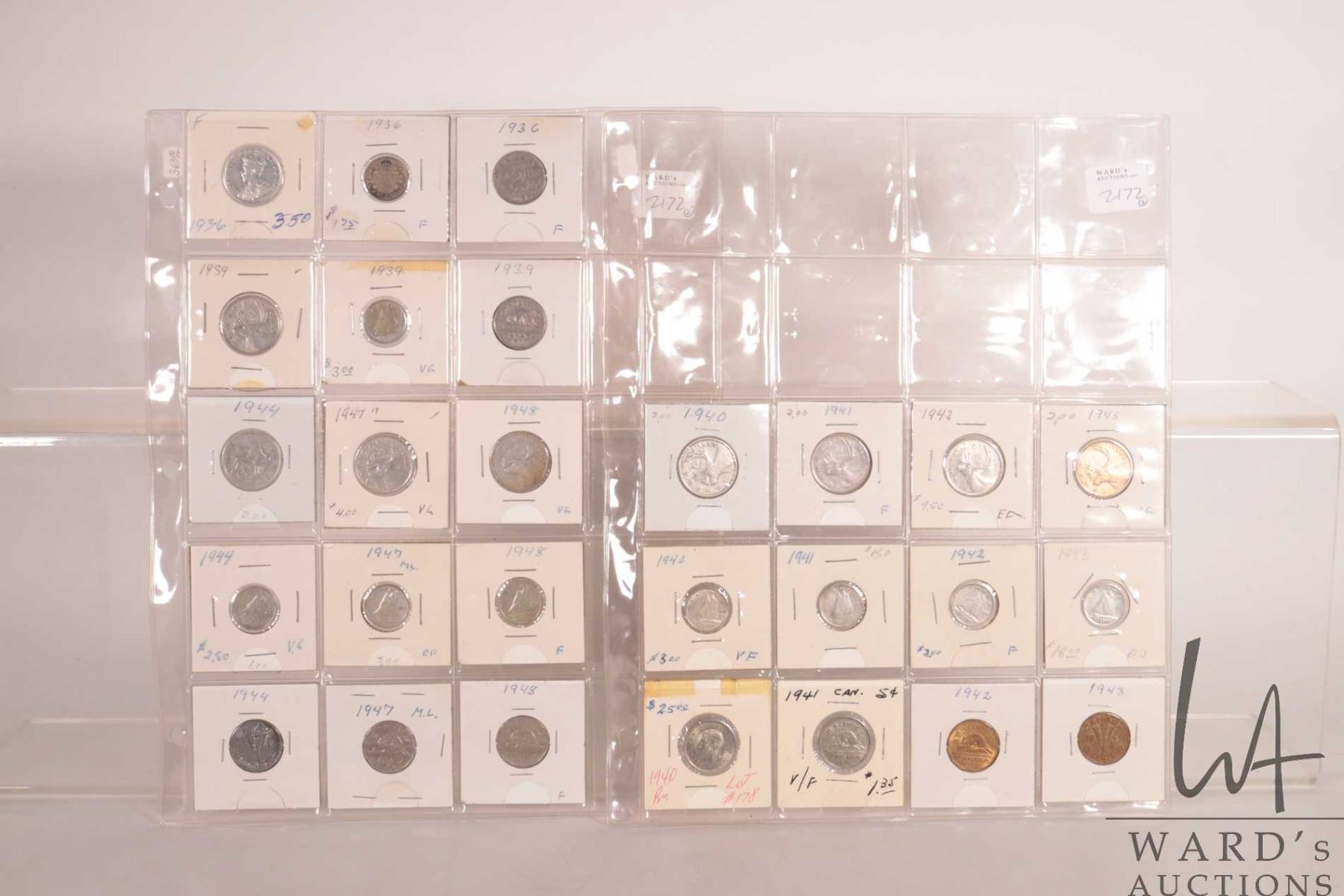 Two sheets of Canadian coins including nickel, dime and quarters for the following years: 1936, 1939, 1940, 1941, 1942, 1943, 1944, 1947 and 1948