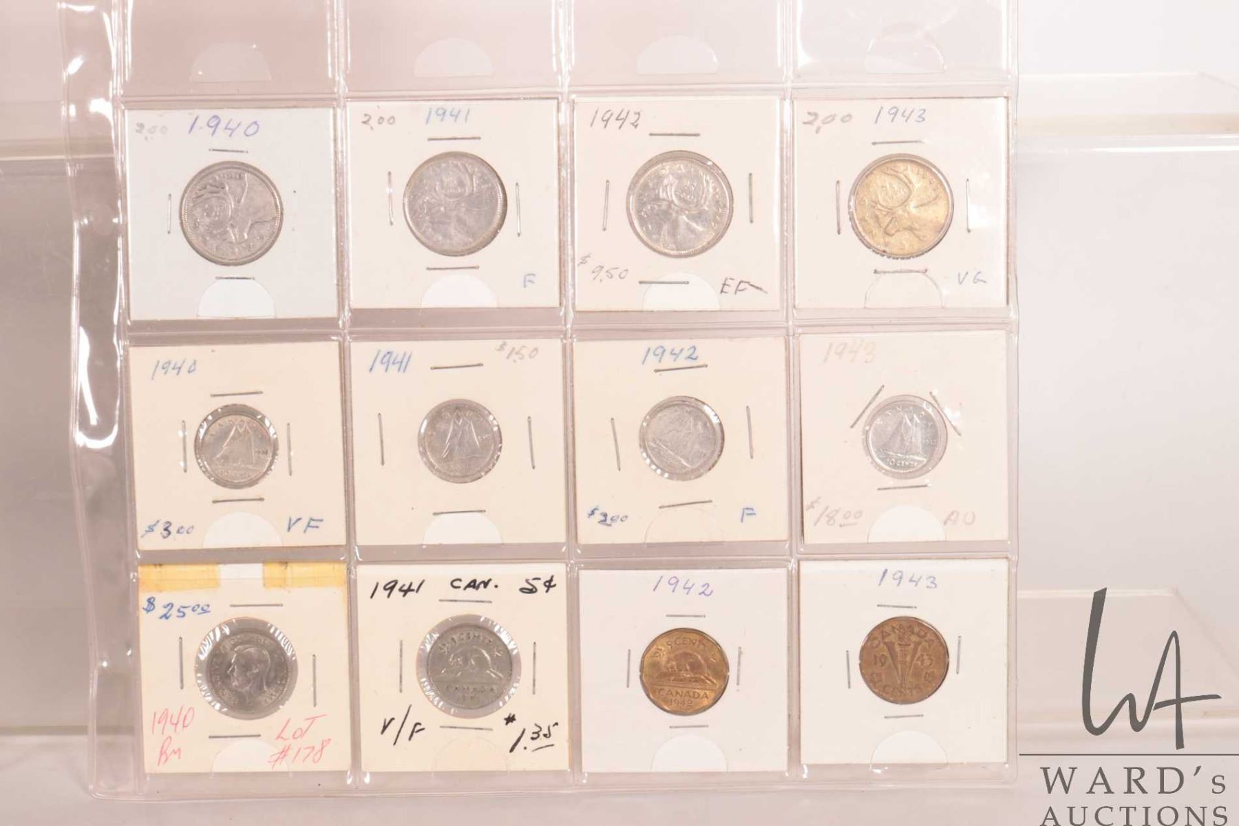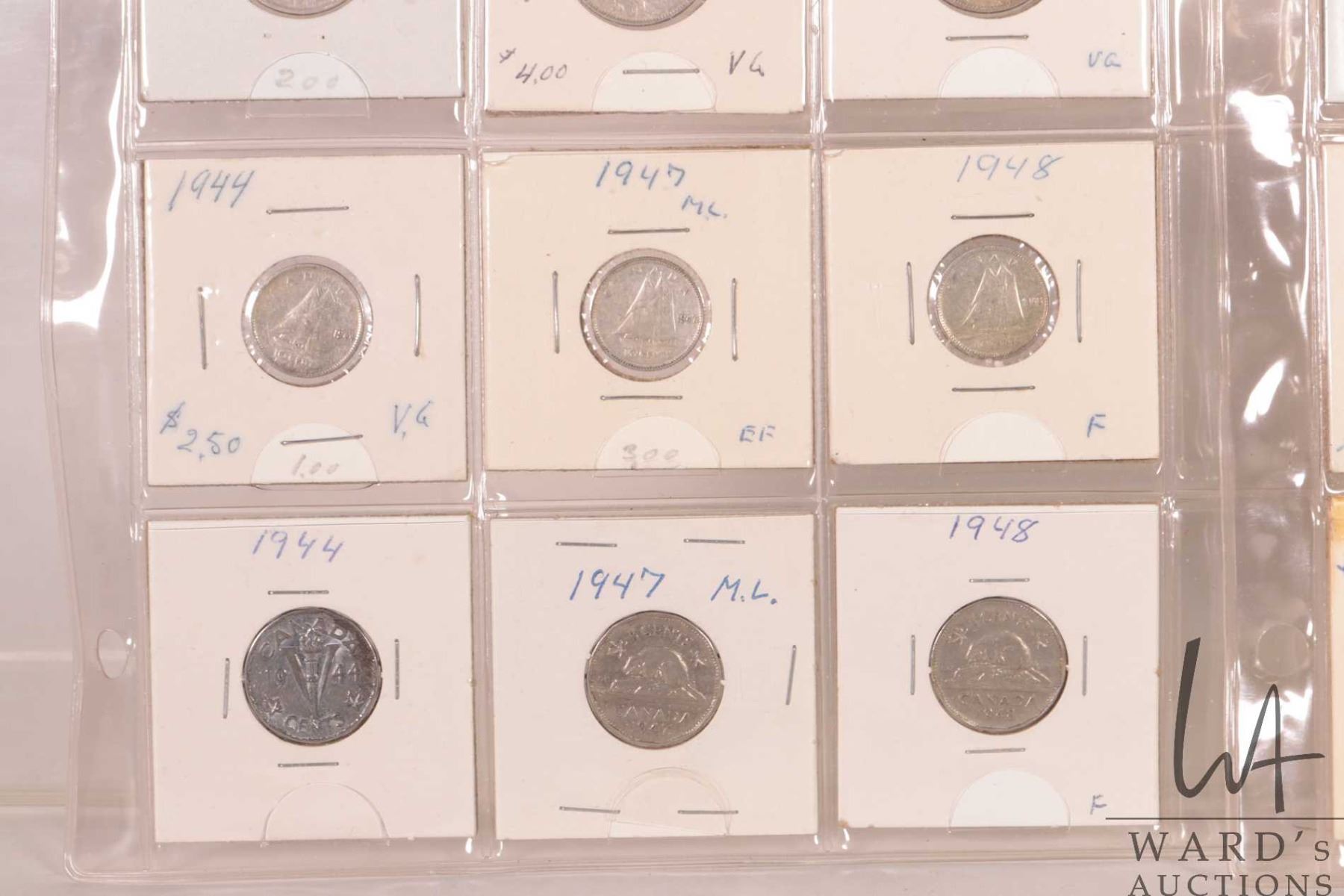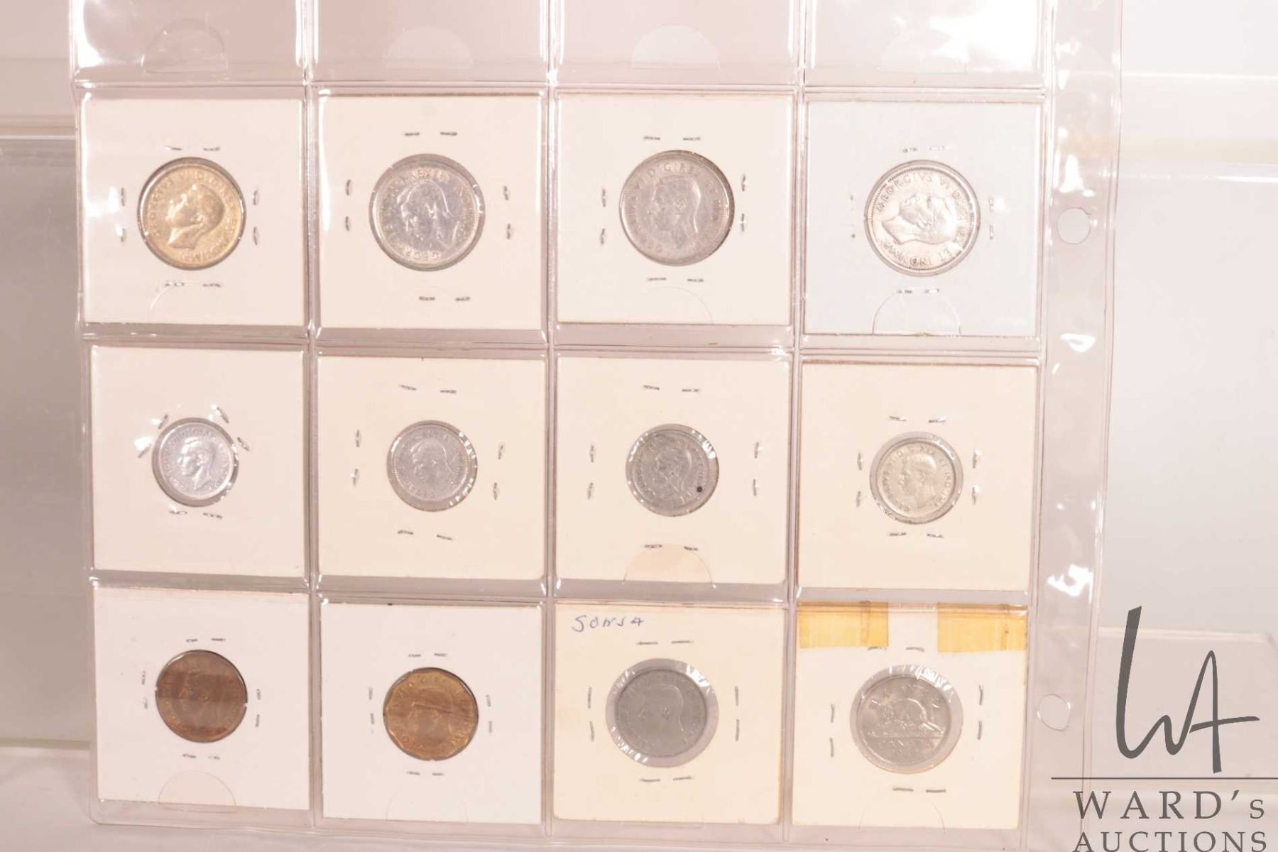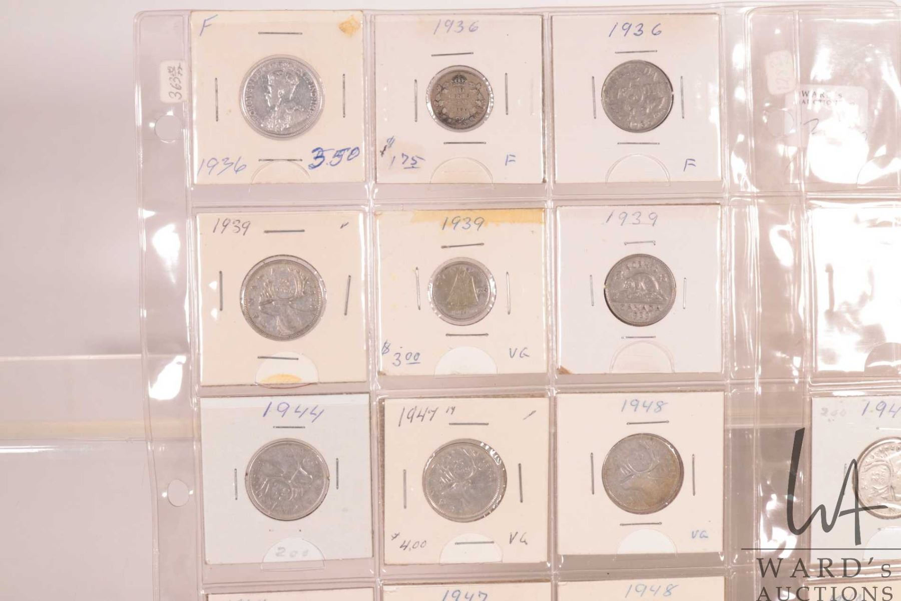 Two sheets of Canadian coins including nickel, dime and quarters for the following years: 1936, 1939, 1940, 1941, 1942, 1943, 1944, 1947 and 1948