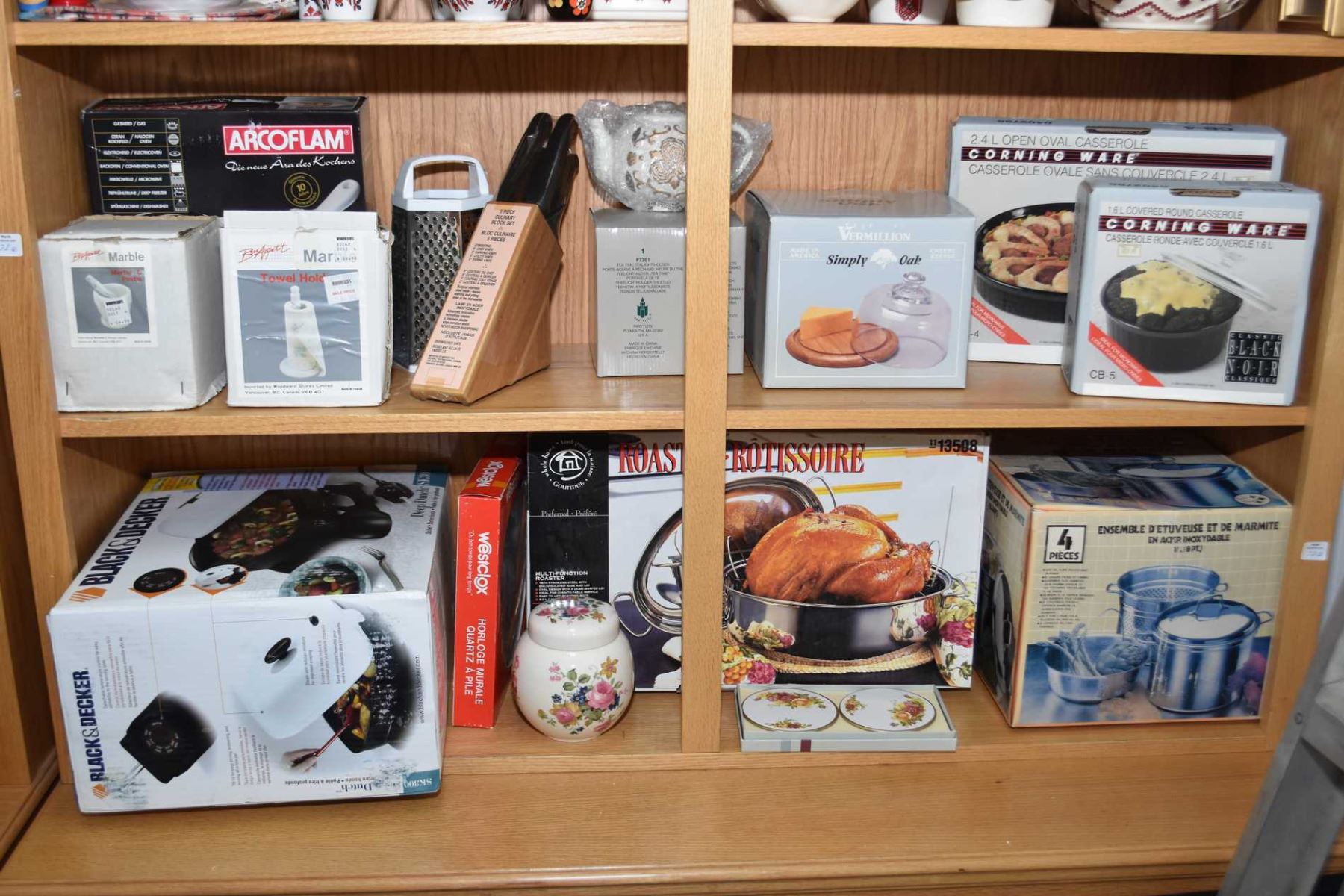 This item is not available for shipping. Local pickup only. Two shelf lots of brand new kitchen items including Black & Decker Deep dish skillet, lidded turkey roasting pan, large stock pot with steamer baskets, Corningware casserole dishes, lidded cheese keep, marble mortar and pestle, marble towel holder, Arcoflam oven to tableware etc.