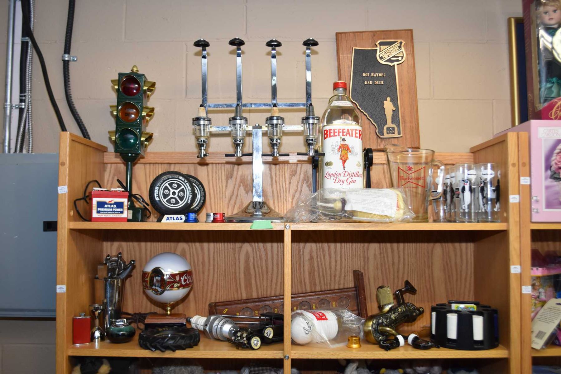 This item is not available for shipping. Local pickup only. Two shelf lots of collectible bar decor including bottle dispenser, stop light and Coor's lamps, tire radios, Texas Mickey of Beef Eater's Dry Gin, poker chips etc.
