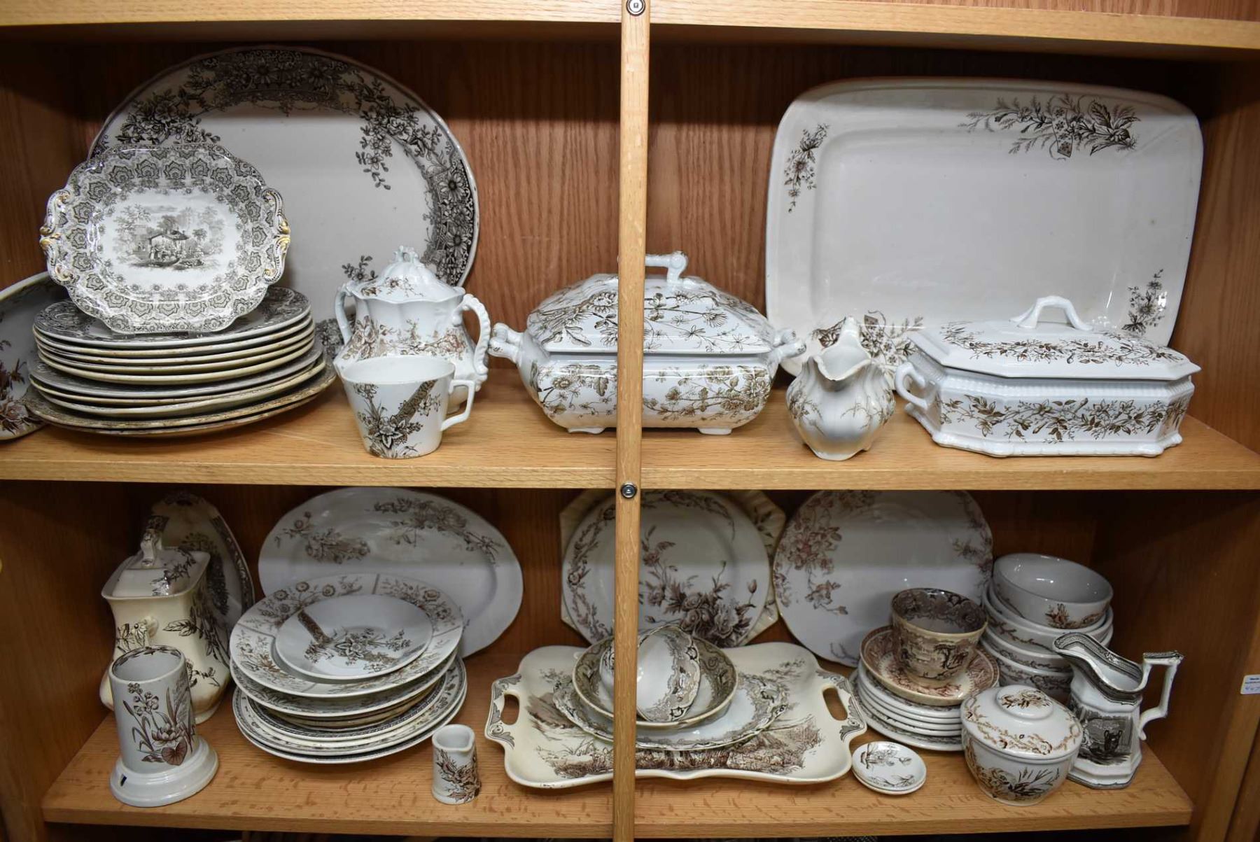 Two shelf lots of vintage brown transfer ware including plates, cups, serving dishes, platters Tunst