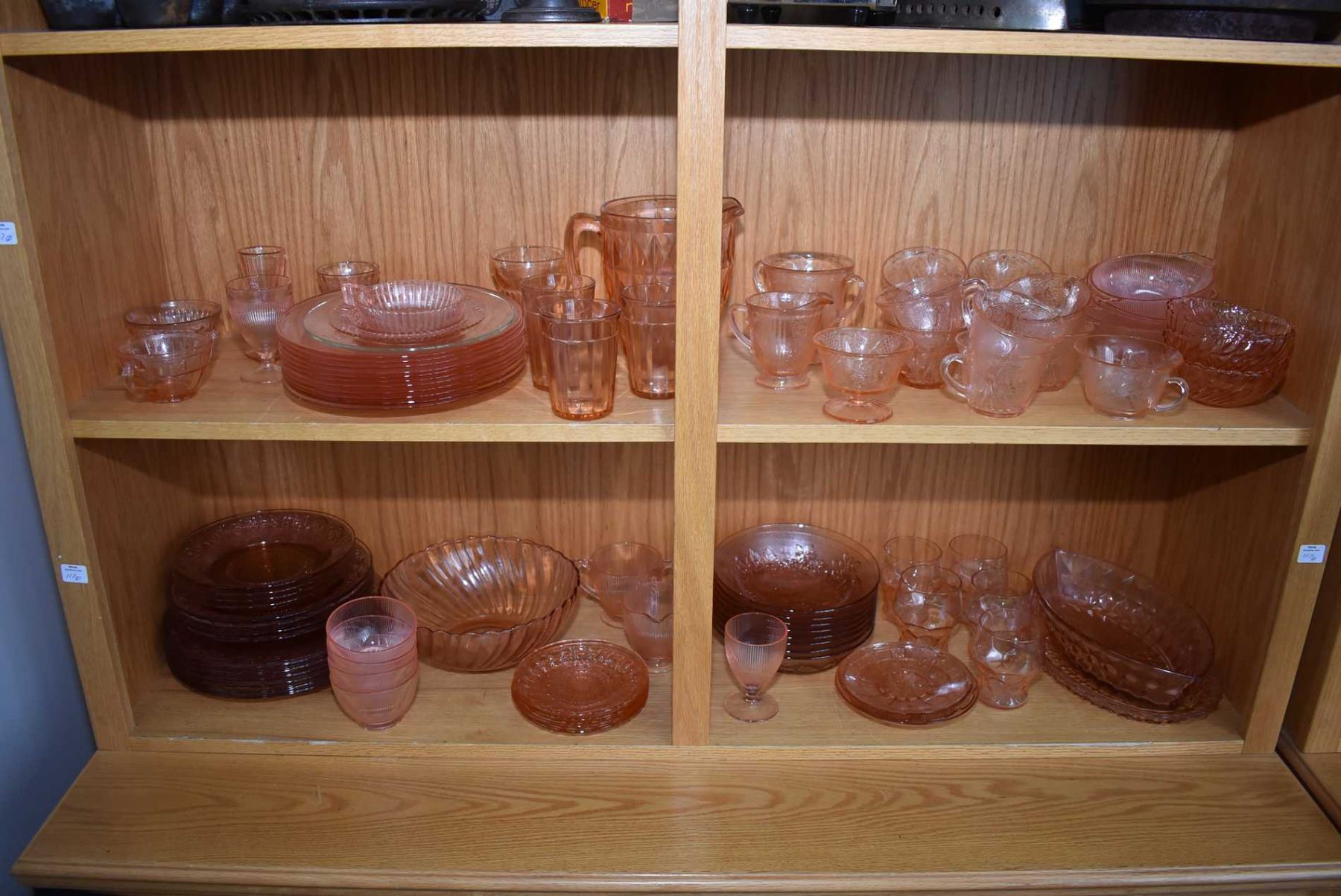 Two shelf lots of vintage pink Depression glass including eight cereal bowls, six dinner plates, four each of luncheon and side plates, pitcher with three matching tumblers, ten matching teacups, two sets of four each fruit nappies, two sets of creamers with open sugar bowl, serving bowl and platter etc. Not available for shipping. Local pickup only