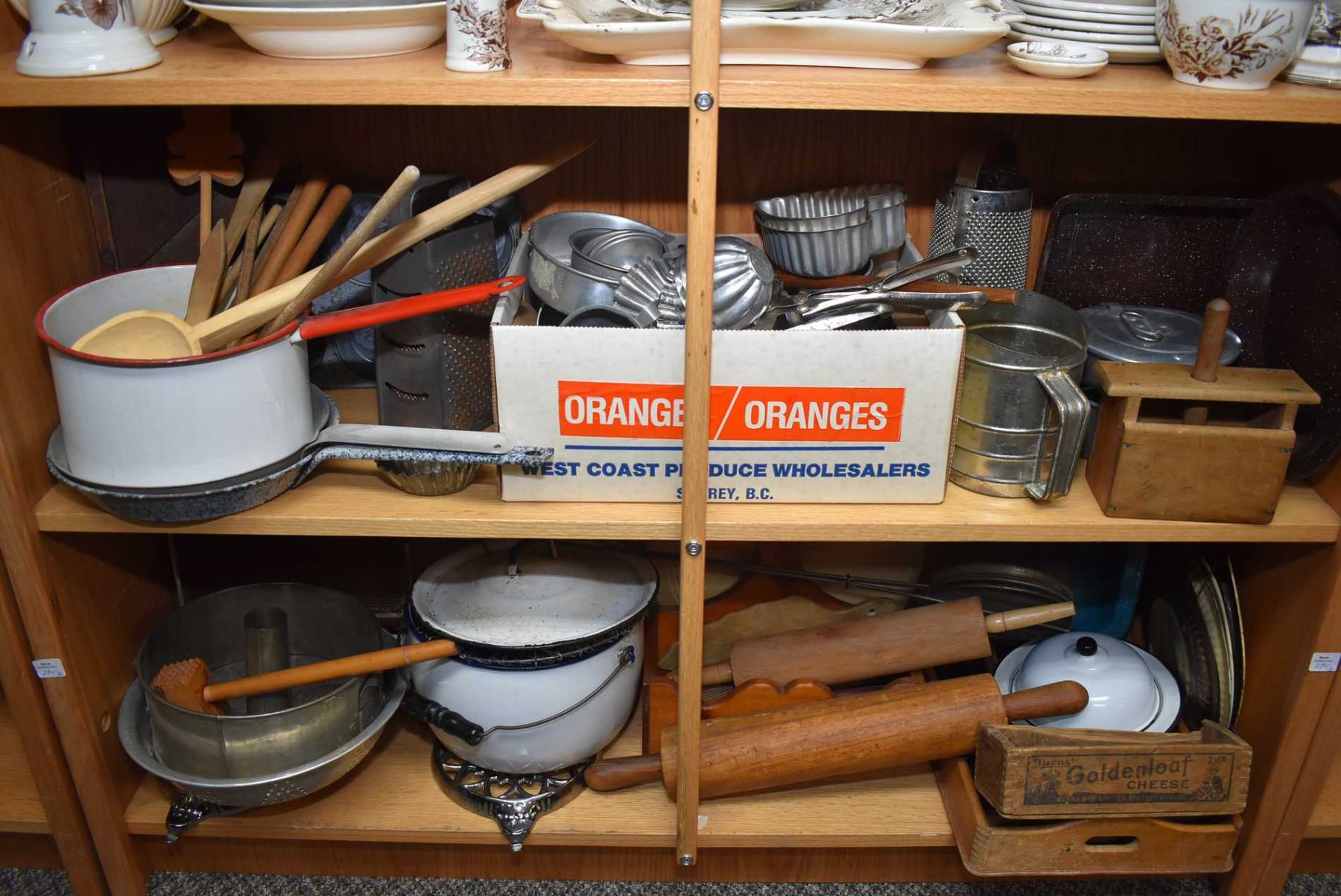 Two shelves of collectibles of primitive kitchenware including enamel, butter pats, rolling pins, bo