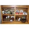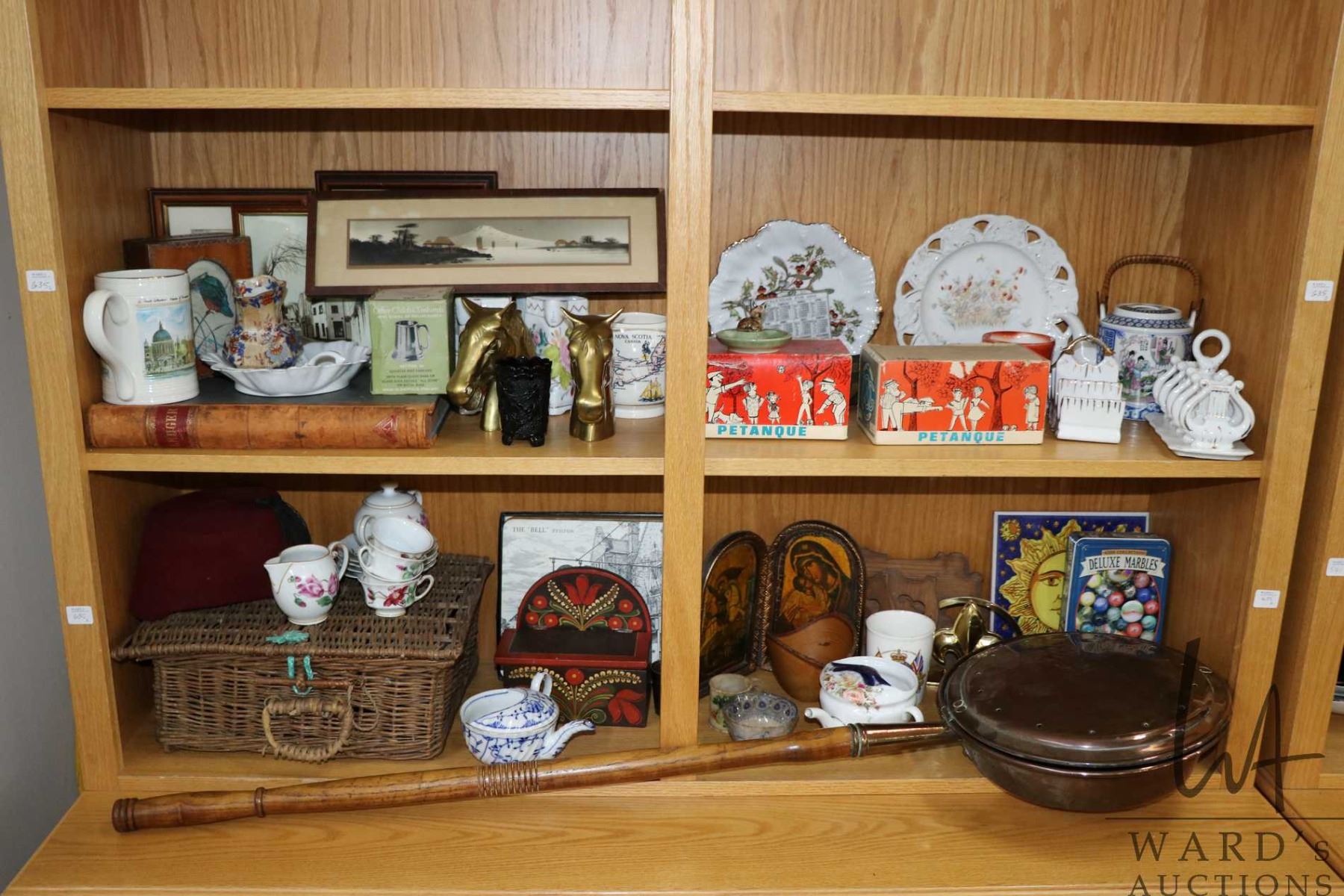 Two shelves of vintage collectibles including pair of brass horse heads, copper bed warmer, two boxed lawn bowling sets, salt box, vintage basket, assorted china plates etc. Note: No shipping for this lot. Local pickup only