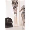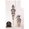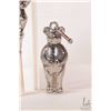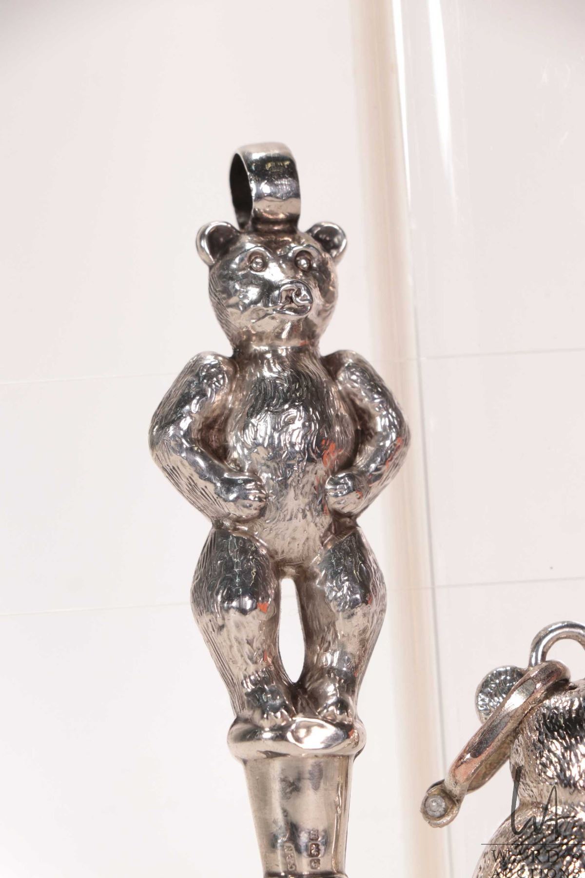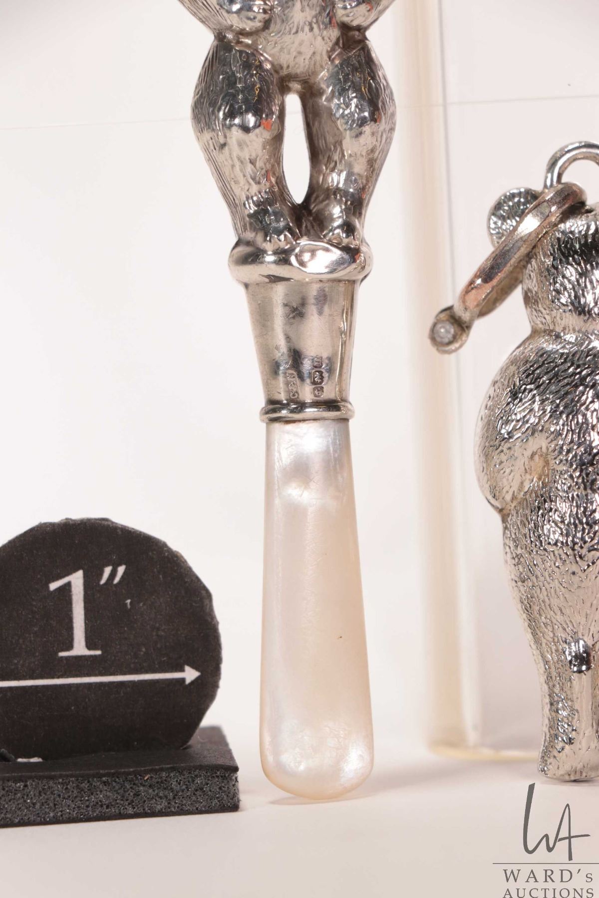 Two silver baby rattles including bear with mother-of-pearl gum soother with British sterling hallmarks and one unmarked bear