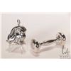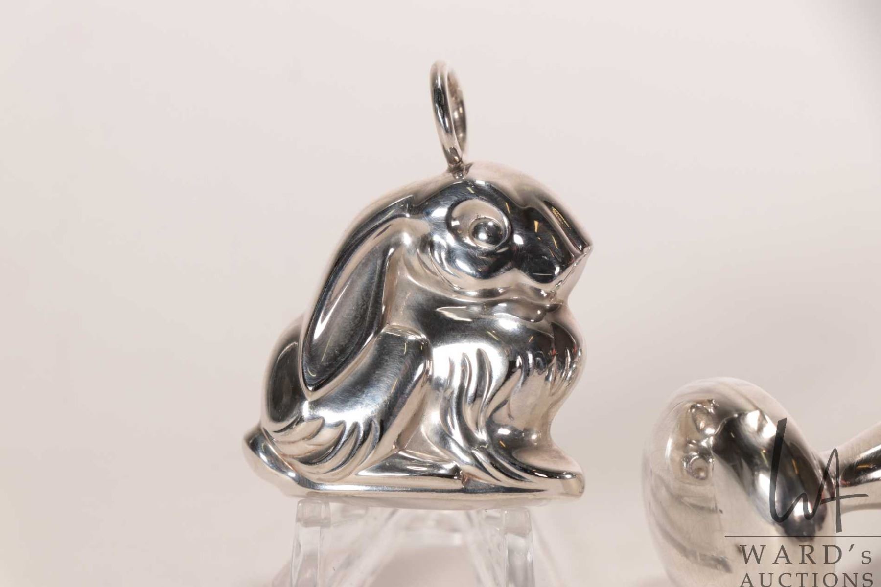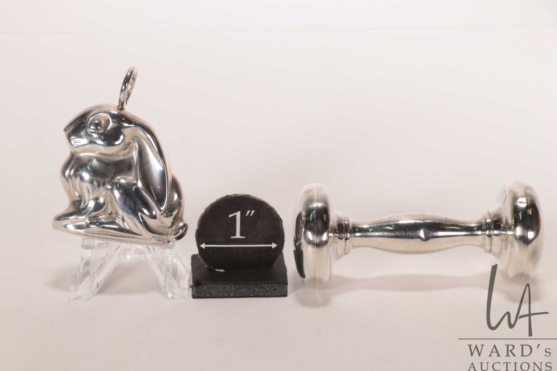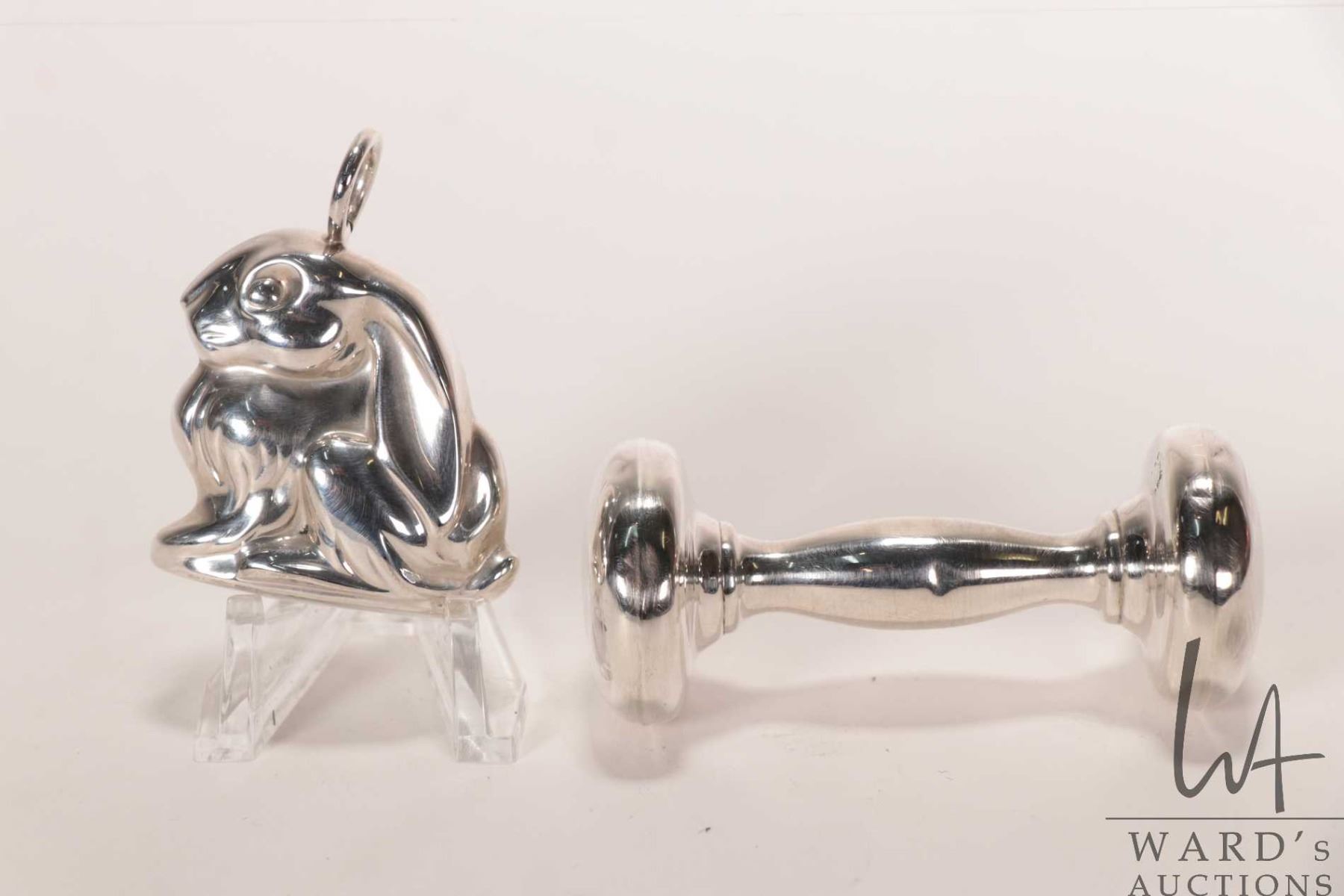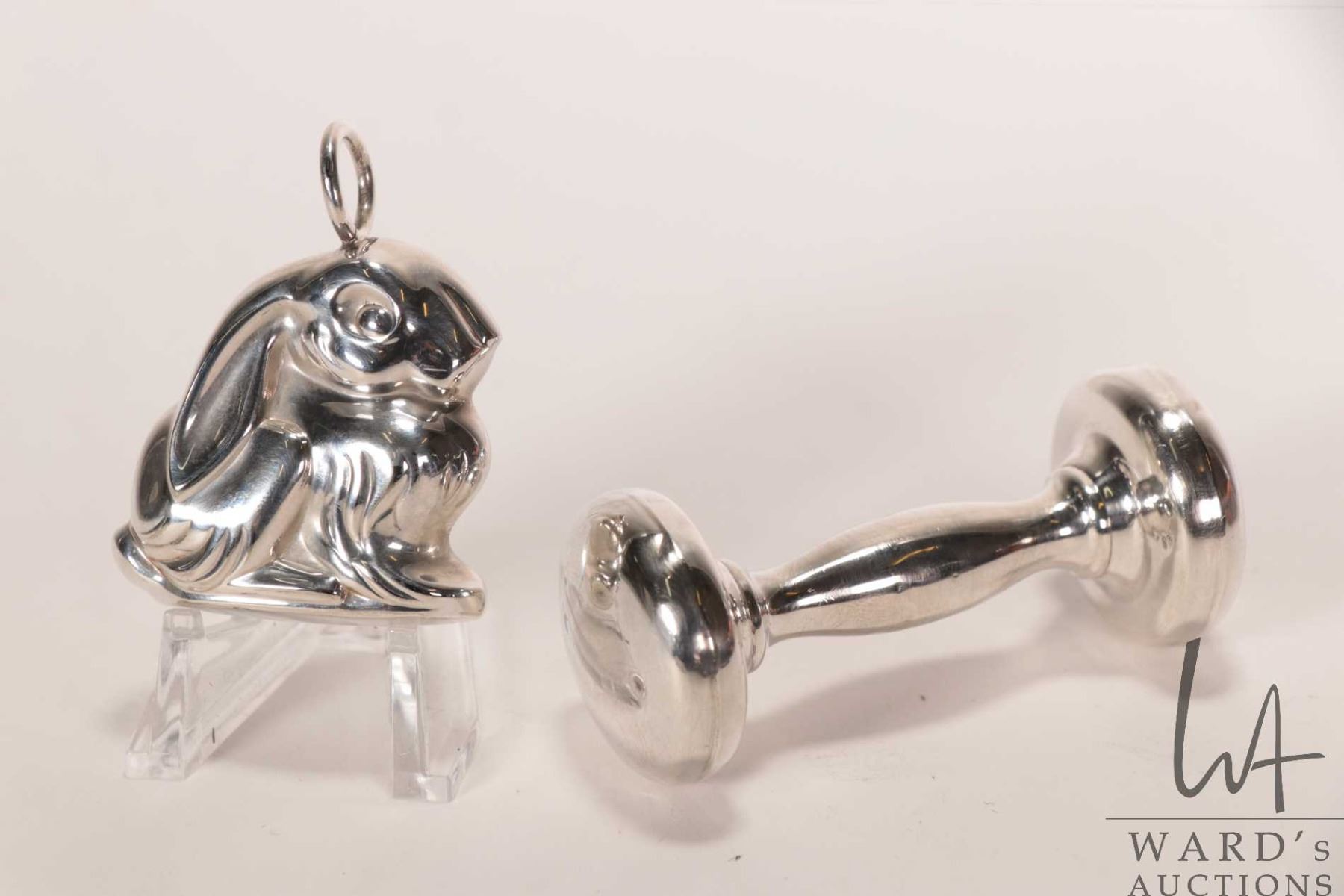 Two silver baby rattles including sterling silver bar bells and an unmarked silver rabbit