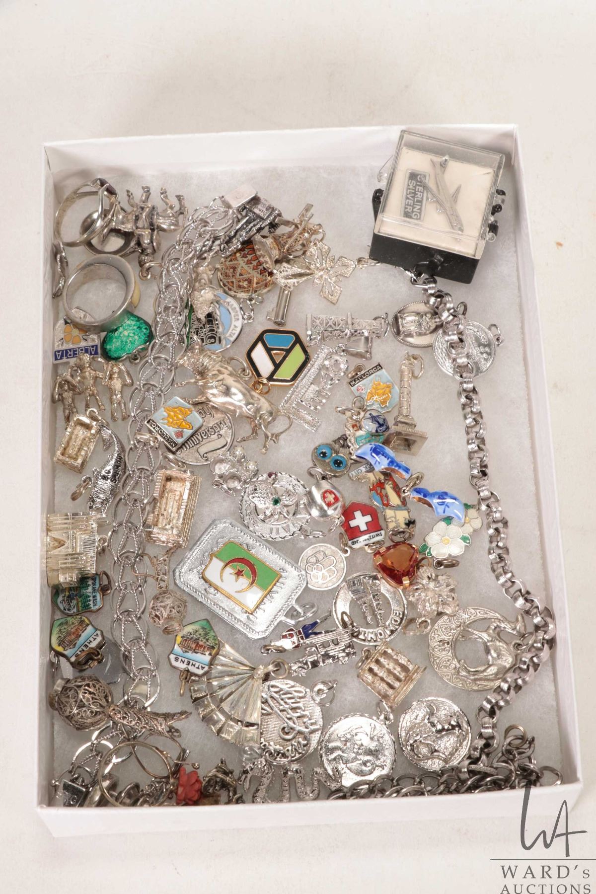 Two silver charms bracelets with a large selection of sterling and silver charms etc.