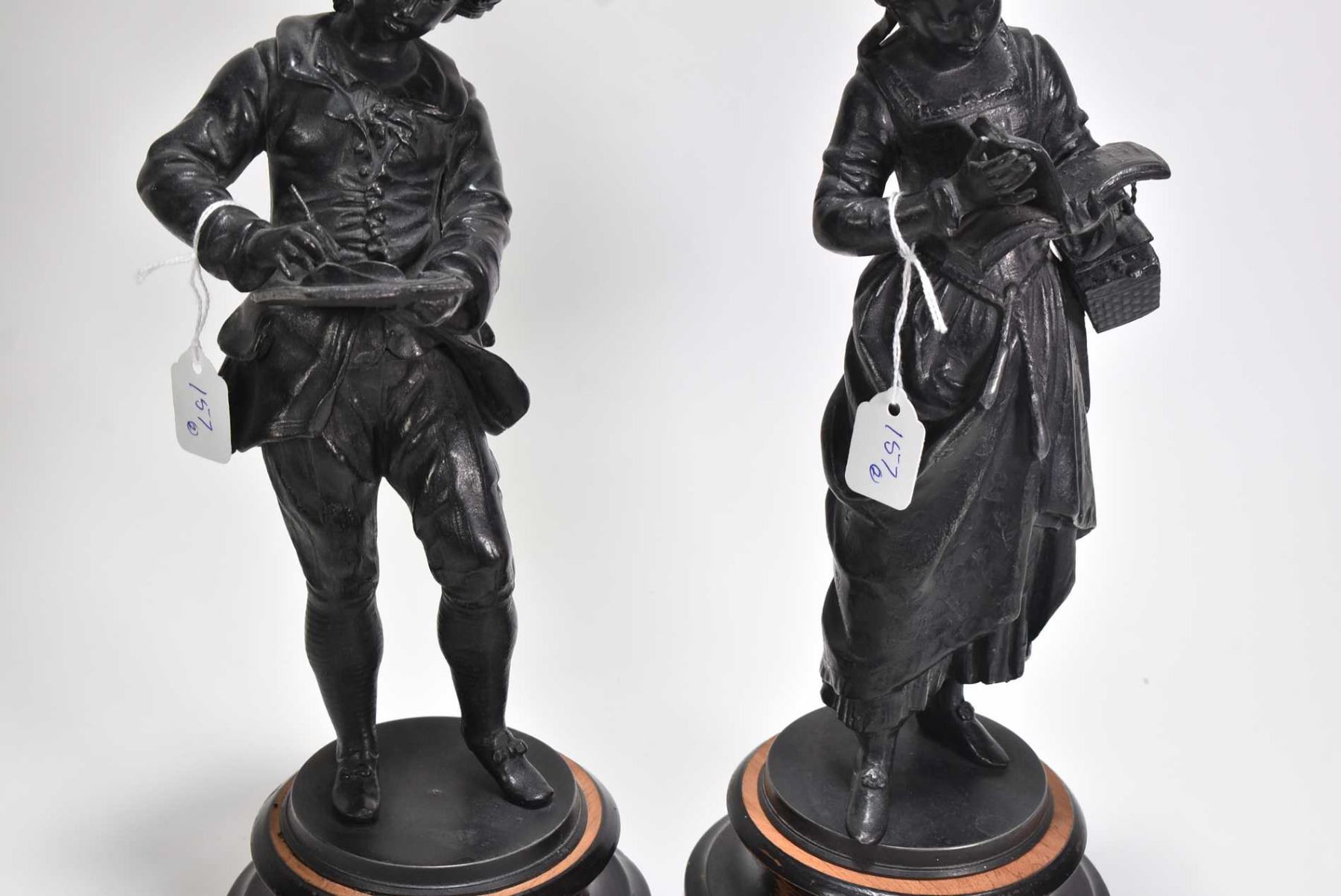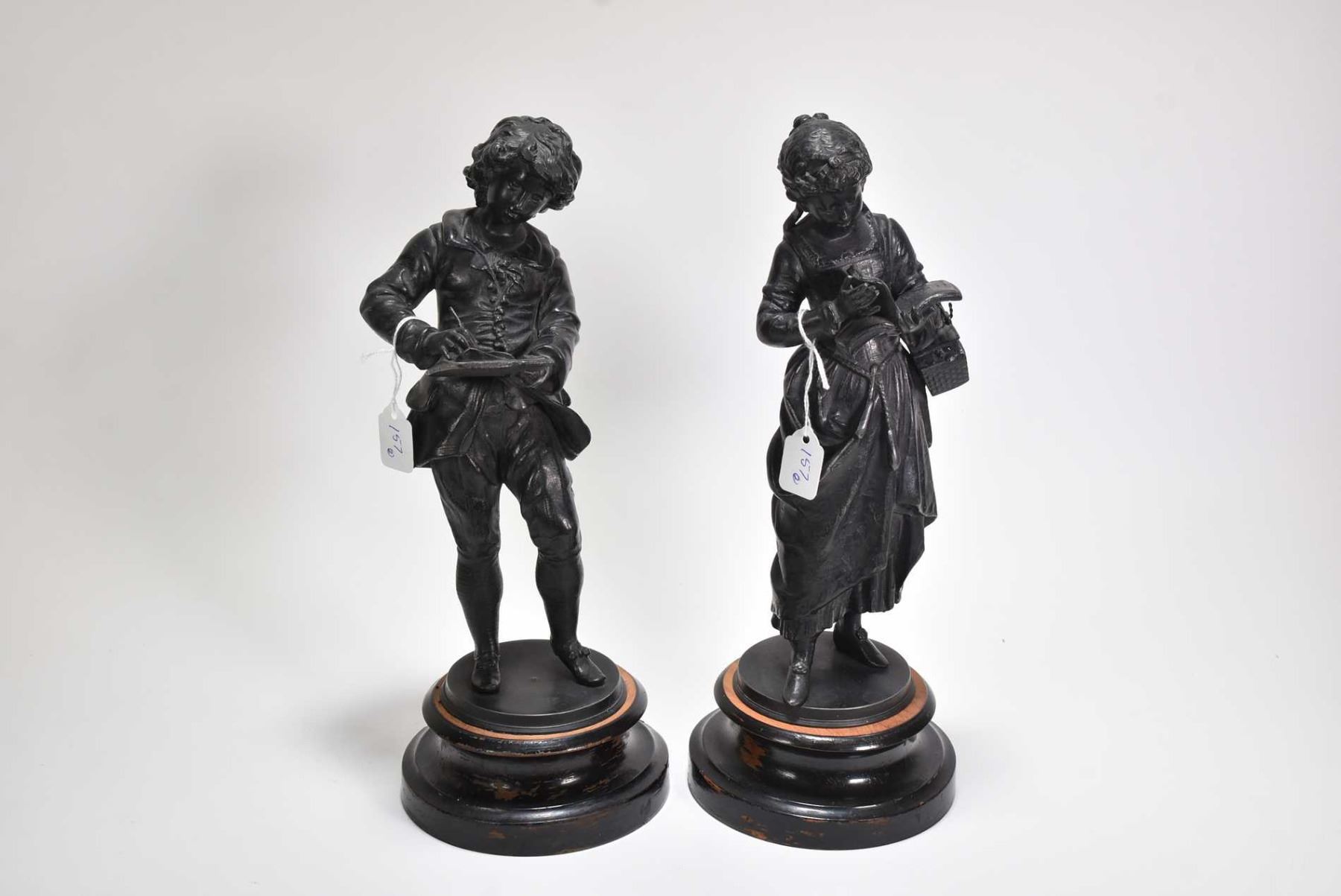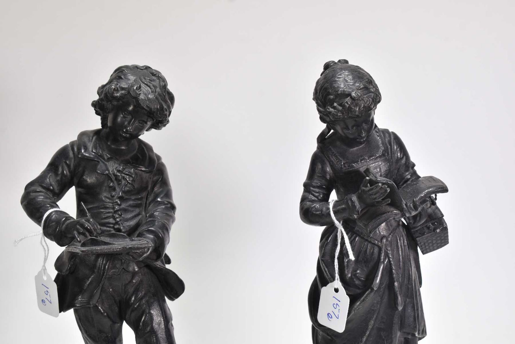 Two small cast statues including young man writing and young lady reading 13" in height including base