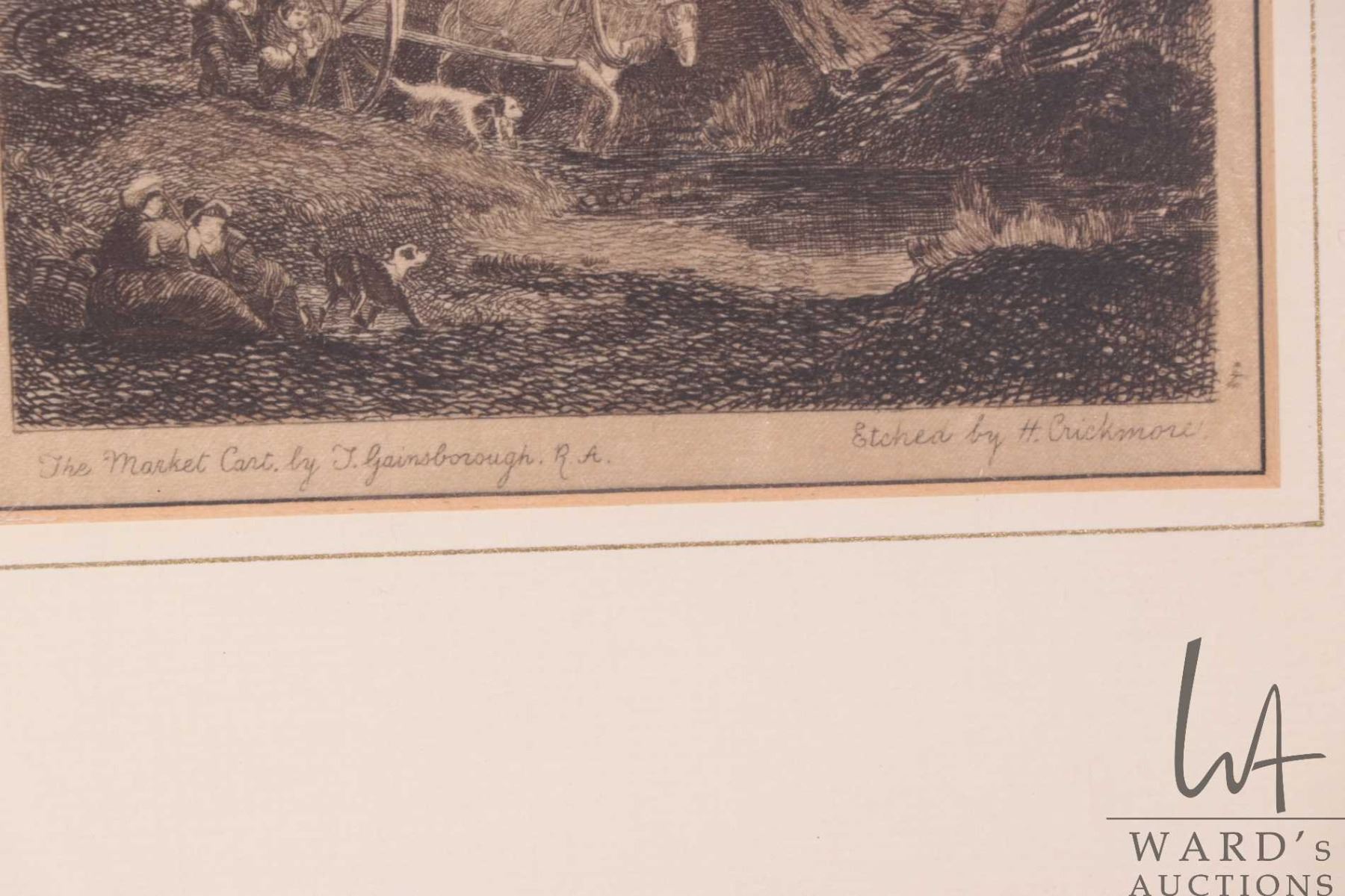 Two small framed etched prints on silk including "The Cornfield by J. Constable R.A" and "The Market Cart by T. Gainsborough, R.A" both by engraver H. Crickmore, each 11" X 9 1/4" including frames