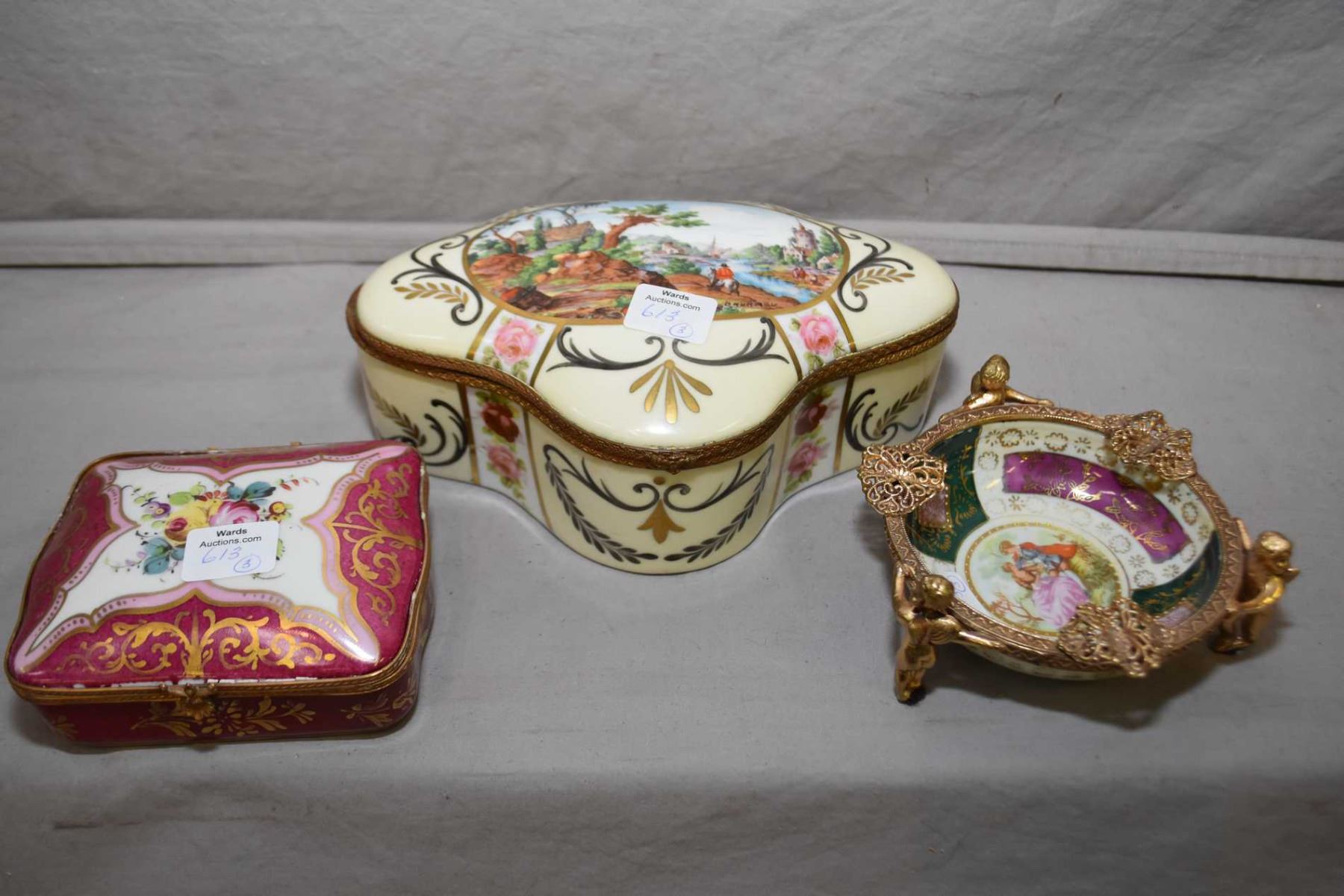 Two small hand enameled porcelain caskets and a Vienna style lovestory ashtray in ormalu galley