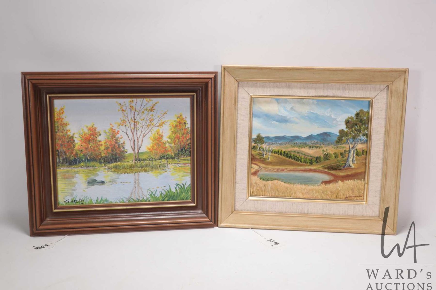 Two small original acrylic on board paintings including labeled on verso "Spring Run-Off- Sunnybrook Alta" by artist James O. McIntyre 1975, 8" X 10" and painting of the Kangaroo Island, Australia, by artist Nella Johnson, 8" X 10". Note: Artwork cannot be insured and is often too large to ship. Local pickup.