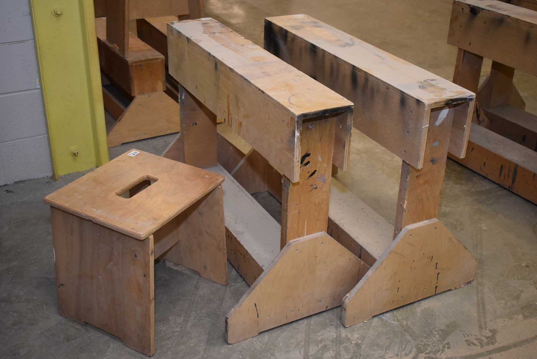 Two small sawhorses and a small wooden stool - . (Update for March 27th. This item will be stored at the Ward's Auctions until it can be picked up. Go to www.wardsauctions.com for details)