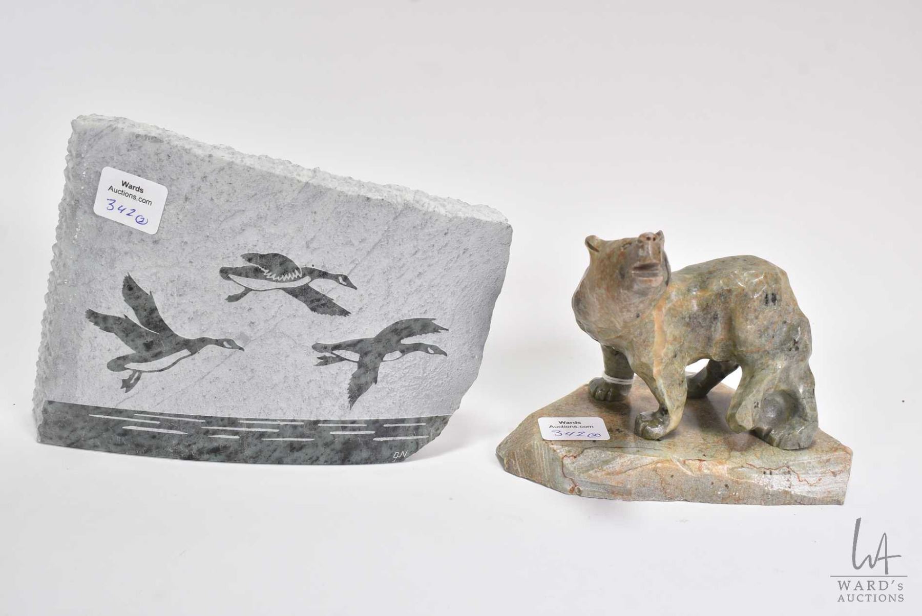 Two soap stone carvings including signed Ducks by artist G. Nason 5" X 7 1/2' and a green soaptone wolf, no signature seen